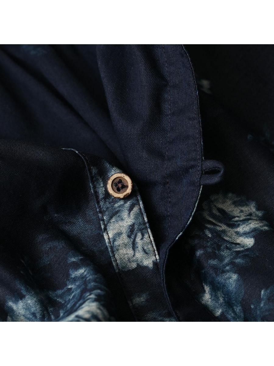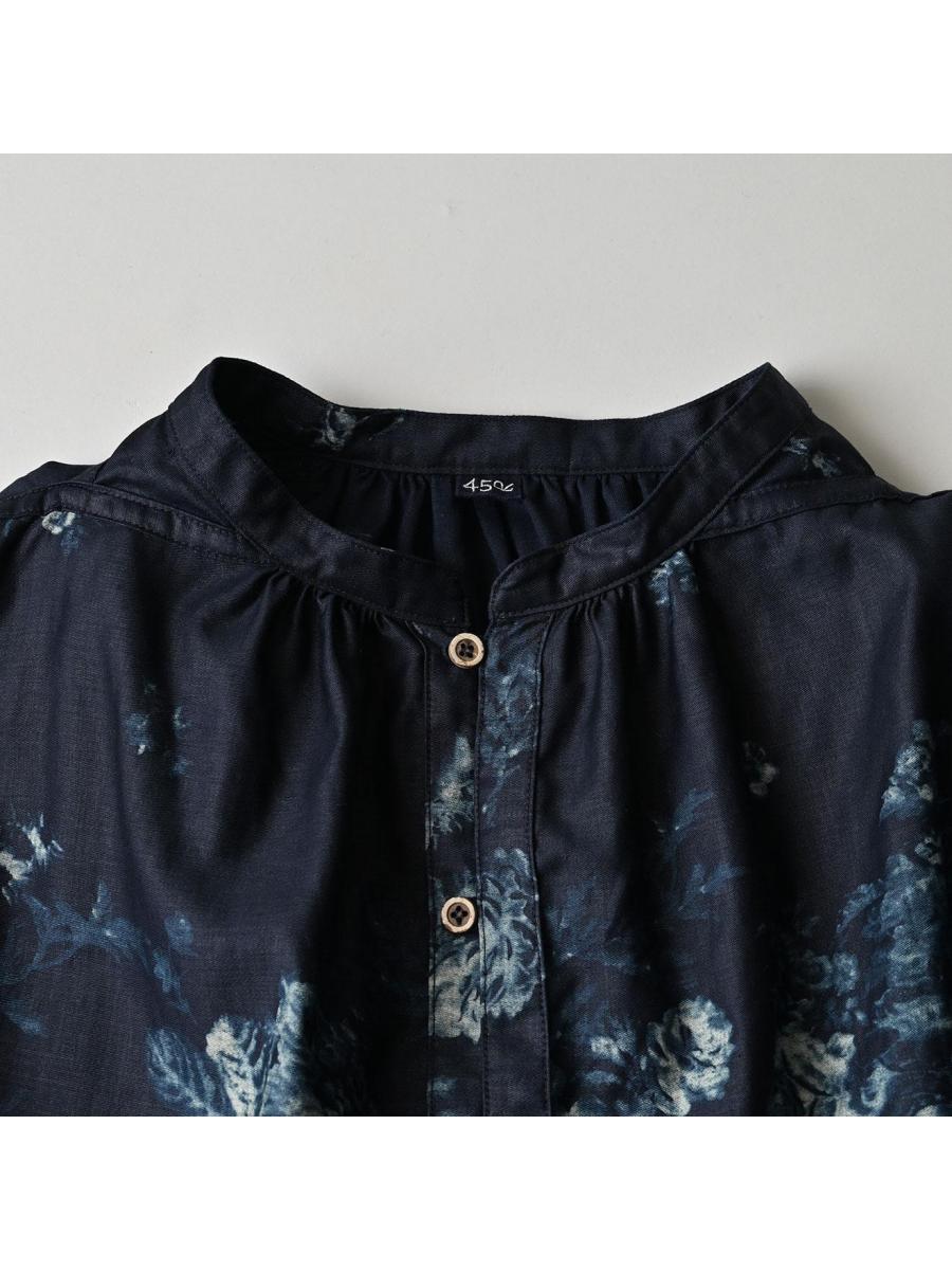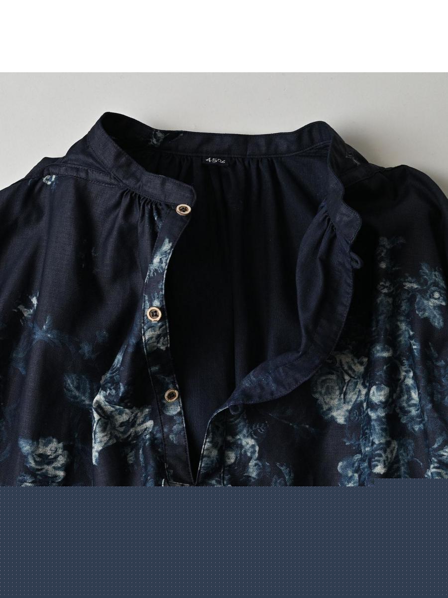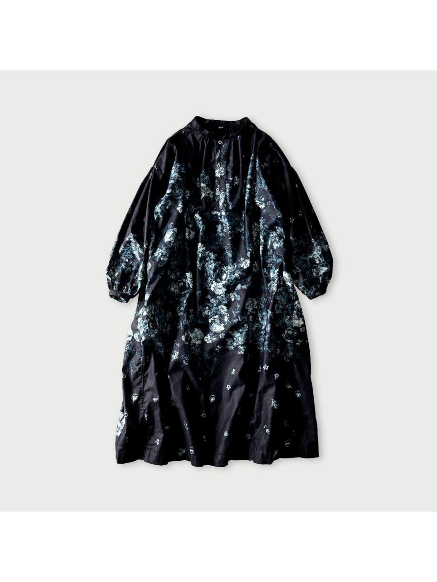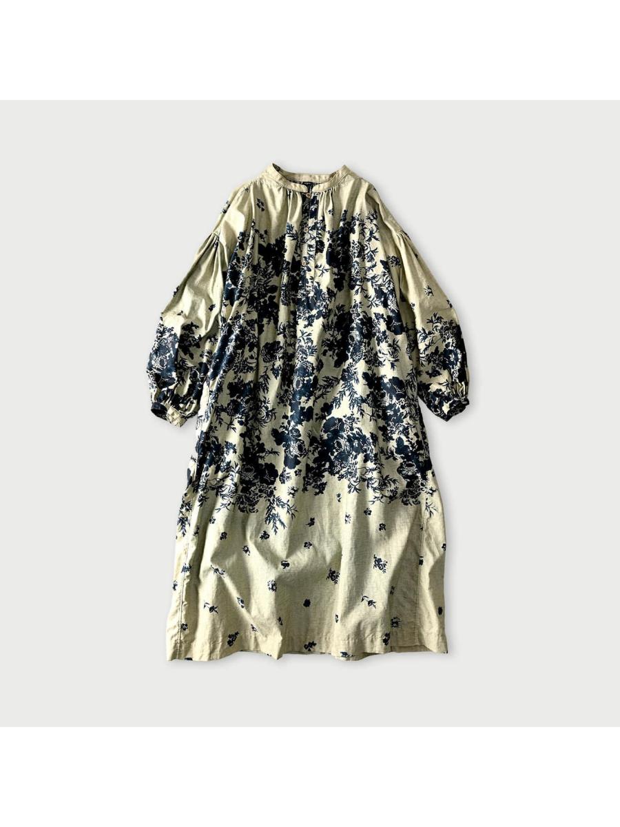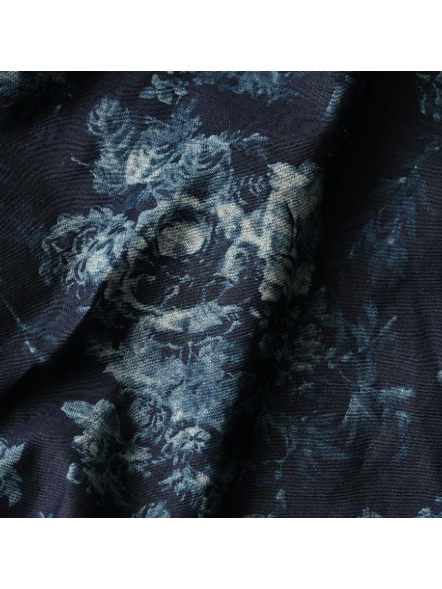 インディゴ抜染ローズプリントのスモックドレス
