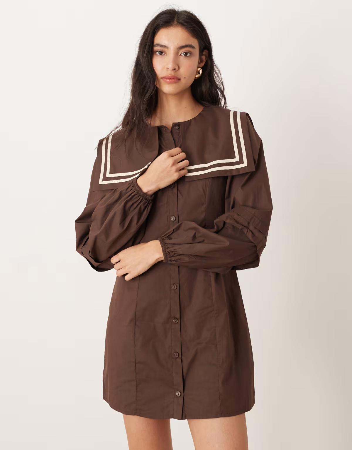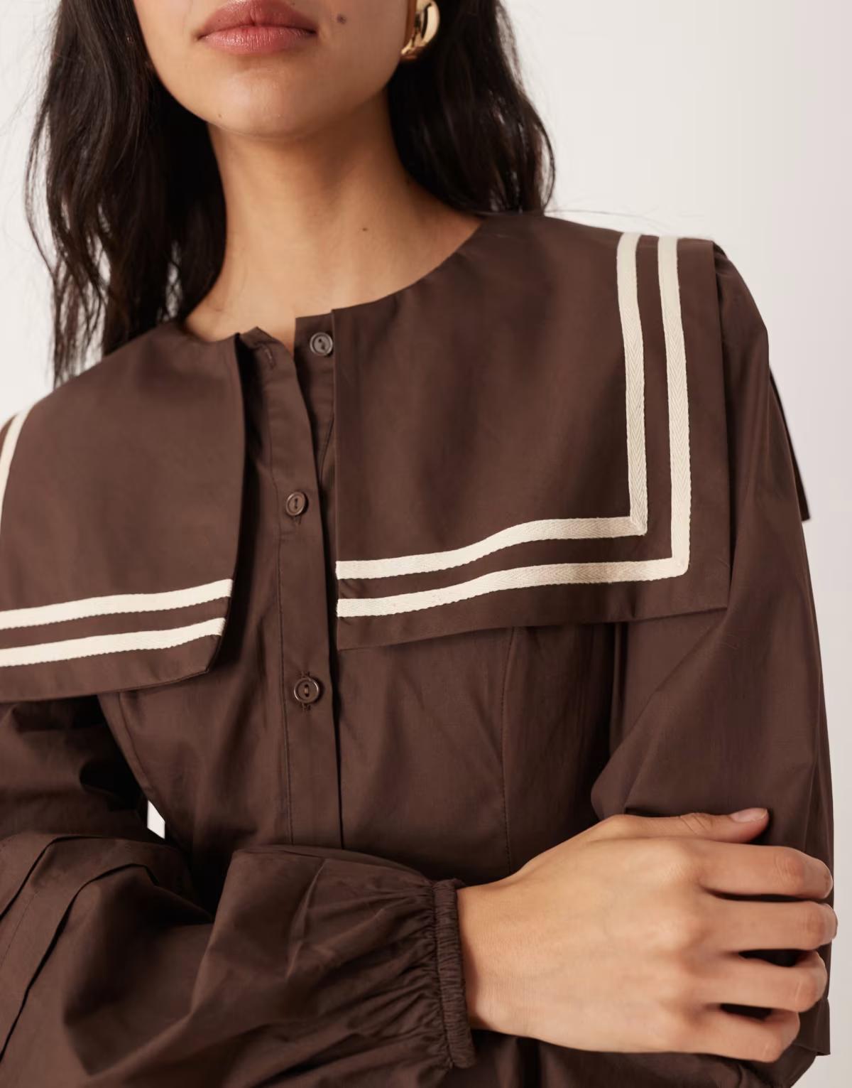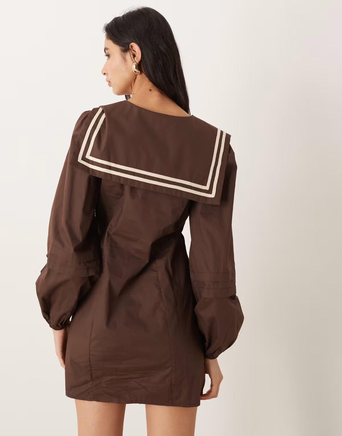 Glamorous square neck collar smock mini dress in brown with ivory trim