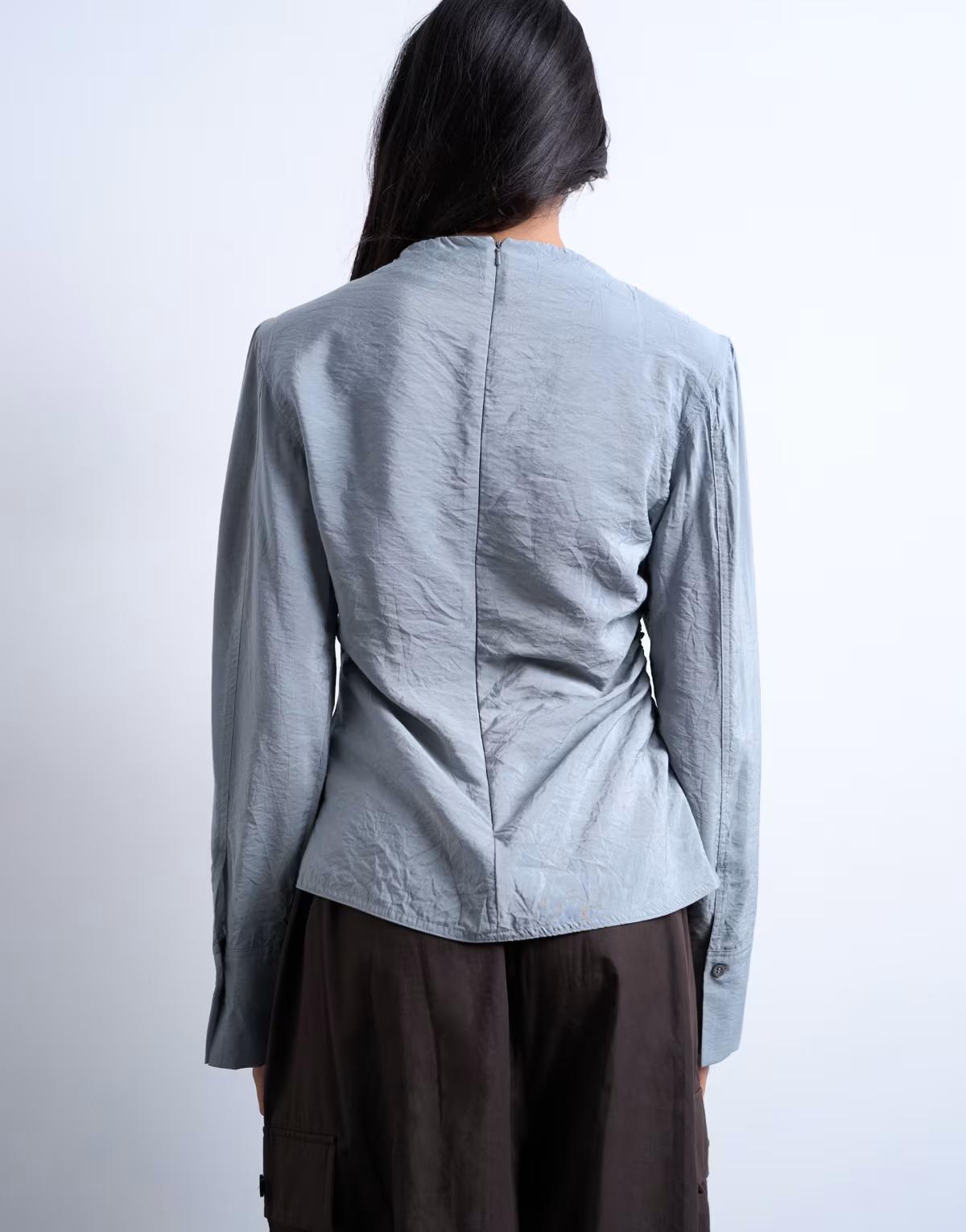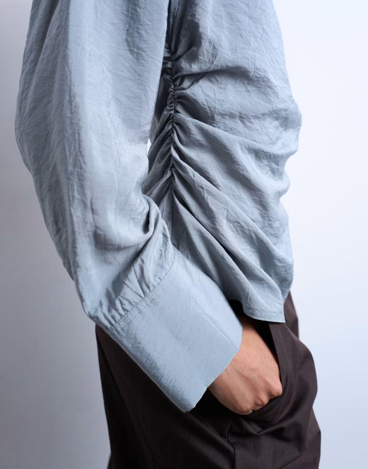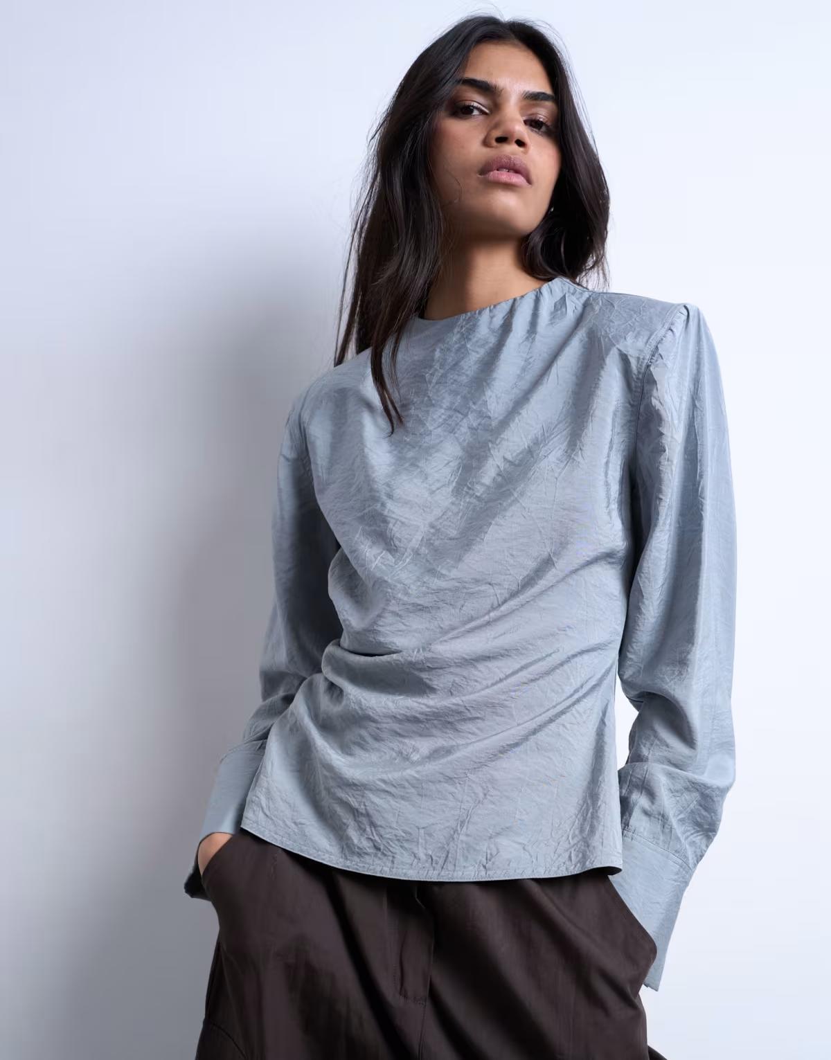 This top features a crew neck, long sleeves, a zip-back fastening and ruching to the left side. It is cut from a lightweight woven fabric that falls loosely over the body.