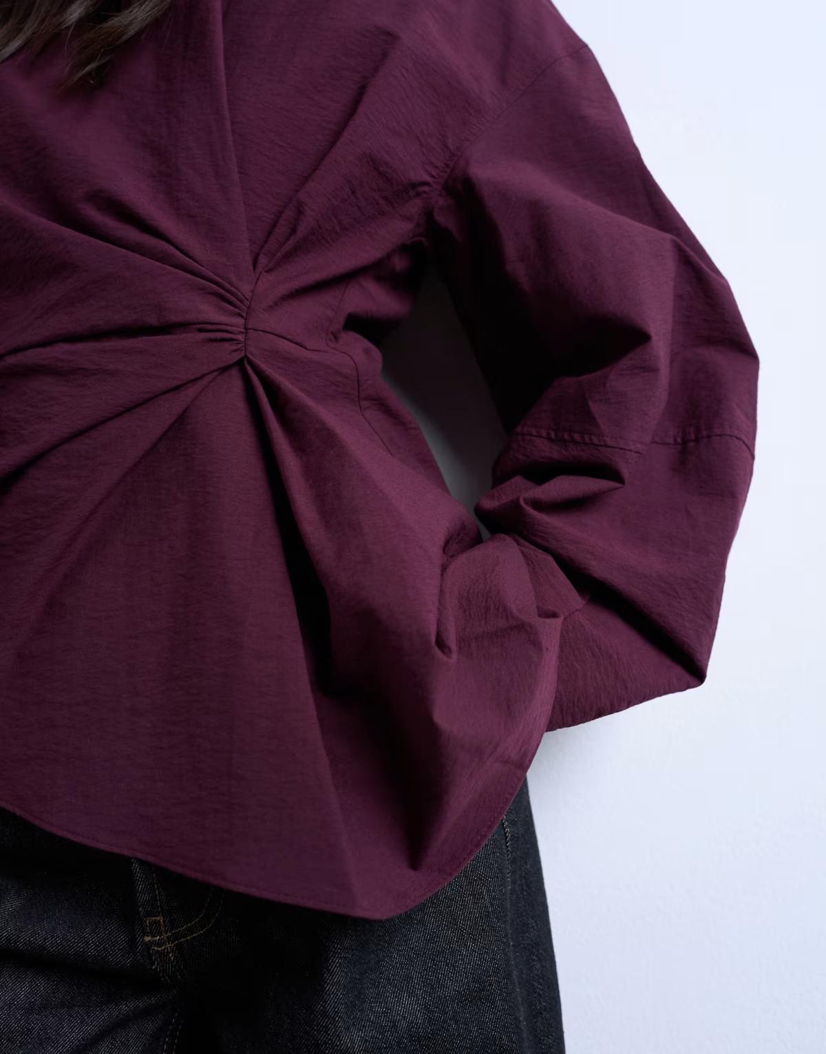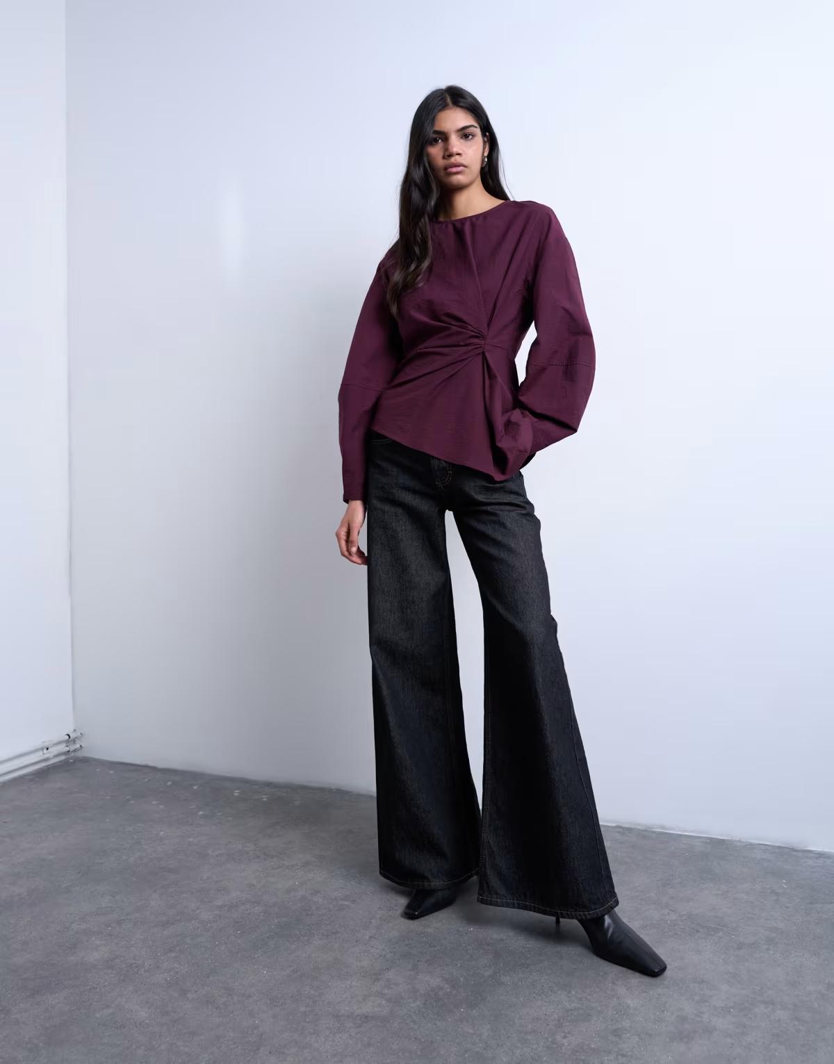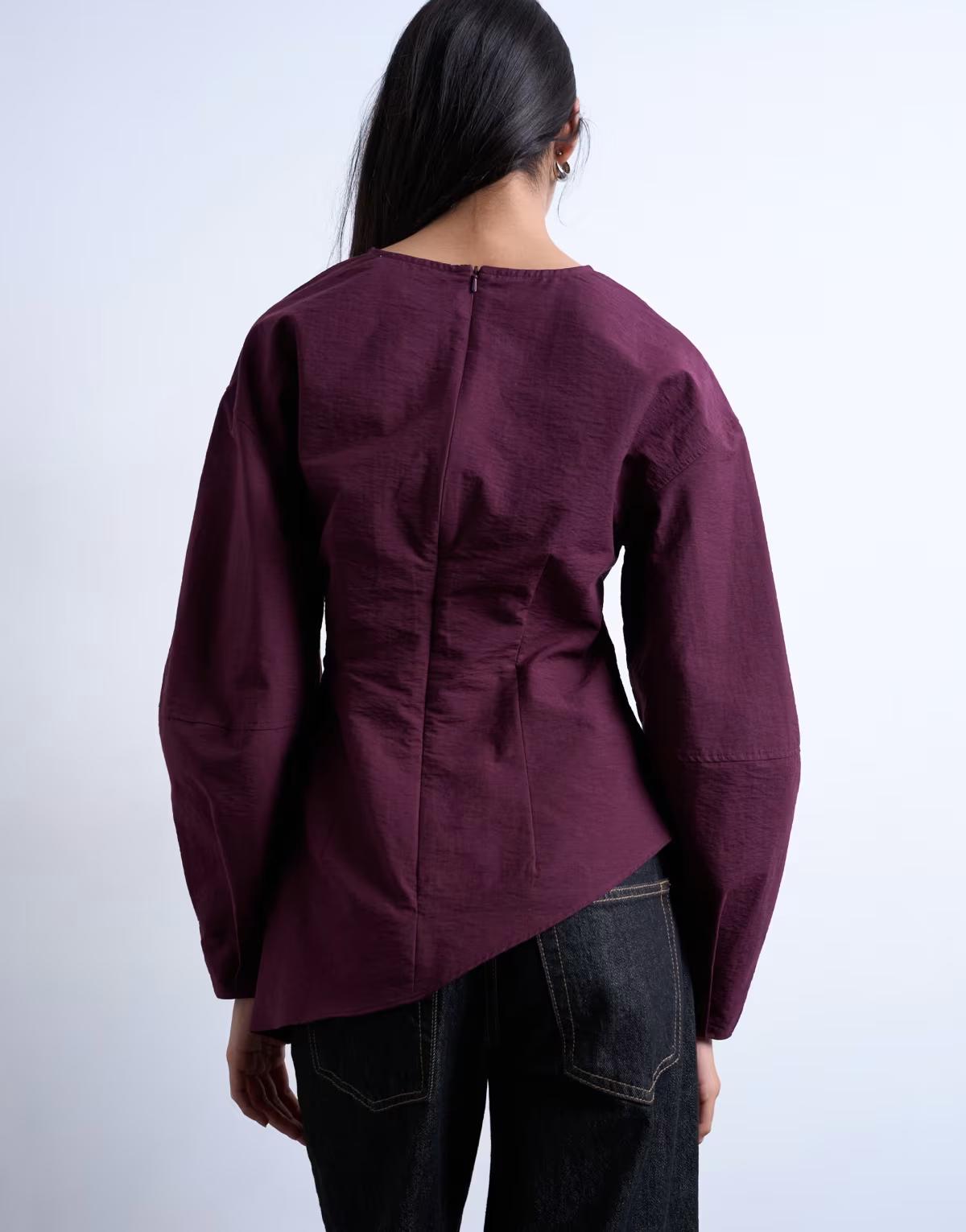 Topshop long sleeve pleat front top in burgundy