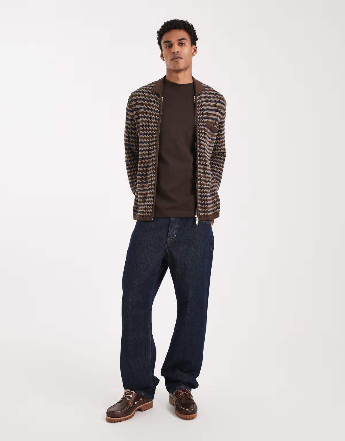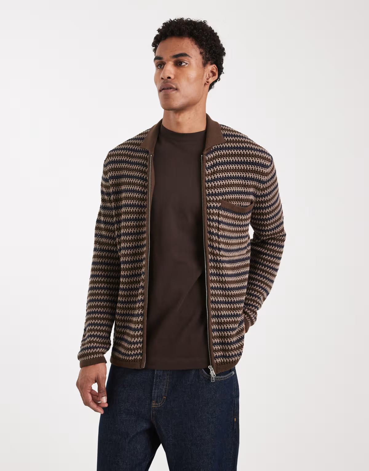 ONLY & SONS zip through crochet knit with pocket in navy & brown