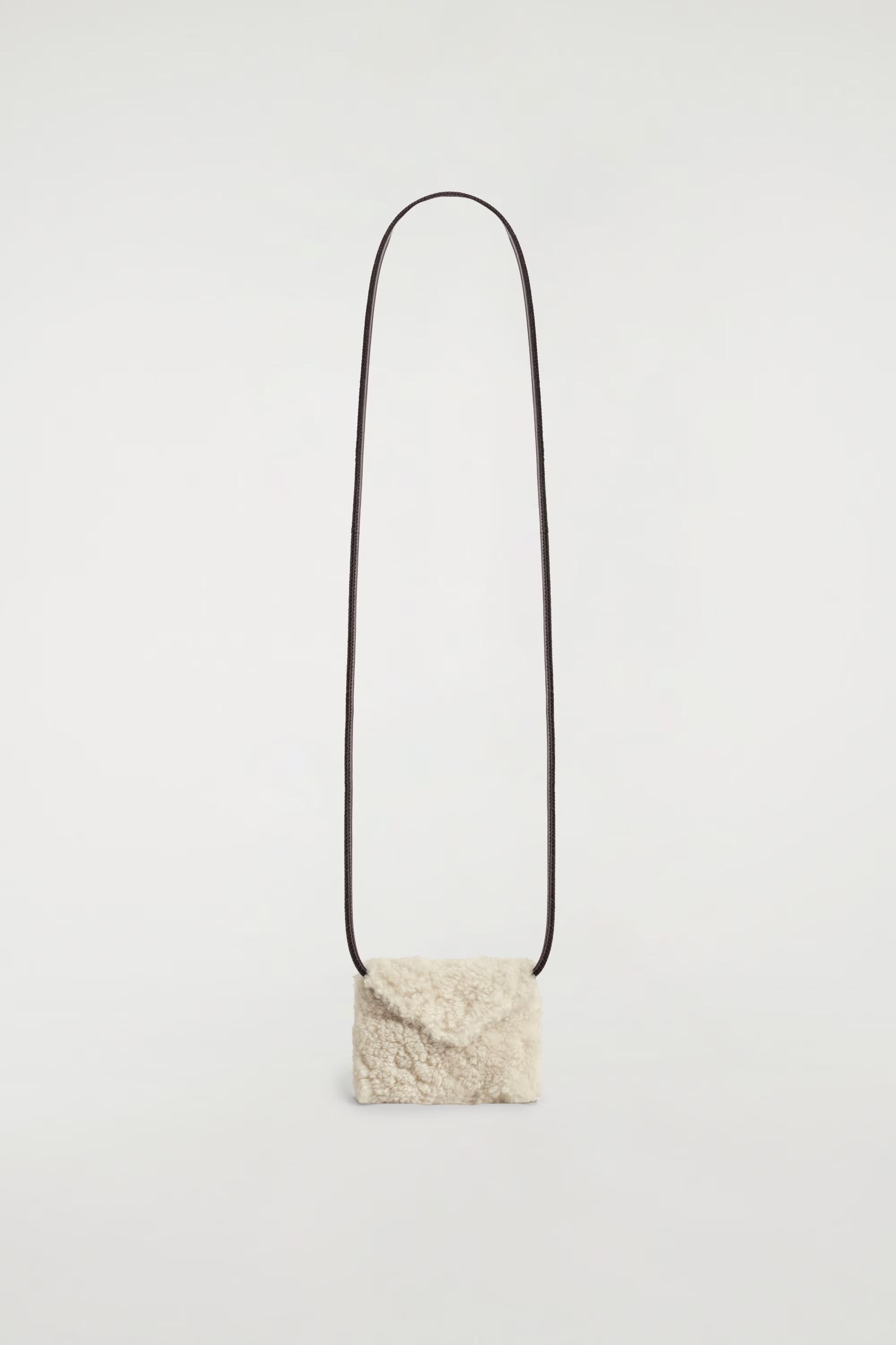 The COS cardholder is reimagined in sumptuous shearling for the winter wardrobe. Luxuriously tactile, it's rendered in a neutral ecru tone and designed with an extended leather strap\u0026nbsp;\u0026ndash; style it across the body or tied to a bag.\u0026nbsp;Press-stud closureCOS supports responsible manufacturing via the Leather Working Group\u0026nbsp;\u0026nbsp;Shell: 100% Shearling. Strap: 100% Leather. Excluding trims