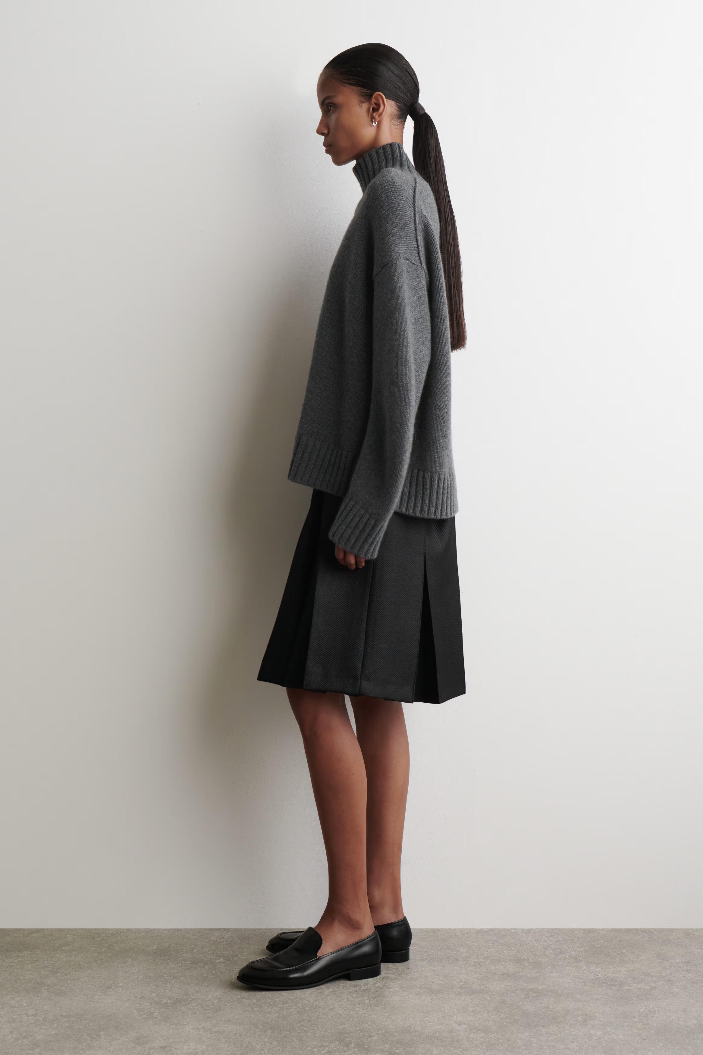 This season, the womenswear designers lean into the classic appeal of the pleated skirt. Crafted from a richly tactile wool blend, this piece is shaped with deep inverted box pleats and has an A-line silhouette that sits above the knee. Style it with a tonal knit.\u0026nbsp;Regular fitHook, eye and zip closureRecycled polyester is polyester made from PET bottles or end-of-life textile waste. The PET bottles or textile waste is mechanically recycled and processed into new yarn\u0026nbsp;Shell: 65% Recycled polyester, 35% RWS wool. Lining: 100% Viscose. Excluding trims / Machine wash\u0026nbsp;Back length of size EU 36 is 54cm / Model wears a size EU 36
