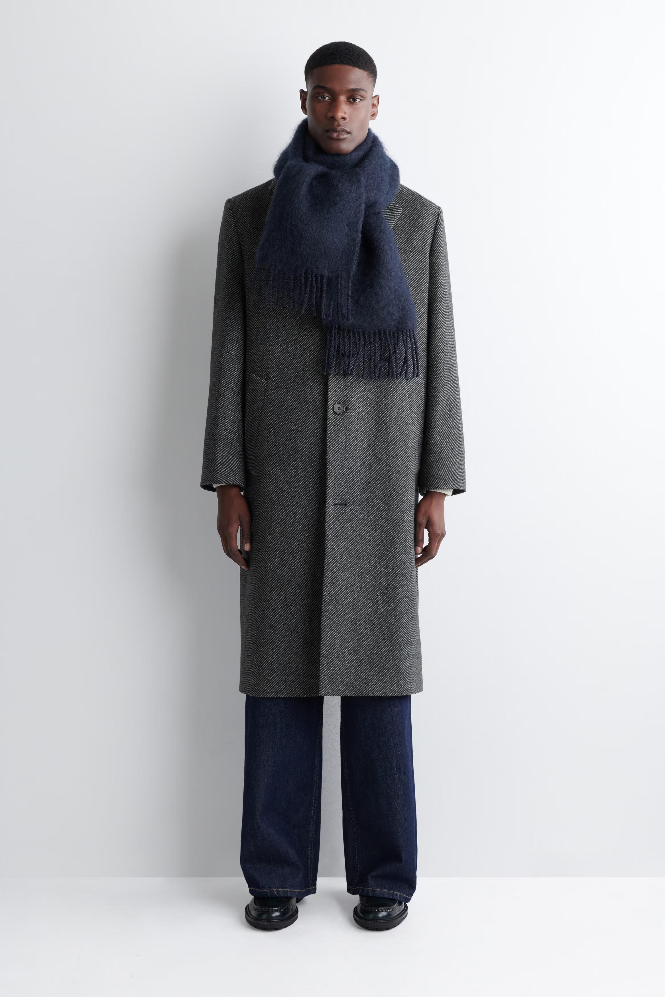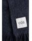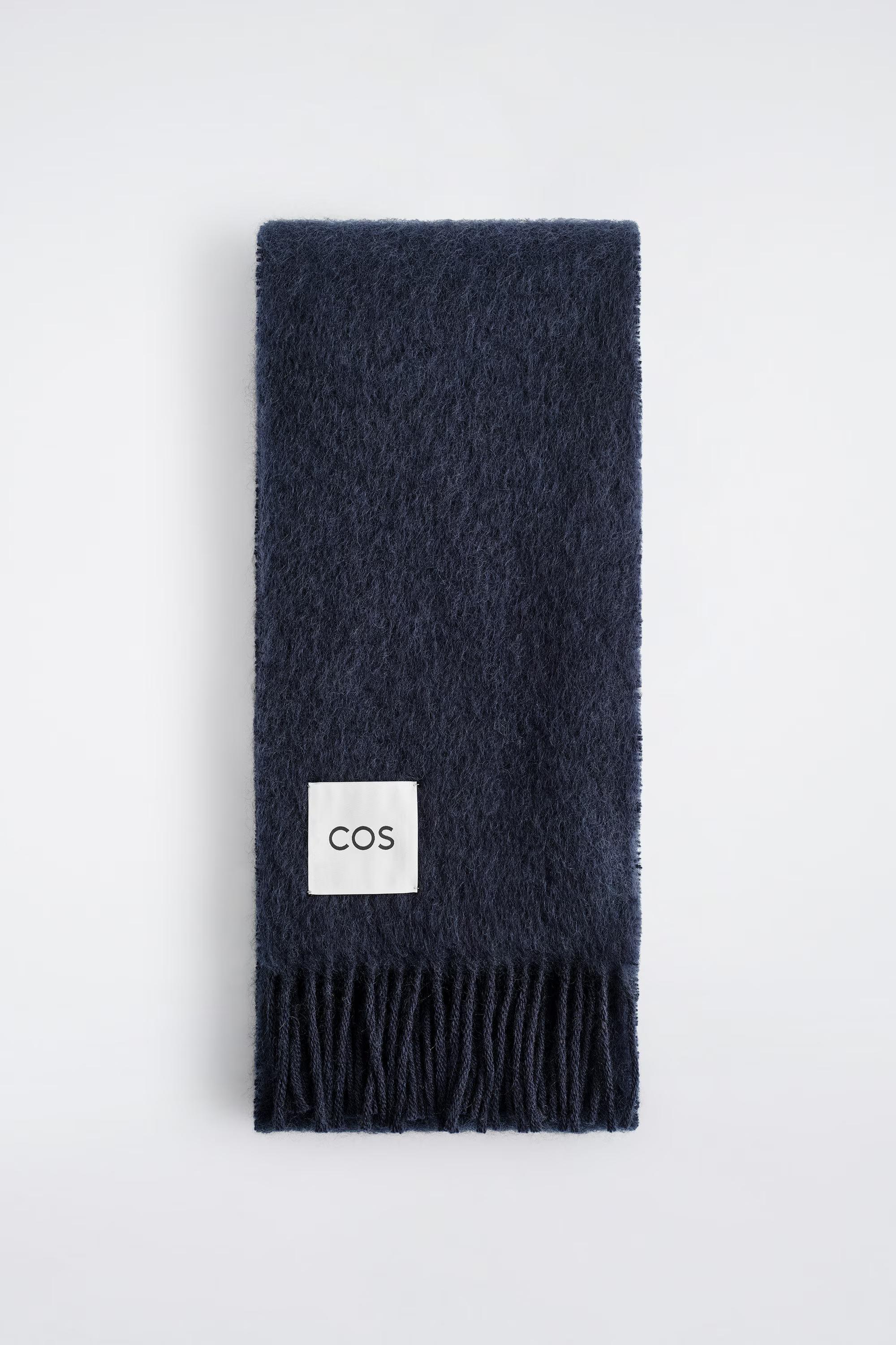 Designed for the coolest days of the year, this scarf is knitted from a mohair and wool blend that has a softly brushed texture. It's finished with fringed ends and has a COS logo patch on one side.\u0026nbsp;This product contains Responsible Mohair Standard TE-00047206 (RMS) mohair fibre from farms certified to animal welfare and land-management requirements\u0026nbsp;Shell: 52% RMS Mohair, 46% RWS Wool, 2% Polyamide (Nylon). Excluding trims / Hand wash\u0026nbsp;Length is 200cm, width is 22cm