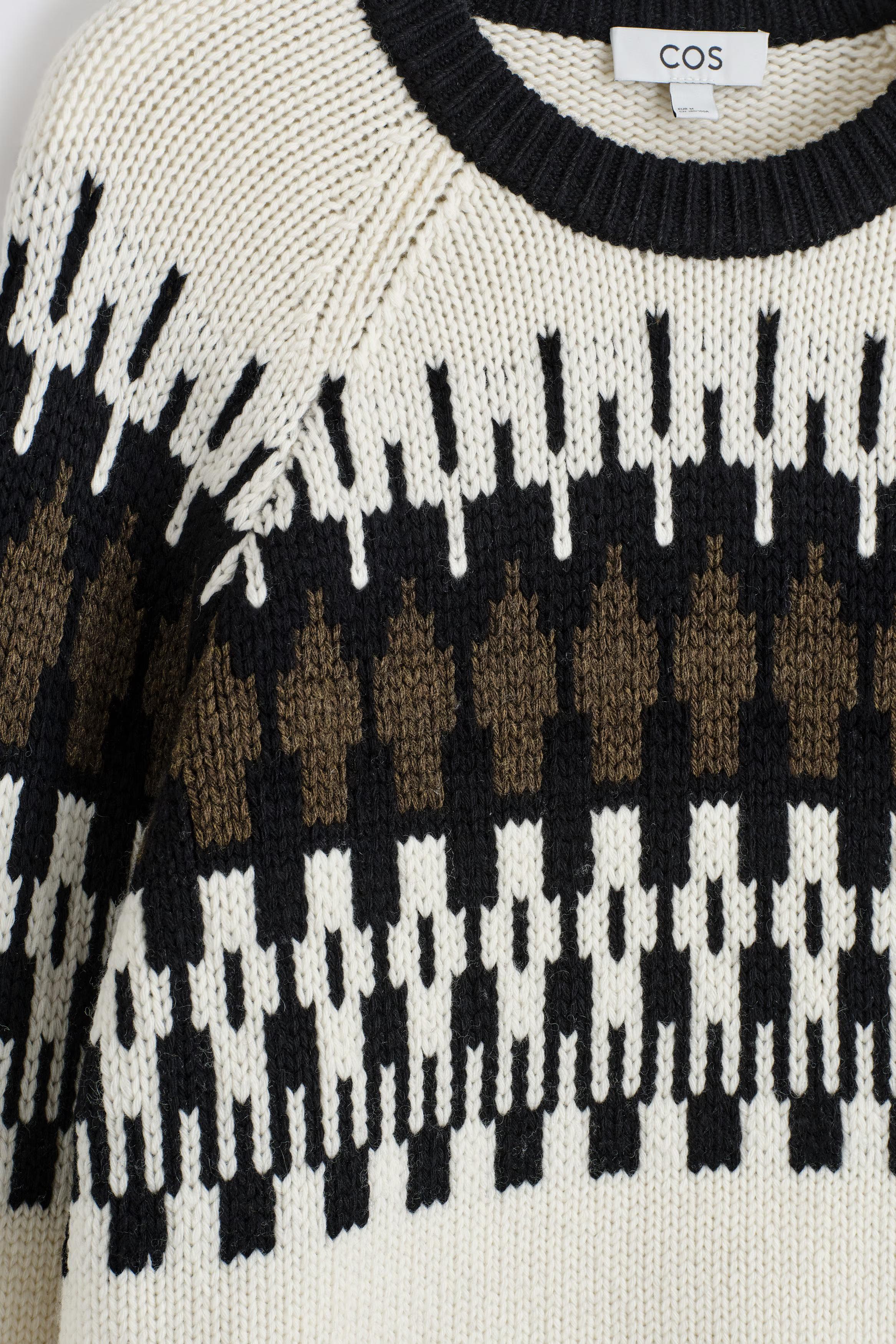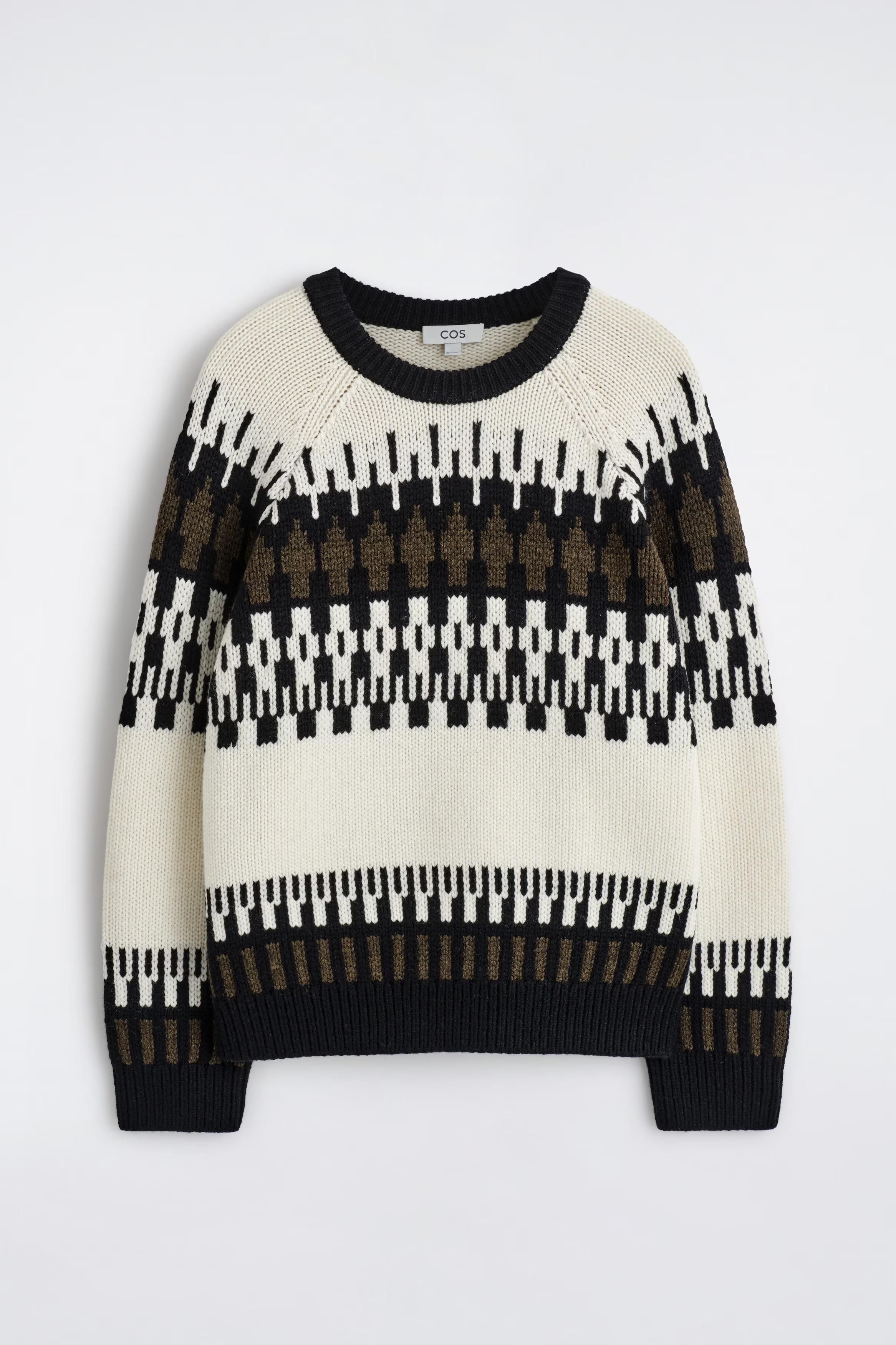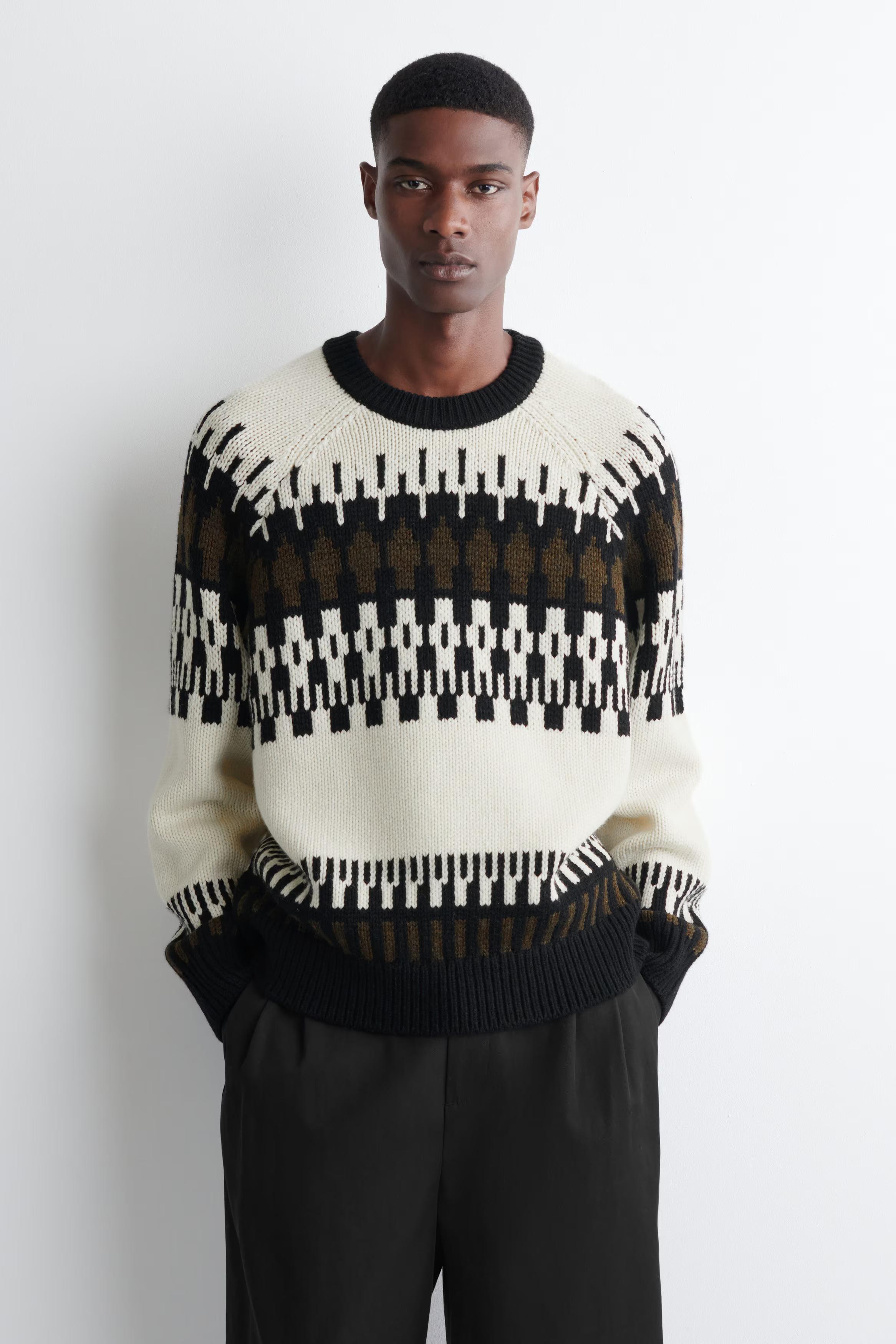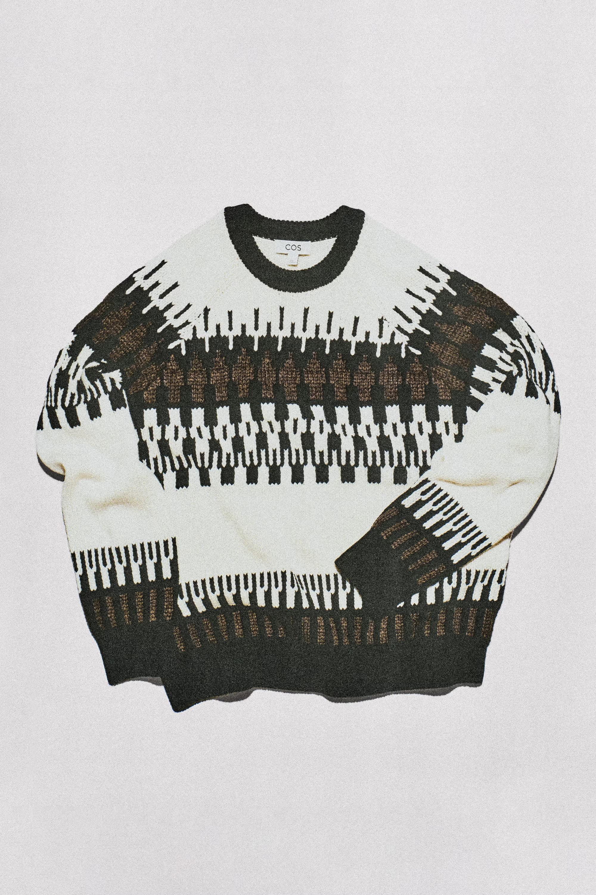 The menswear team referenced alpine skiwear when designing this chunky jumper. It's knitted from premium merino wool and cashmere for a luxuriously soft handle and patterned in a fairisle pattern that nods to heritage. It features a ribbed crew neck, cuffs and hem.\u0026nbsp;\u0026nbsp;Relaxed fitThis product contains Responsible Wool Standard TE-00047206 (RWS) wool fibre from farms certified to animal welfare and land-management requirements\u0026nbsp;Shell: 90% Merino wool, 10% GCS Cashmere. Excluding trims / Machine wash\u0026nbsp;Back length of size M is 64cm / Model wears a size M