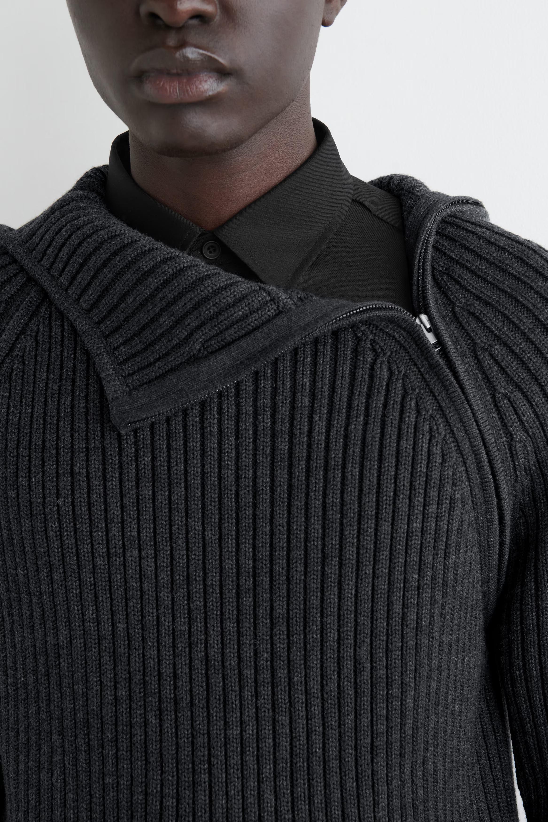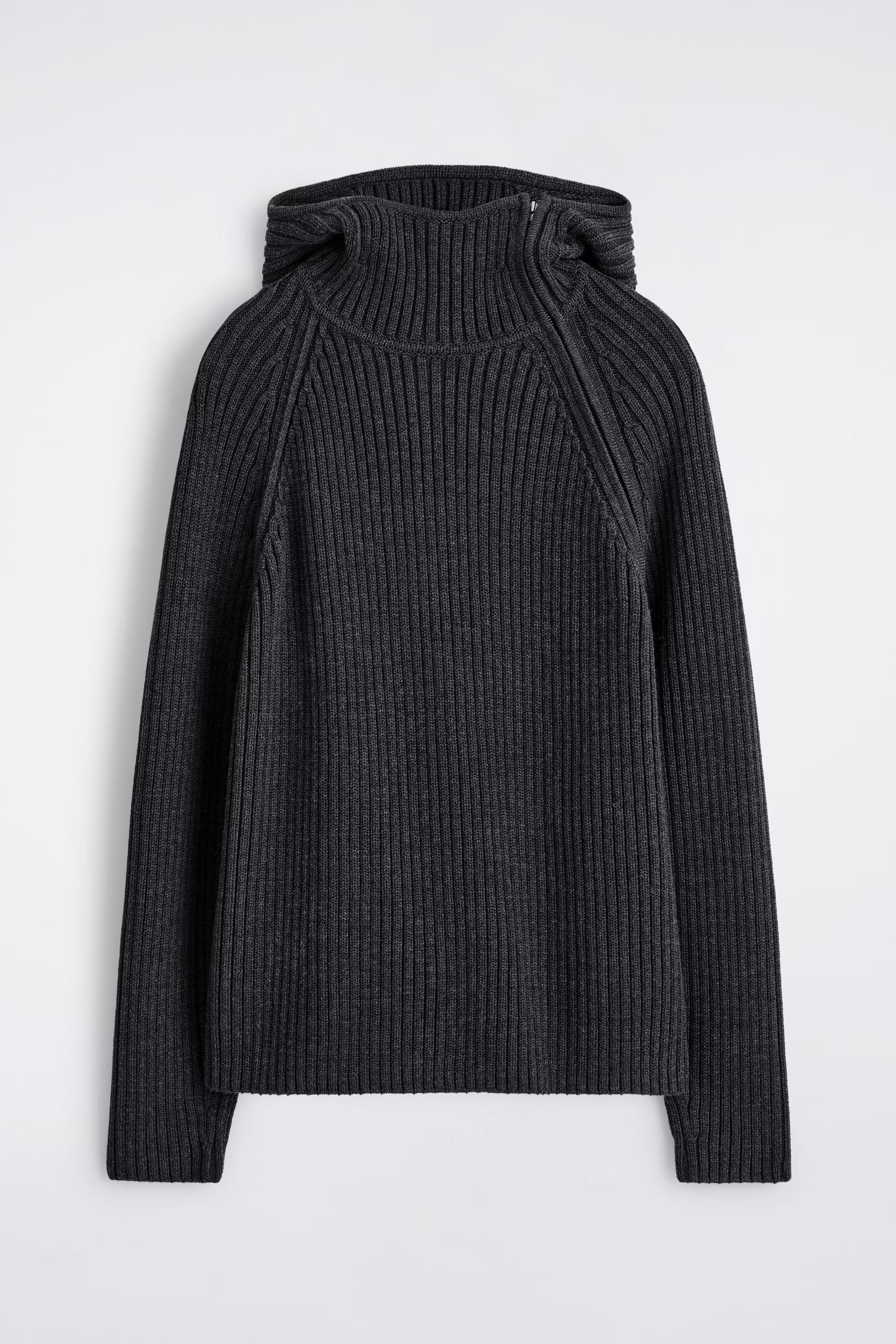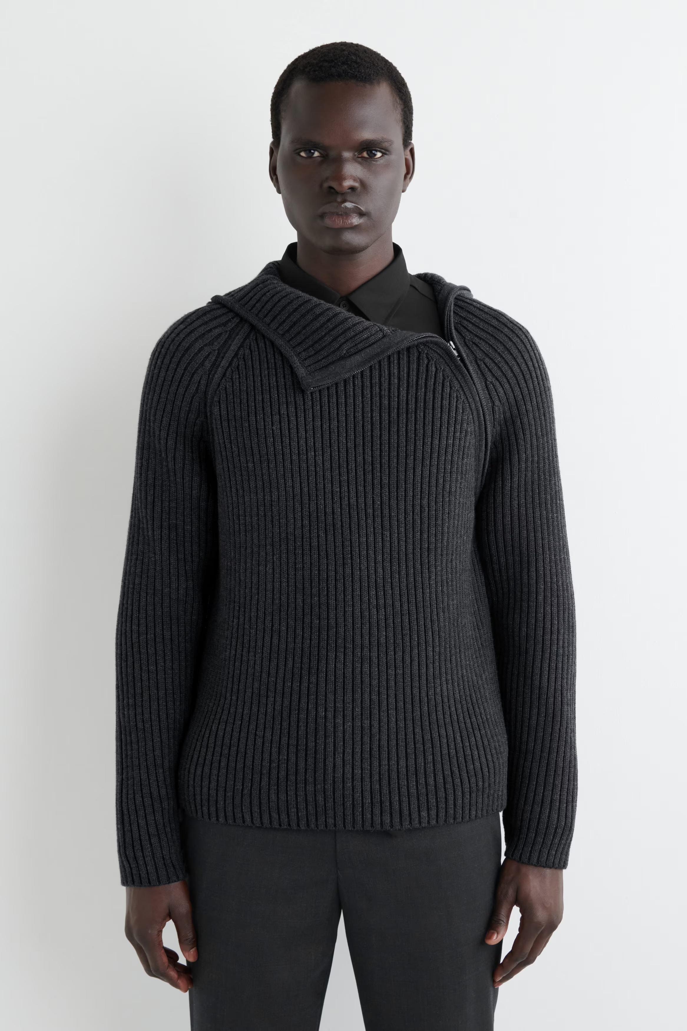 The COS menswear team modernise classic leisurewear codes for Autumn Winter 2025. Offered in charcoal m\u0026eacute;lange, this contemporary hoodie is knitted from wool and cotton in a wide-rib construction and features a tubular hood with a zip across one shoulder.\u0026nbsp;Regular fitZip closureThis product contains Responsible Wool Standard TE-00047206 (RWS) wool fibre from farms certified to animal welfare and land-management requirements\u0026nbsp;Shell: 65% RWS wool, 35% Cotton. Excluding trims / Machine wash\u0026nbsp;Back length of size M is 63cm / Model wears a size M