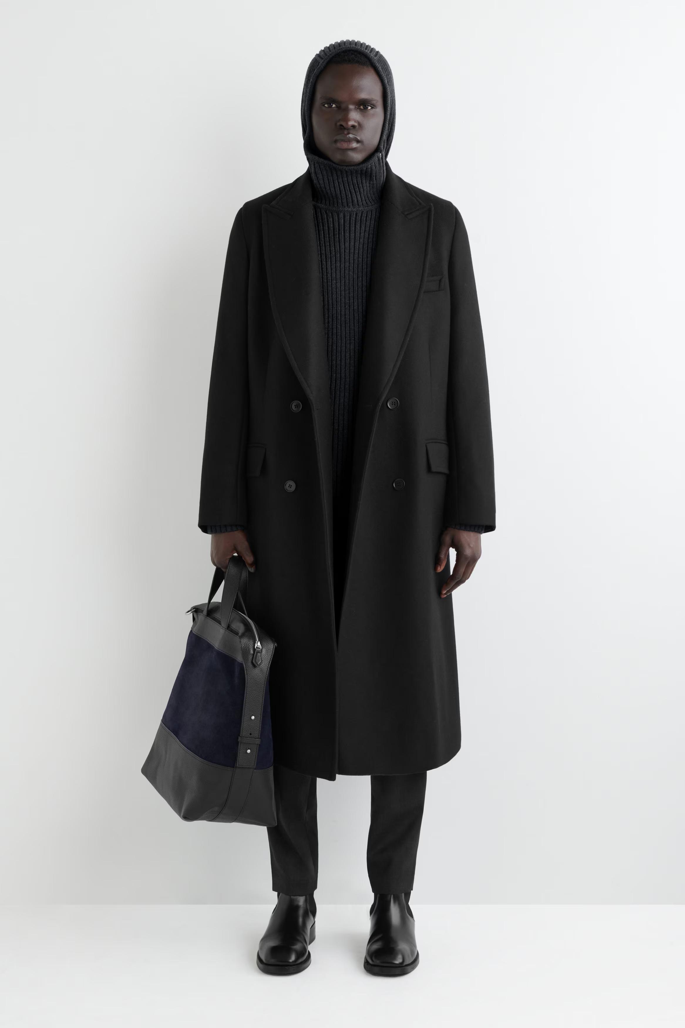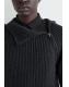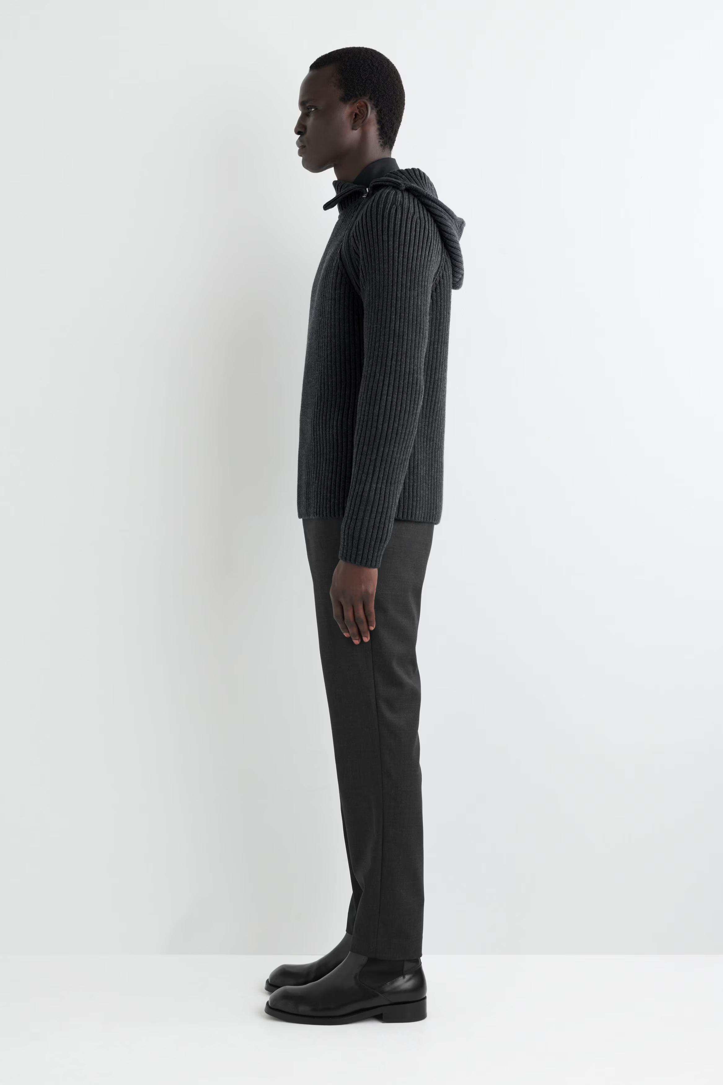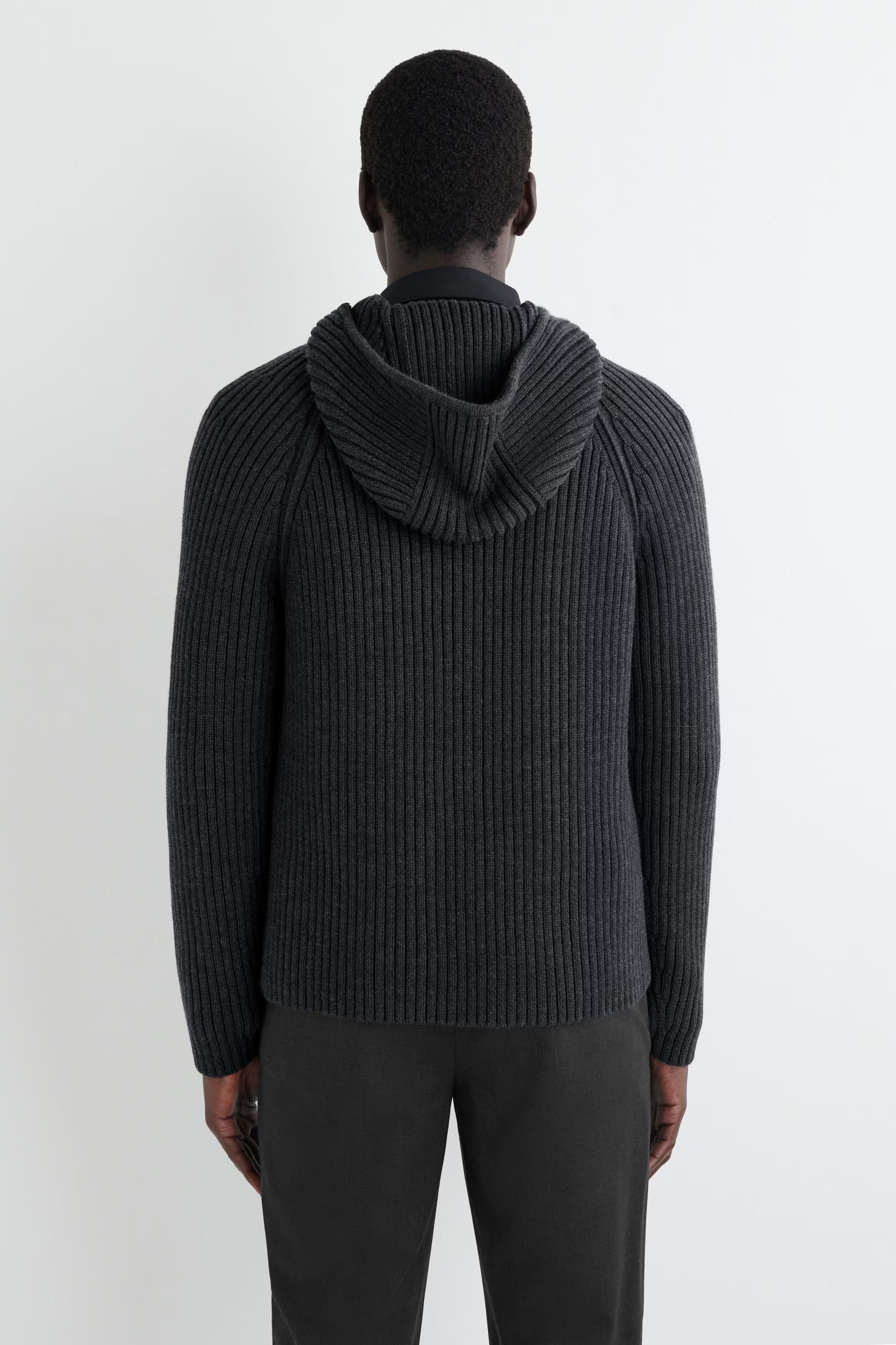 The COS menswear team modernise classic leisurewear codes for Autumn Winter 2025. Offered in charcoal m\u0026eacute;lange, this contemporary hoodie is knitted from wool and cotton in a wide-rib construction and features a tubular hood with a zip across one shoulder.\u0026nbsp;Regular fitZip closureThis product contains Responsible Wool Standard TE-00047206 (RWS) wool fibre from farms certified to animal welfare and land-management requirements\u0026nbsp;Shell: 65% RWS wool, 35% Cotton. Excluding trims / Machine wash\u0026nbsp;Back length of size M is 63cm / Model wears a size M