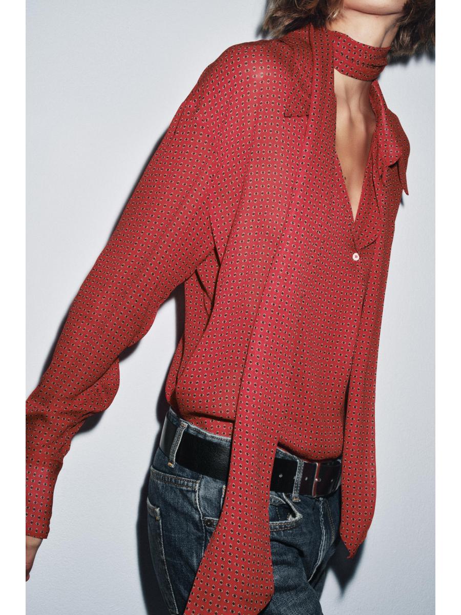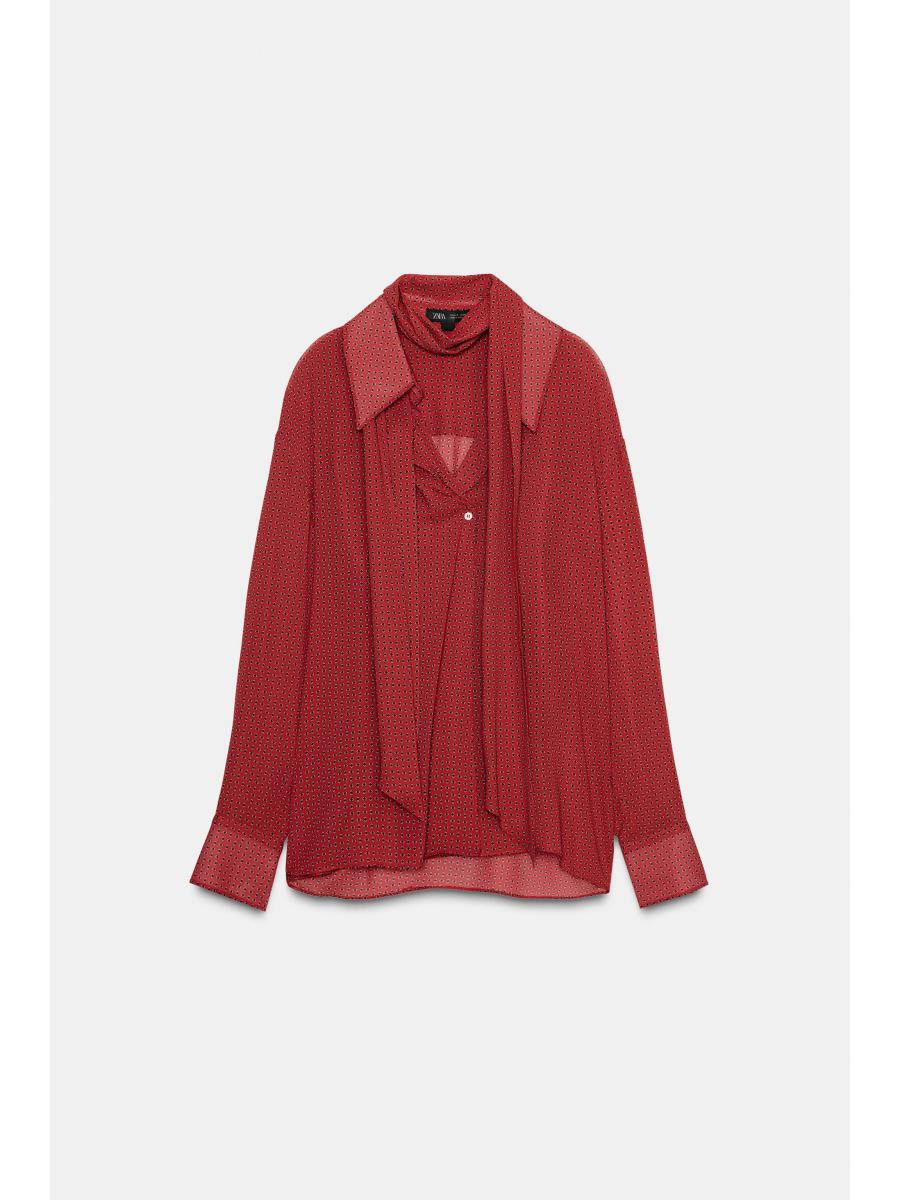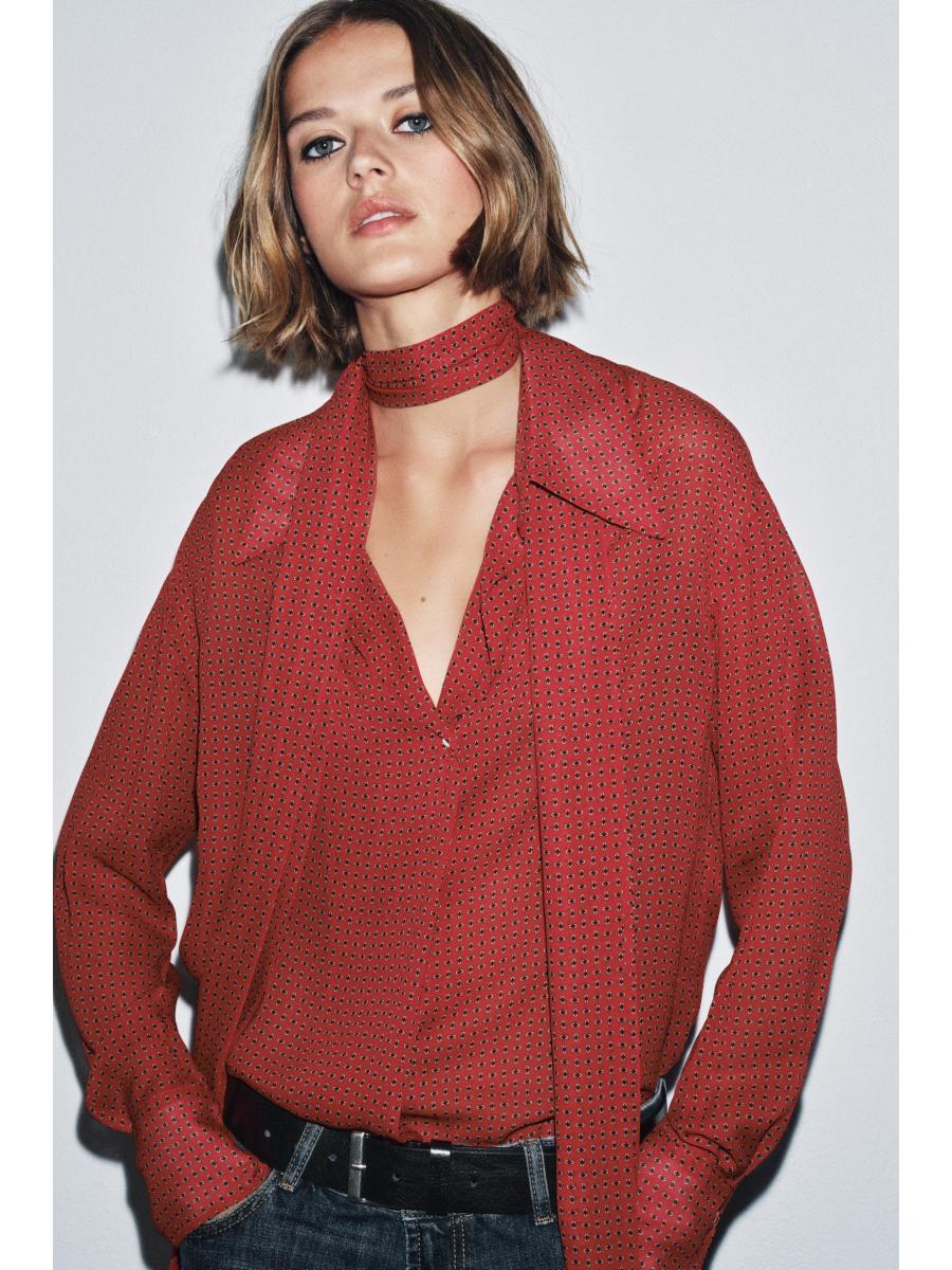 ZARA WOMAN COLLECTIONBlusa confeccionada en hilatura de viscosa. Cuello solapa y manga larga acabada en puño. Detalle de lazo en mismo tejido. Cierre frontal con botones.