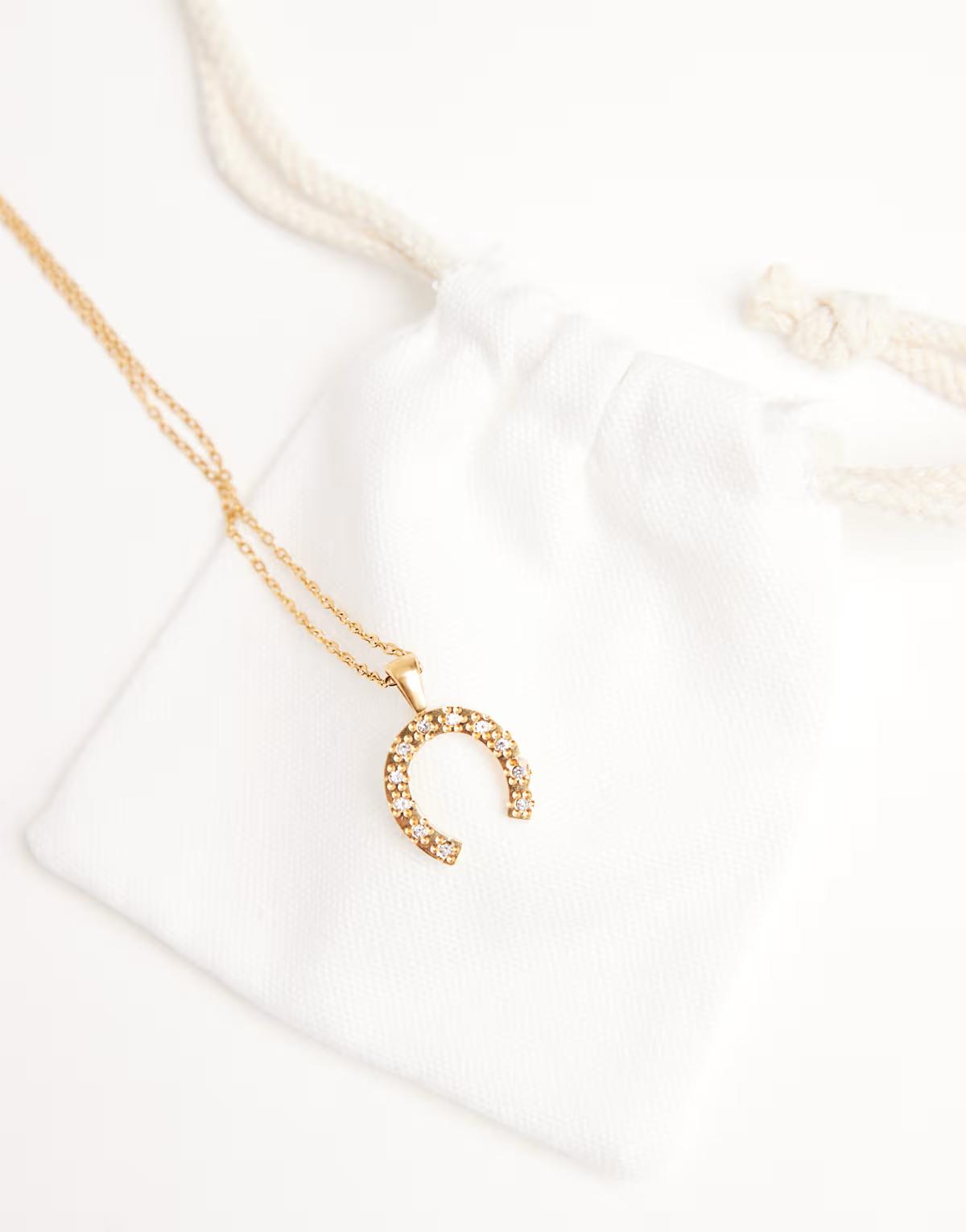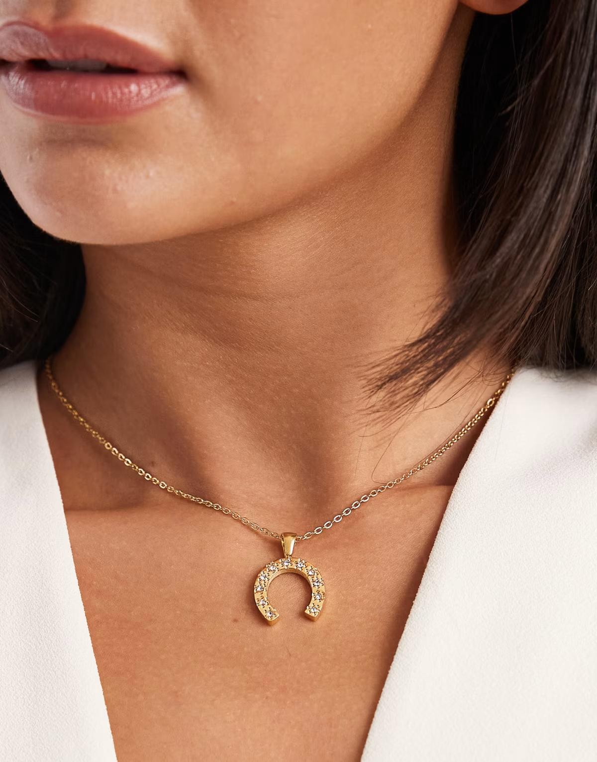 ASOS DESIGN waterproof stainless steel sparkly horse shoe charm necklace with cubic zirconia crystals in gold tone with gift bag