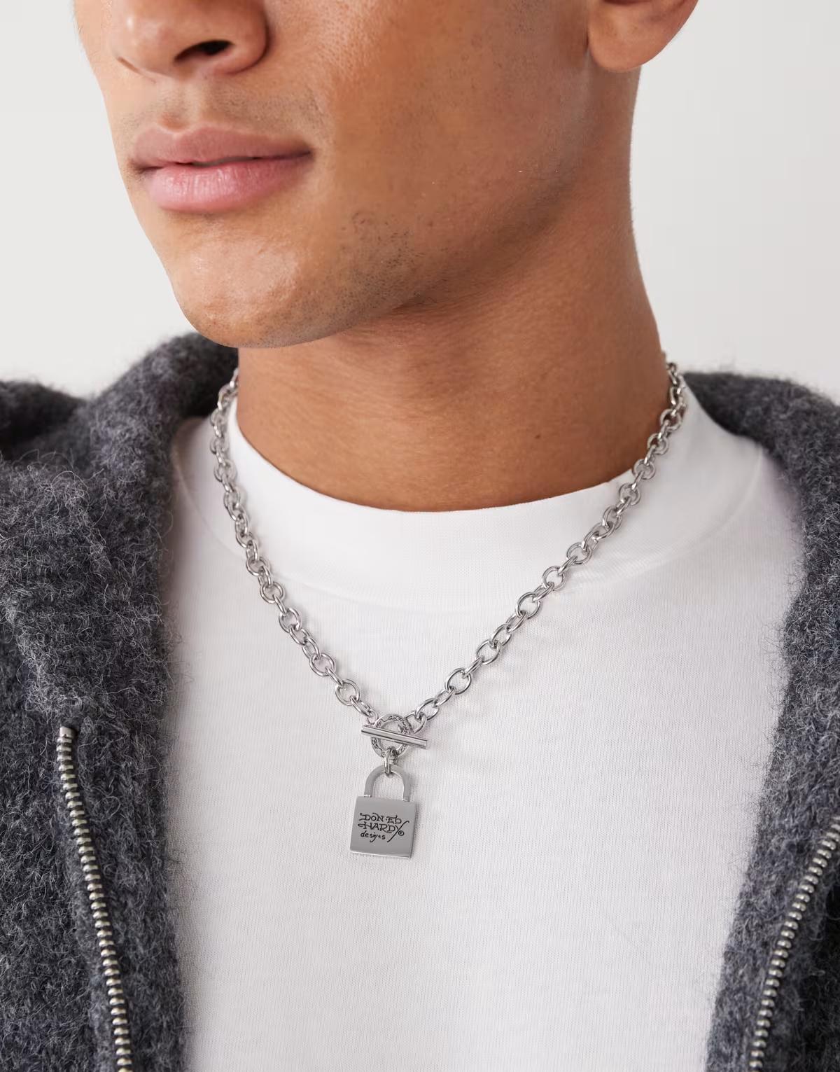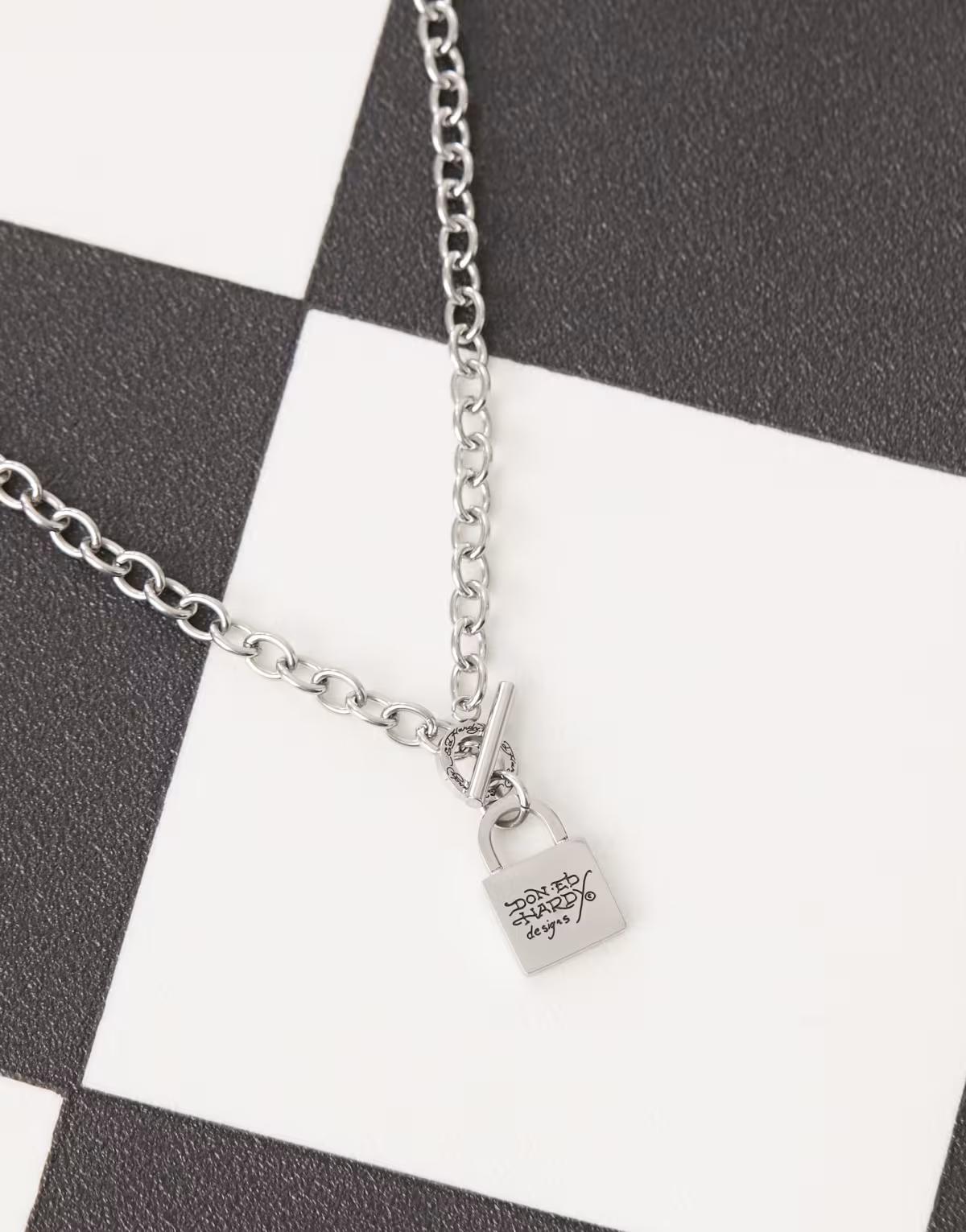 Ed Hardy stainless steel T bar padlock necklace in silver