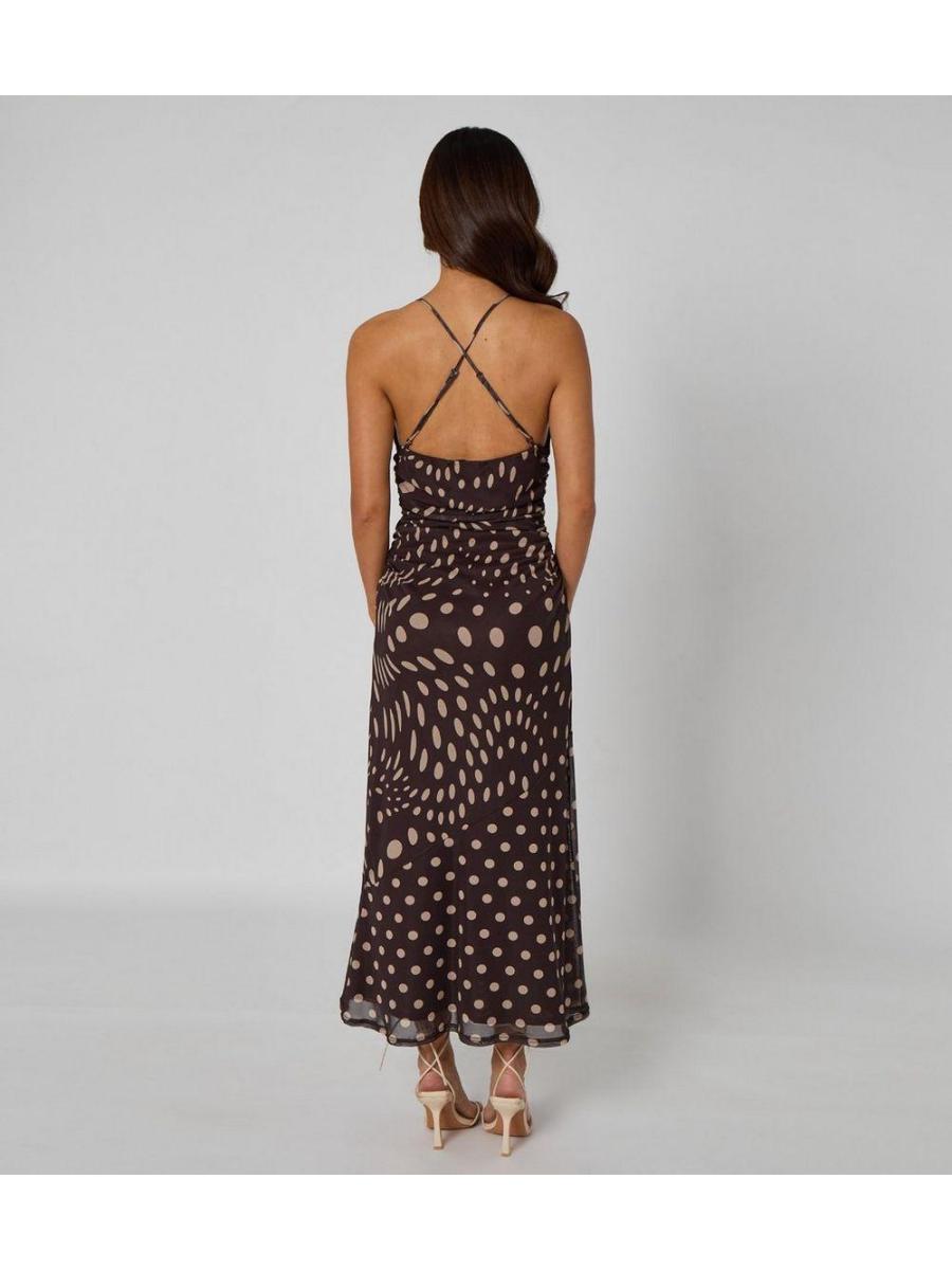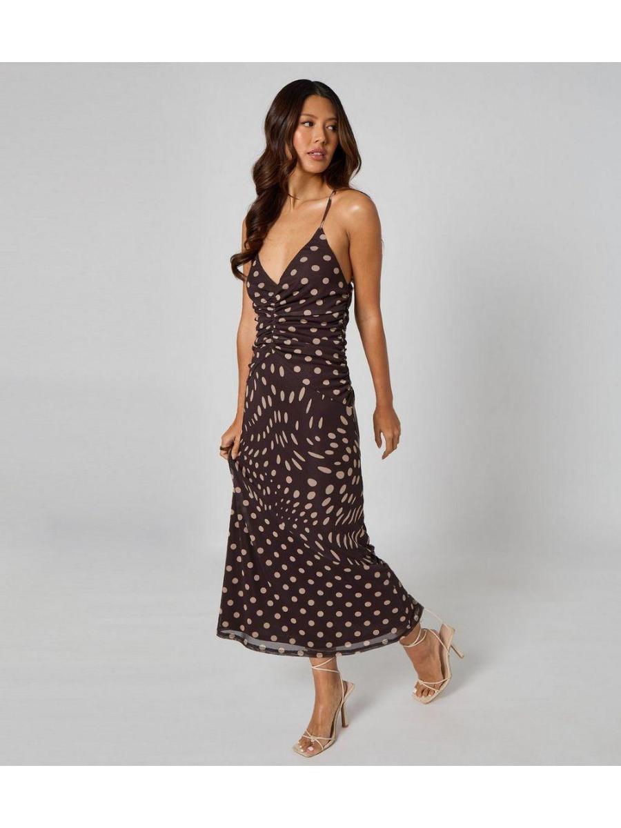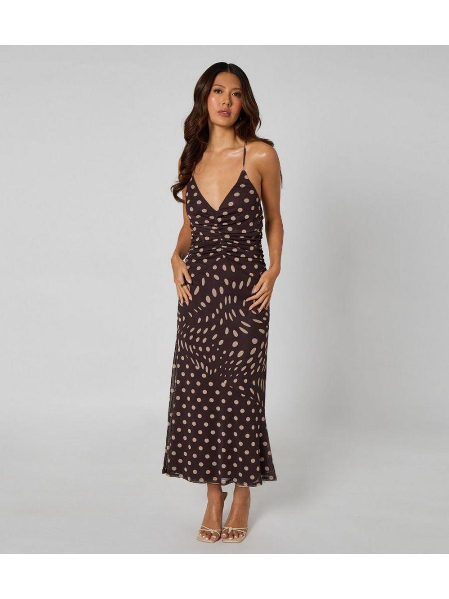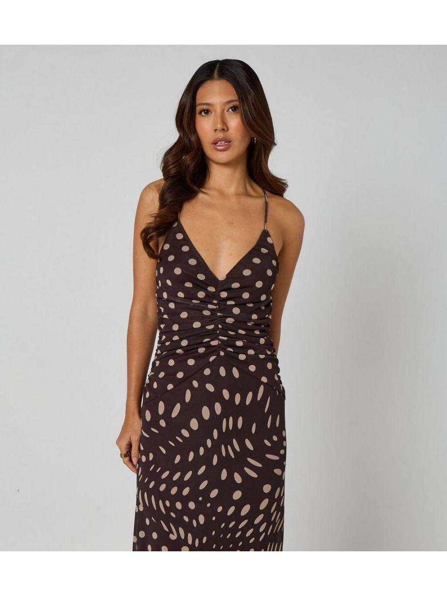 Urban Bliss Brown Polka Dot Ruched Midi Dress