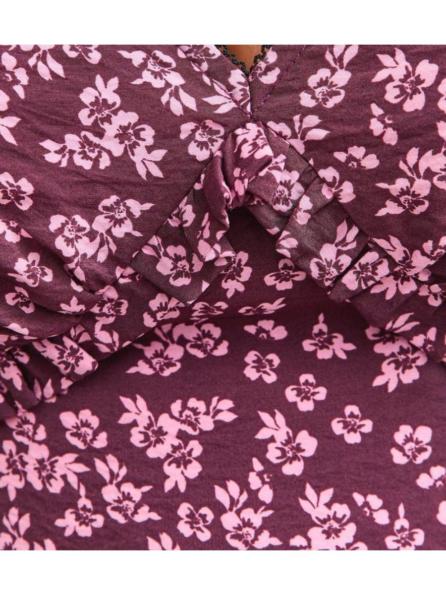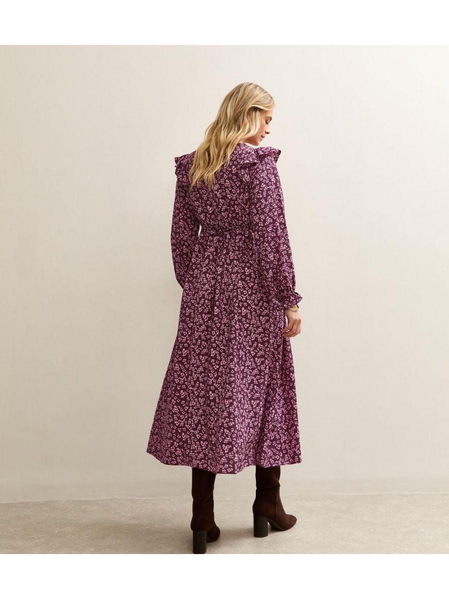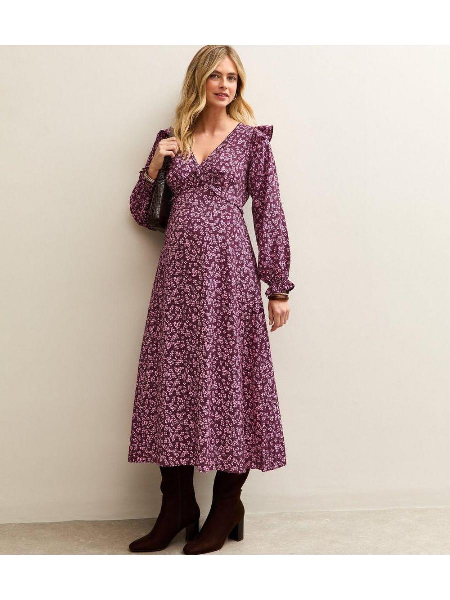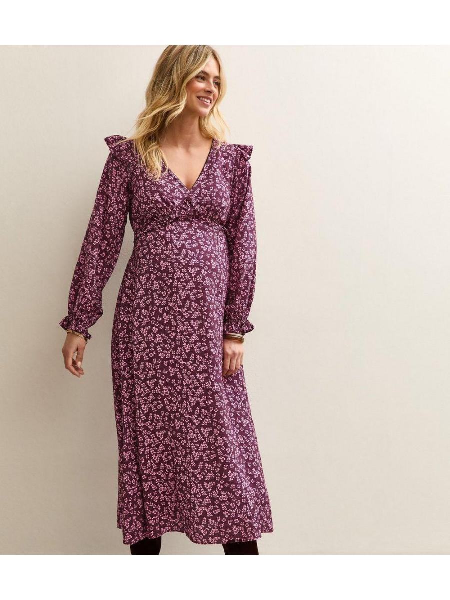 Maternity Purple Ditsy Frill Shoulder Midi Dress