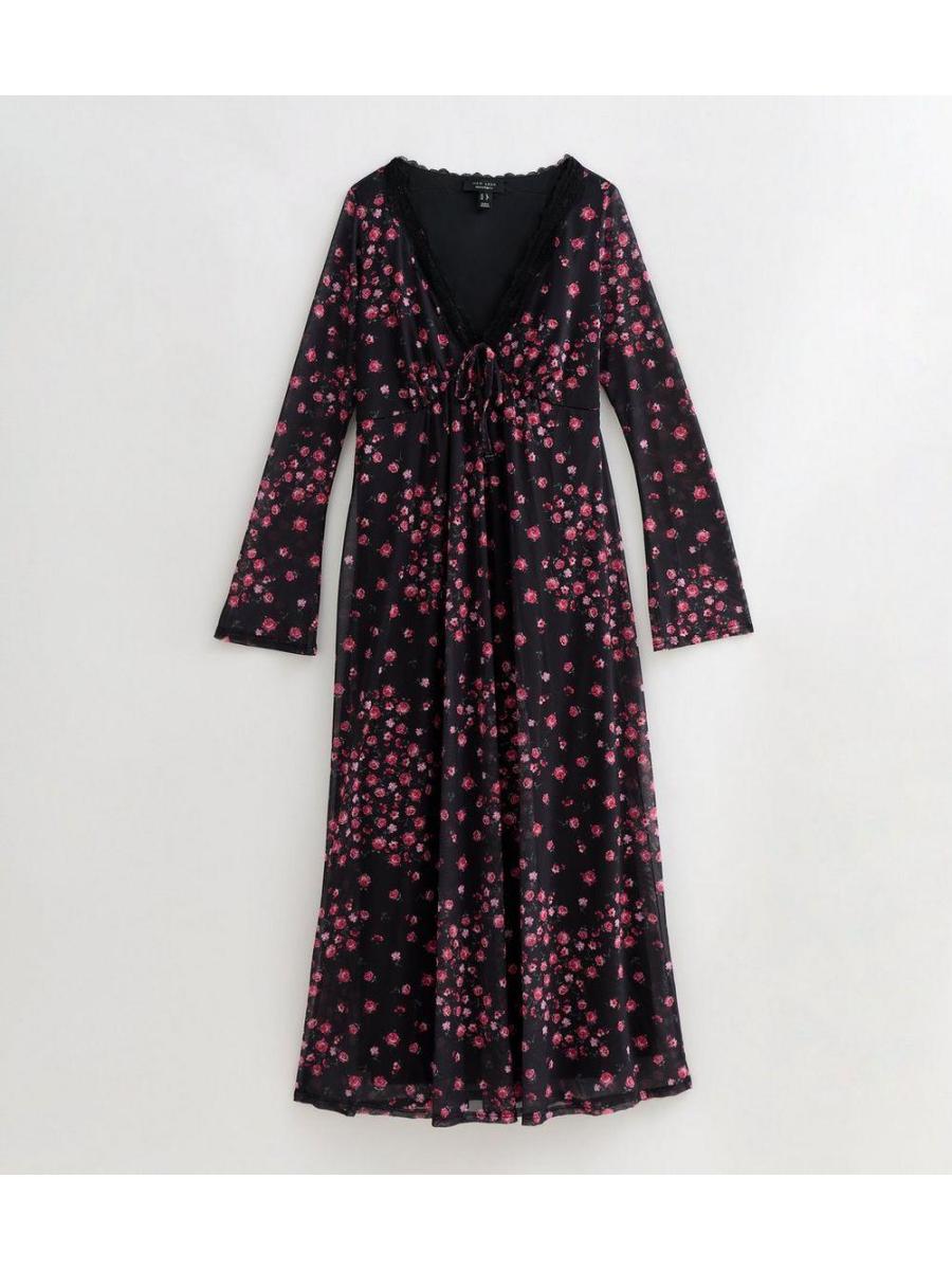 Maternity Black Rose Long Sleeve Lace Mesh Midi Dress