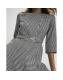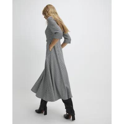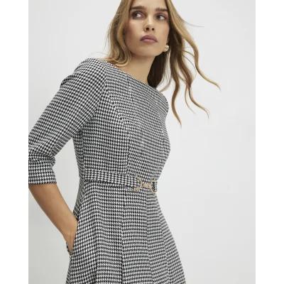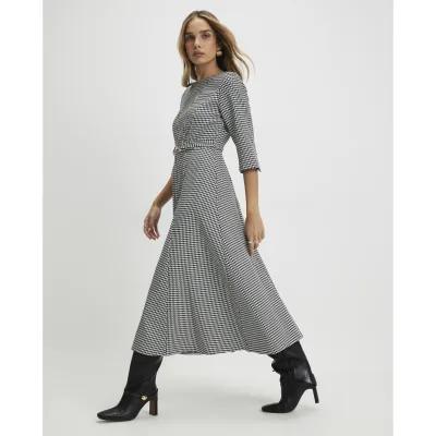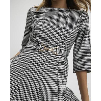 Black Dogtooth Print Belted Midi Dress