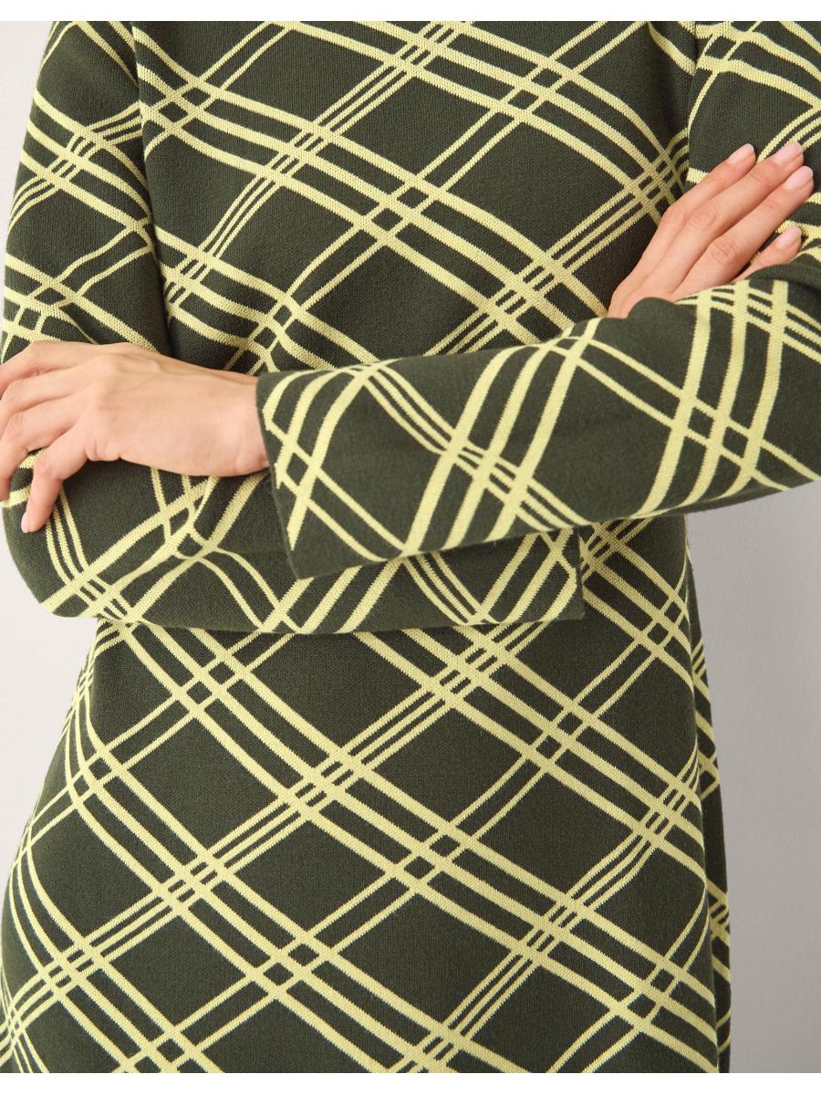 Bringing our love for the butter yellow trend into the new season, this dress showcases a striking checkered pattern over the earthy green backdrop. Knitted with a high neckline and asymmetrical hem, it makes the perfect accompaniment to knee high boots and a belt to cinch the waist. Green