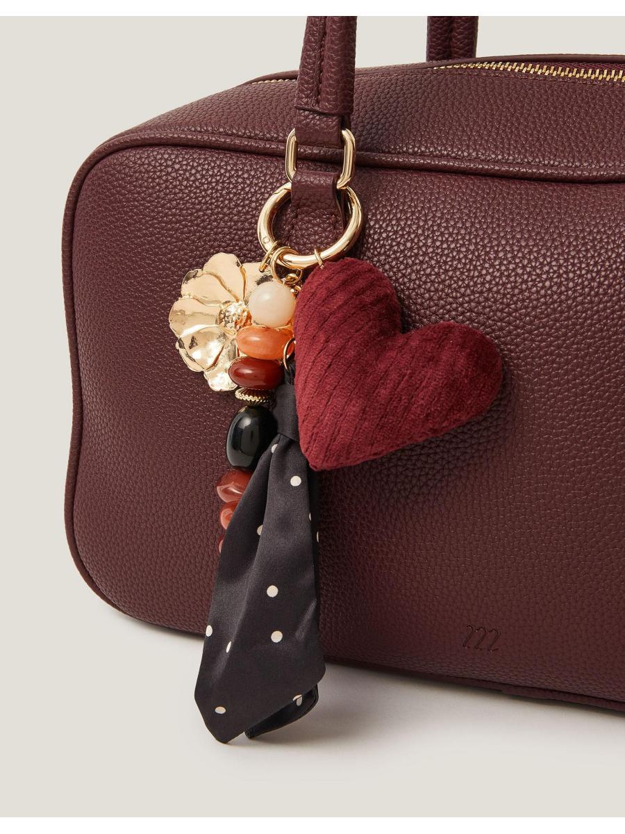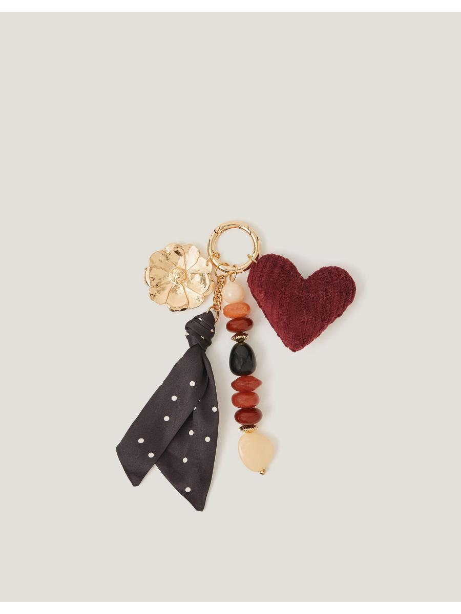 Spotted: your new favourite accessory. Designed with a gold tone flower, mini polka dot scarf, textured heart and beaded chain charm, this keyring is the way to dress up your everyday bag. Finished with a round clip fastening.