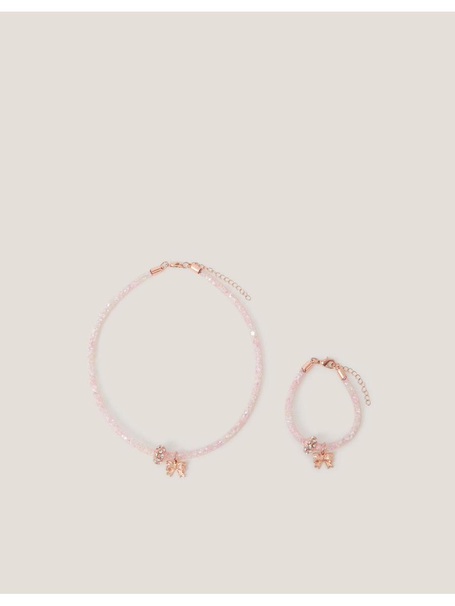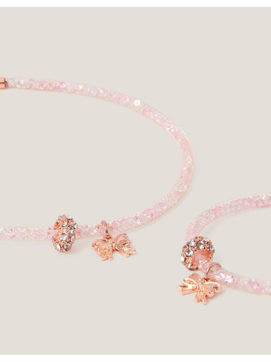 Princess accessories. Designed with tube chains encased with shimmery pink sparkles, this jewellery set includes a necklace and bracelet, bow showcasing diamante beads and bow charms.