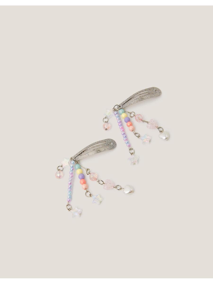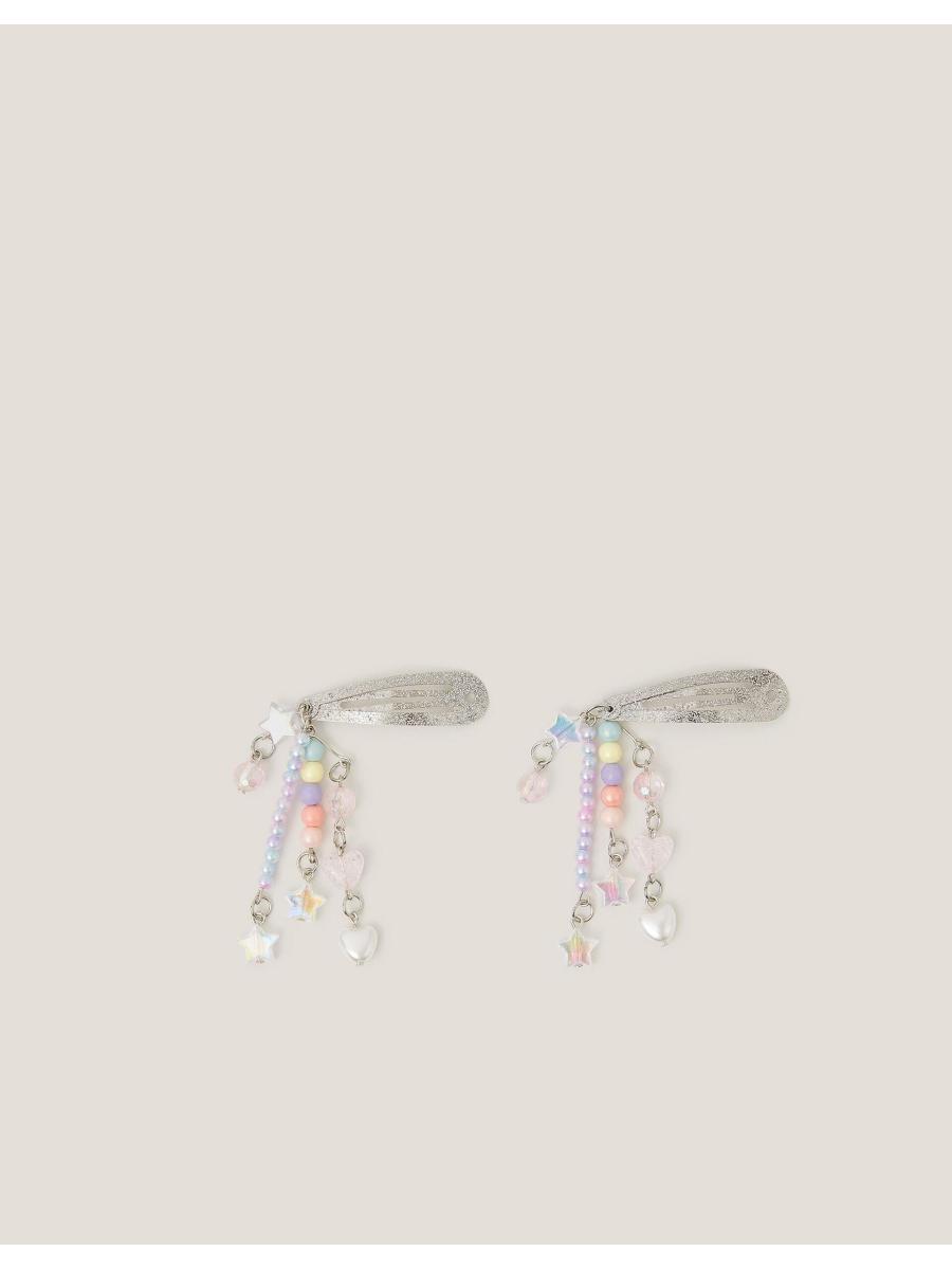 Their lucky charm. Featuring strings of beads, stars and hearts dangling from a glittery hair clip, this set is sure to become their favourite. Two included.