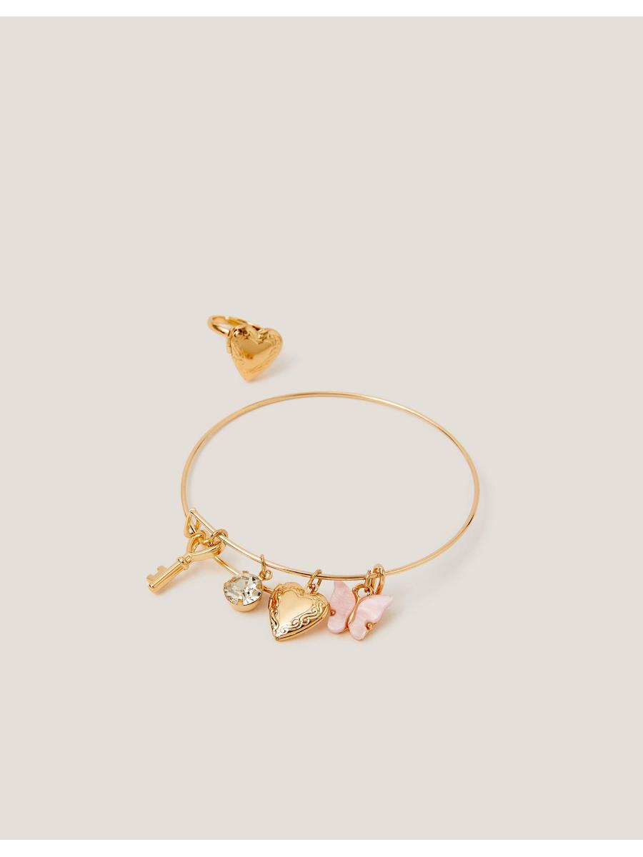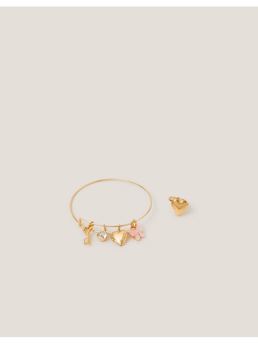 Description Their lucky charm. Introduce your little one to their new favourite accessories with this gold-tone set. Decorated with gemstone, butterfly, locket and key charms, the bangle is sure to be admired by everyone. Completed with a love-ly heart ring, their hands will always be best dressed.
