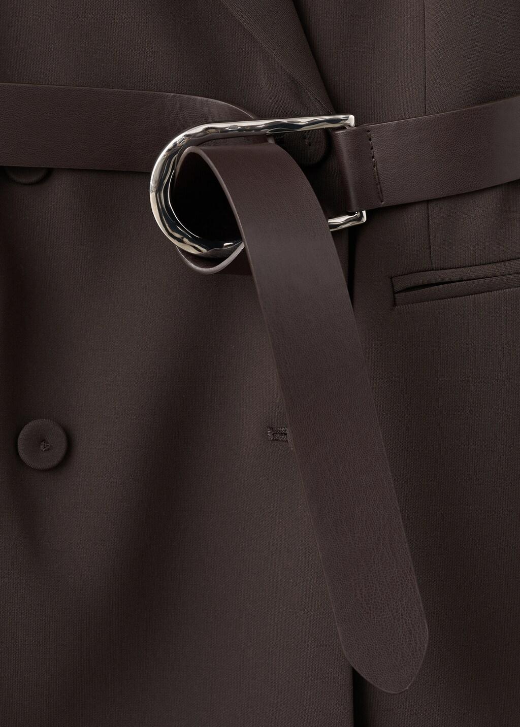 Estilo traje. Diseño corto. Diseño recto. Cuello pico con solapa. Solapas con muesca. Manga larga. Bolsillo de ribete en el pecho. Dos bolsillos de ribete laterales. Cinturón con cierre de hebilla. Cierre de doble botonadura. Forro interior. Esta prenda forma parte de nuestra colección casual, diseñada para acompañarte con estilo en tu día a día