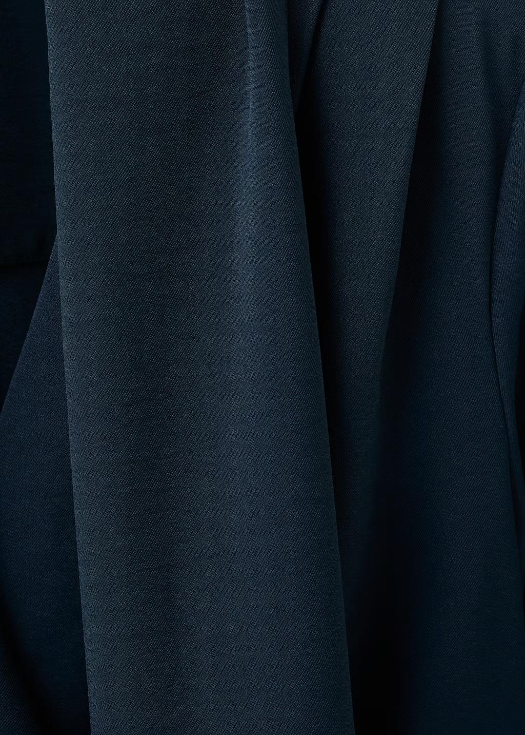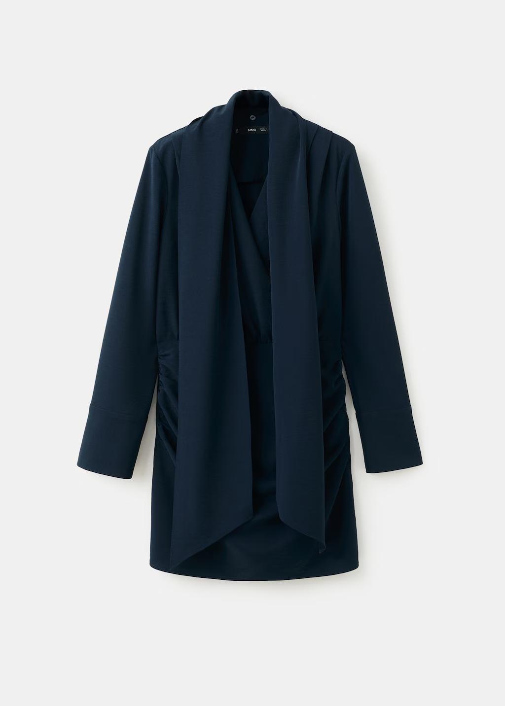 Diseño corto. Diseño entallado. Adorno de fular en el cuello. Manga larga. Detalle drapeado en la cintura. Cierre de cremallera lateral. Forro interior