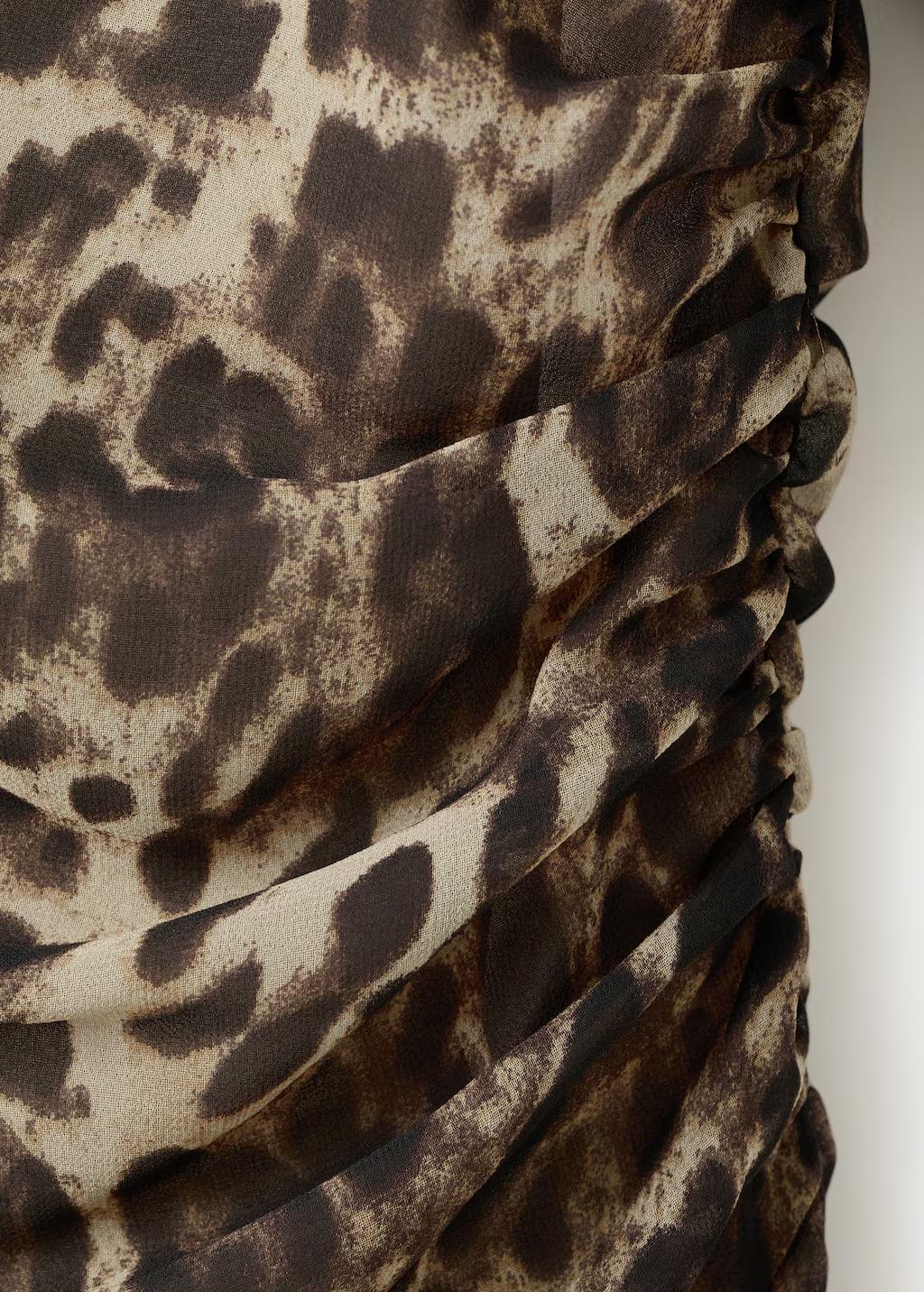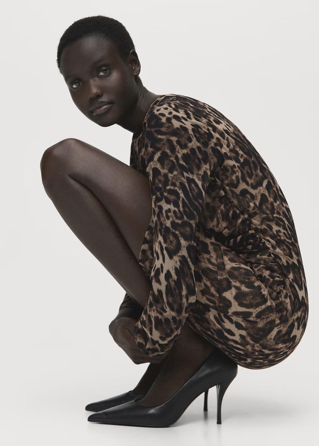 Diseño corto. Diseño entallado. Estampado animal print. Estampado de leopardo. Cuello redondo. Manga larga. Detalle fruncido en la cintura. Cierre de cremallera en la parte posterior. Forro interior. Esta prenda pertenece a nuestra colección de fiesta y evento, diseñada para elevar tus looks en ocasiones especiales