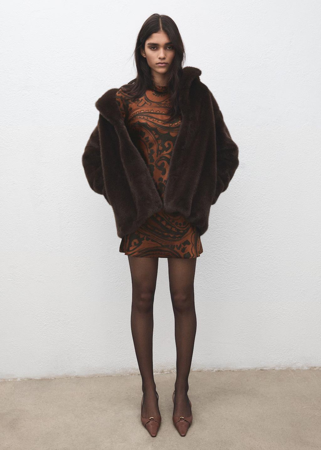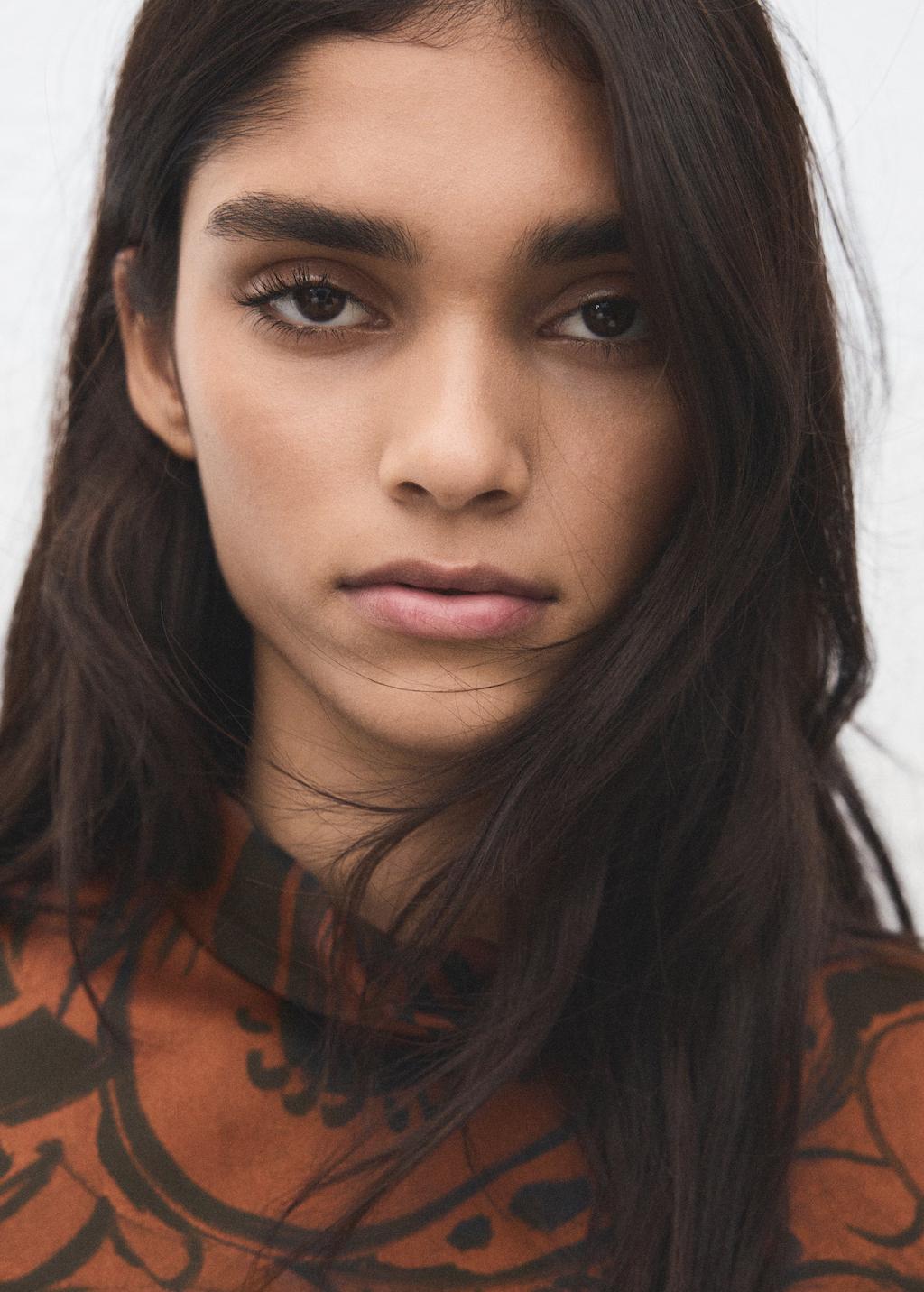 Tejido fluido con acabado satinado. Diseño recto. Diseño corto. Estampado Paisley. Cuello alto. Manga larga. Cierre de cremallera en la parte posterior. Disponible Plus
