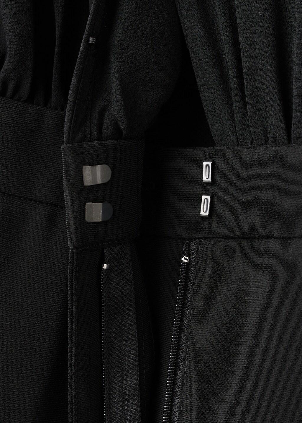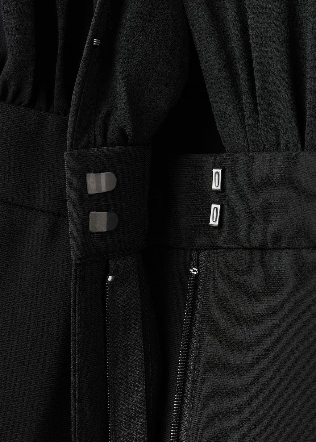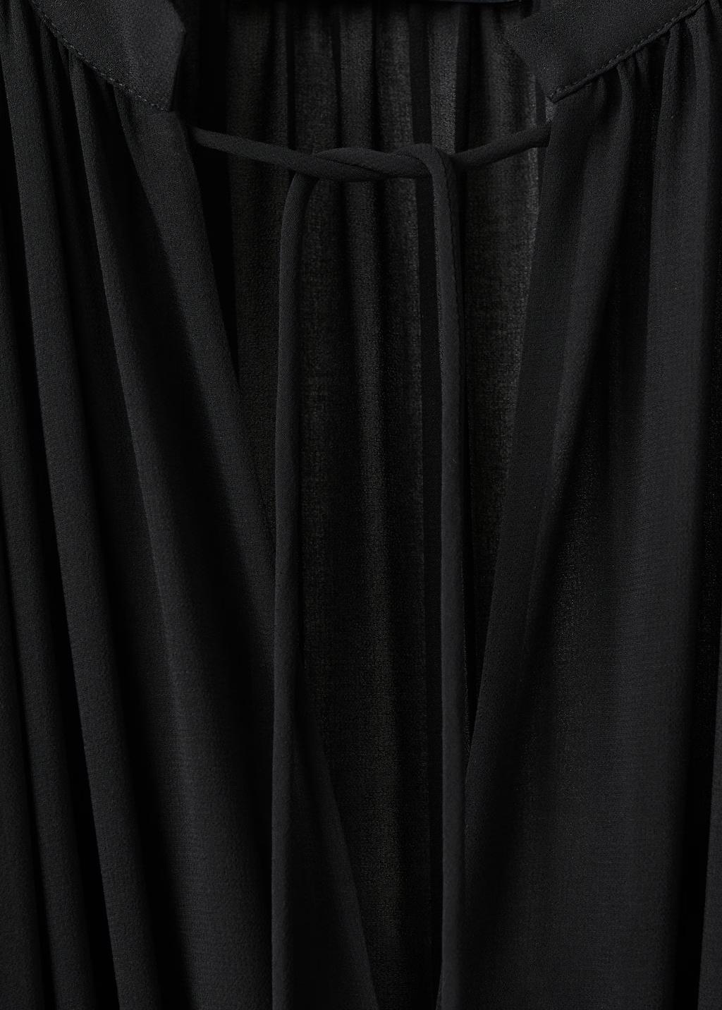 Tejido combinado. Diseño largo. Diseño recto. Cuello de pico. Manga larga. Cierre de lazo en el cuello. Cierre oculto de botón, gancho y cremallera. Esta prenda pertenece a nuestra colección de fiesta y evento, diseñada para elevar tus looks en ocasiones especiales