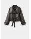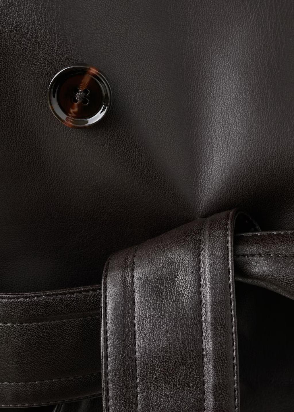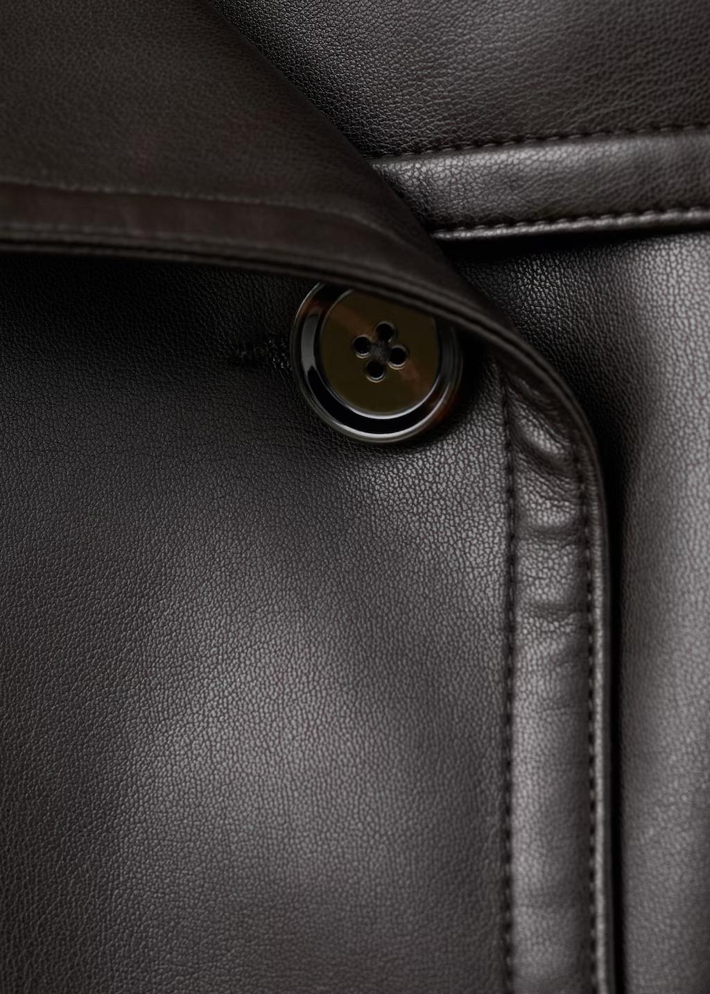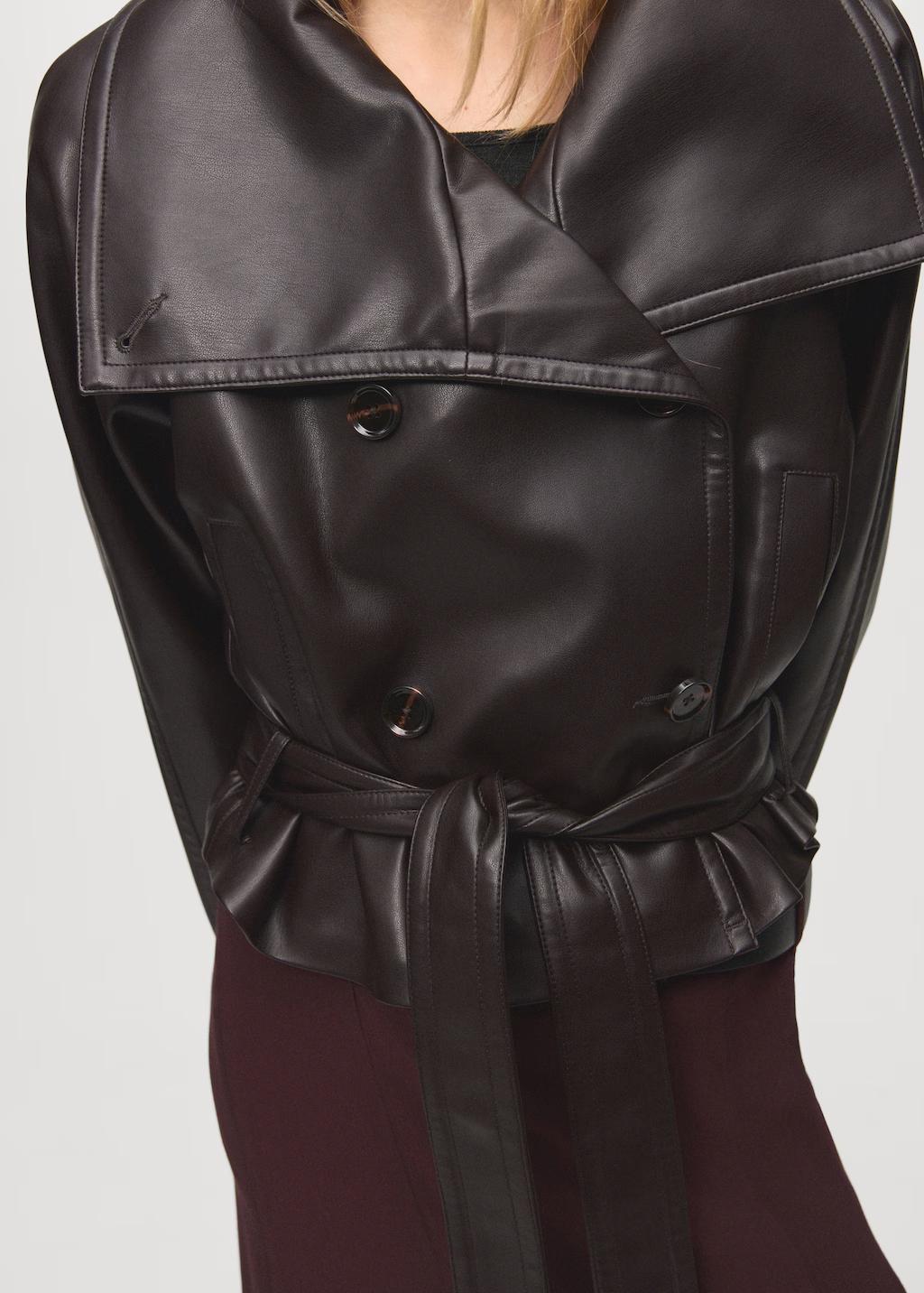 Efecto piel. Diseño oversize. Diseño corto. Cuello cruzado con solapa. Solapas amplias. Manga larga con puños abotonados. Dos bolsillos laterales. Cierre de doble botonadura. Cinturón tipo batín. Forro interior. Exclusivo Online
