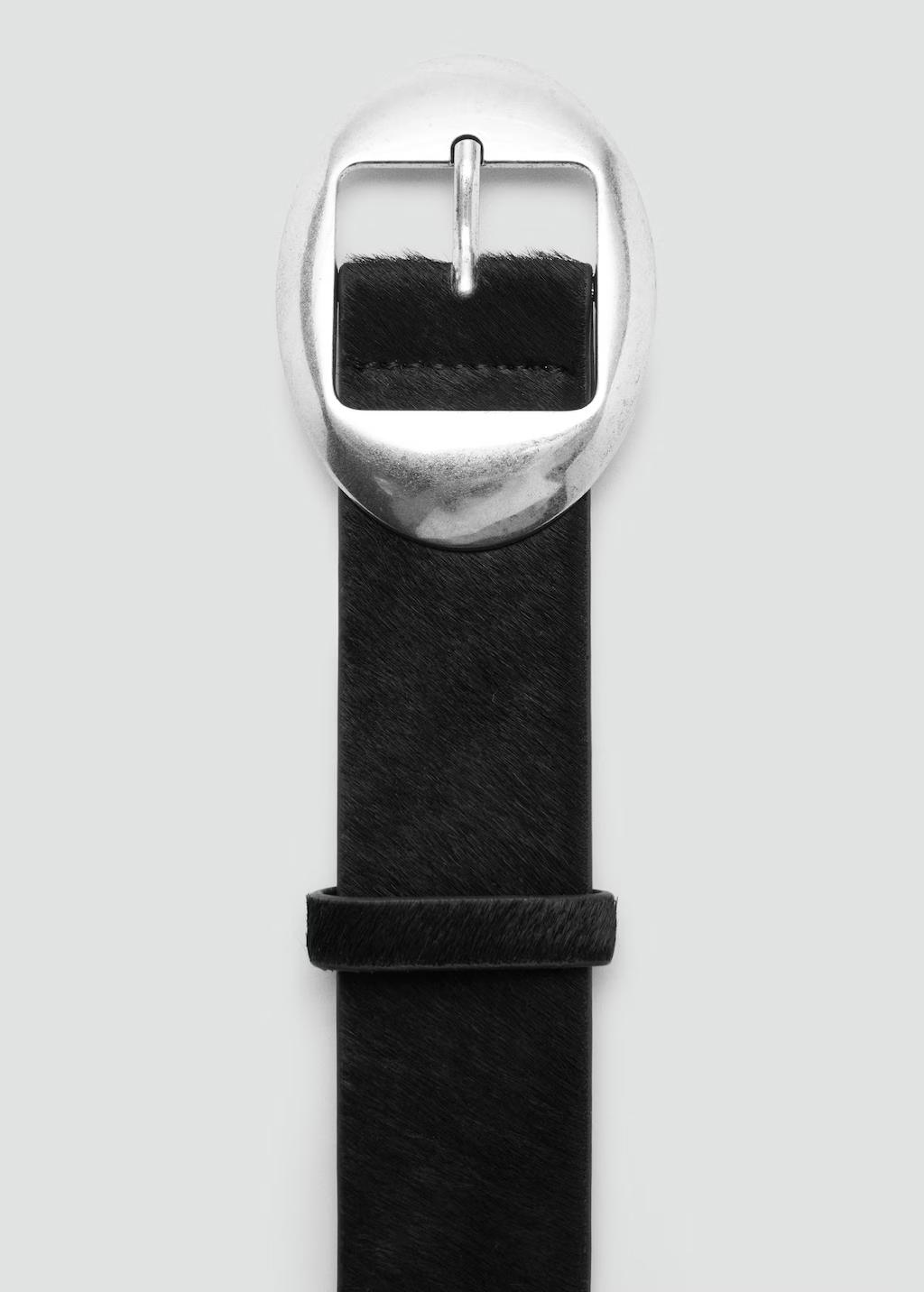 100% piel bovino con pelo. Diseño ancho. Diseño ovalado. Cierre de hebilla
