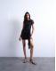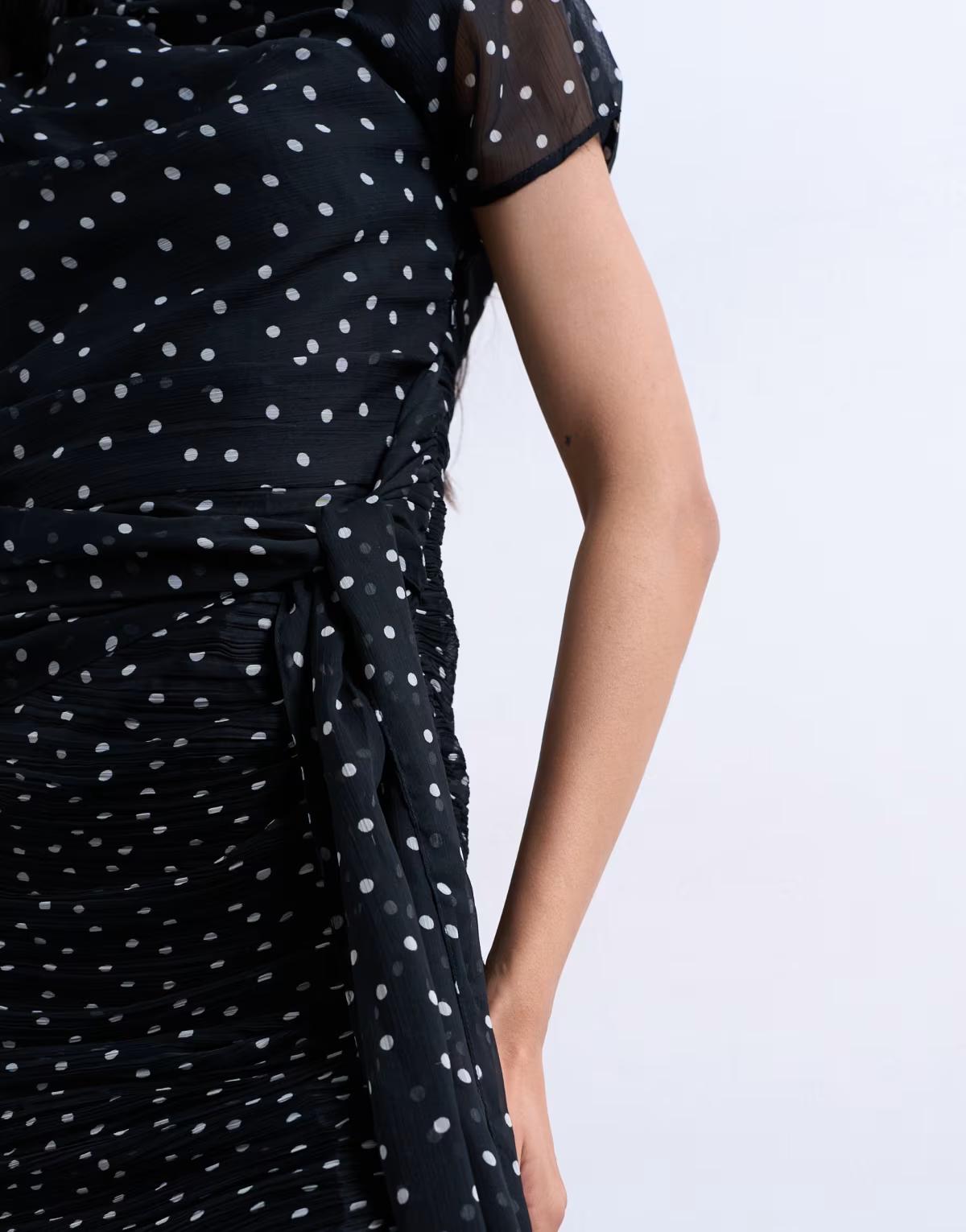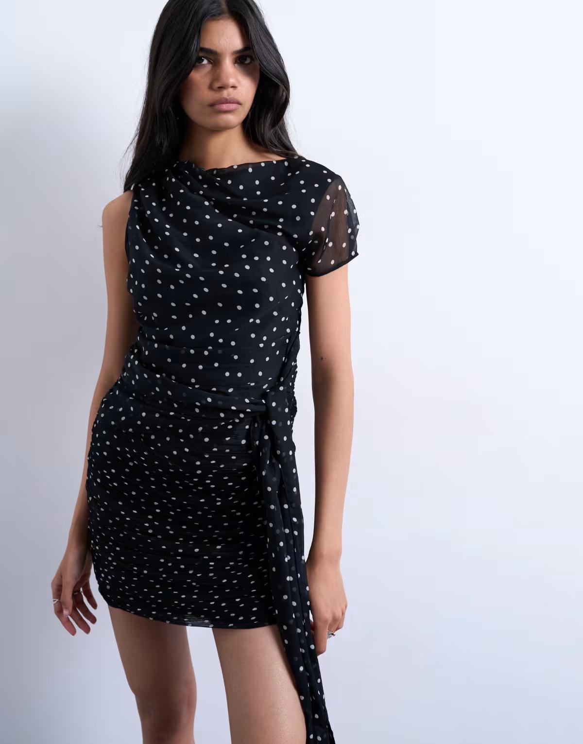 The dress is crafted from a woven fabric with a mono-spot print. The sleeveless style features a boat neck, asymmetric sleeves, drape detailing and is cut to a regular fit.