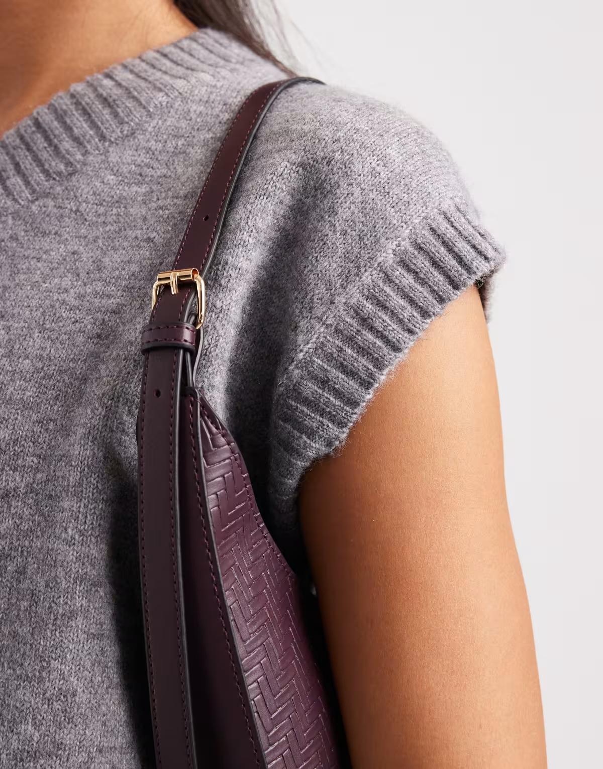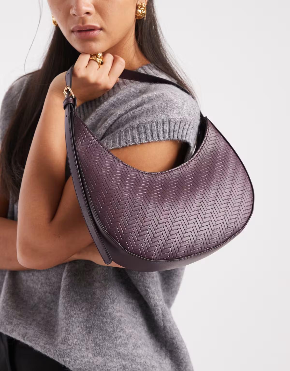 ASOS DESIGN asymmetric scoop shoulder bag with buckle detail in burgundy weave