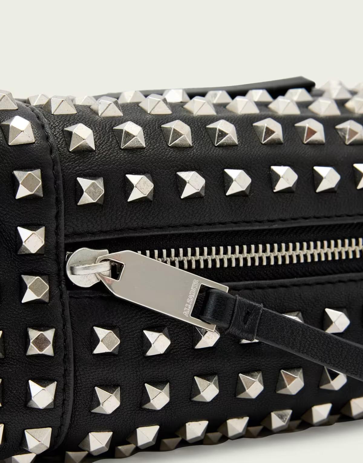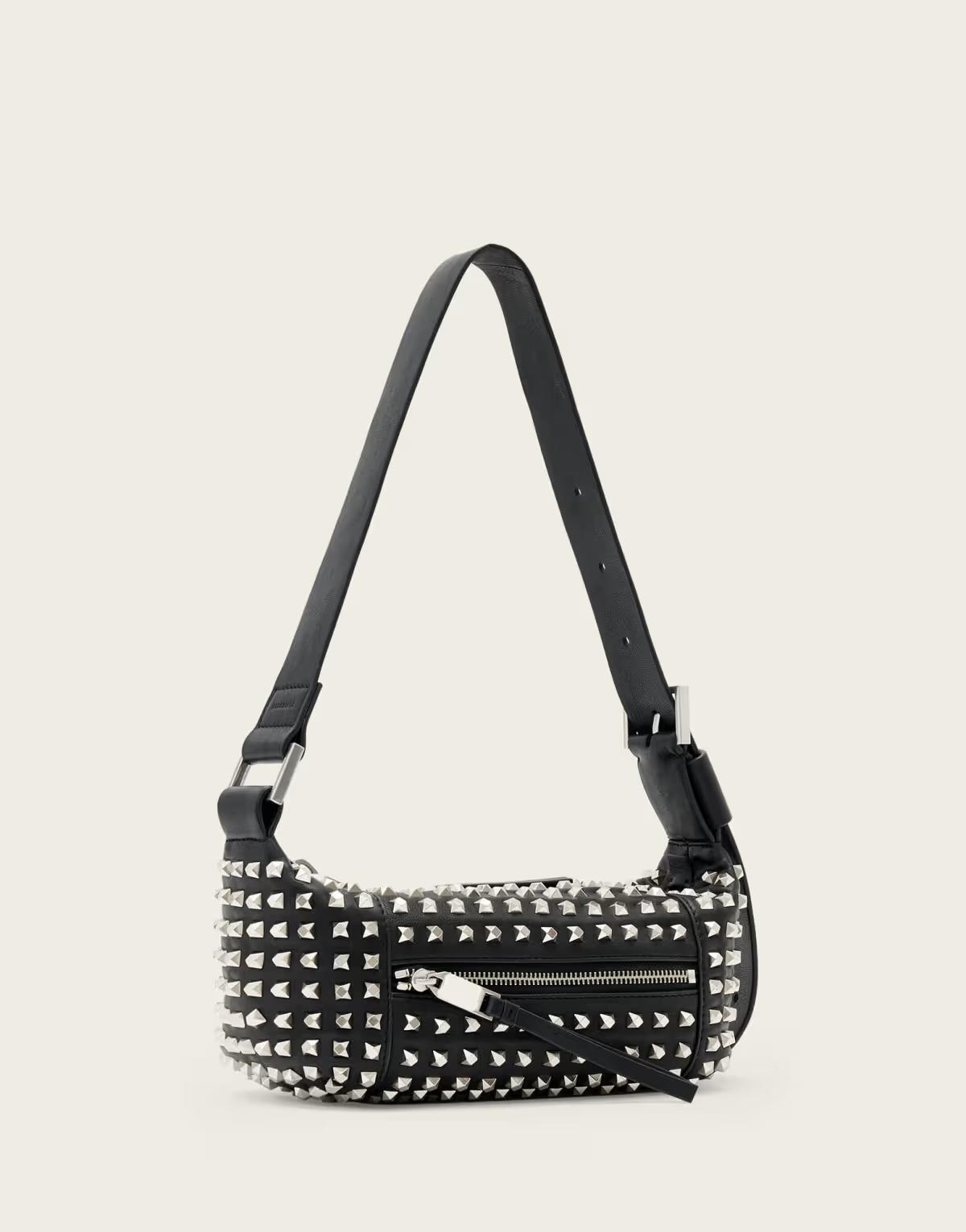 AllSaints Vega mini leather studded shoulder bag in black/silver