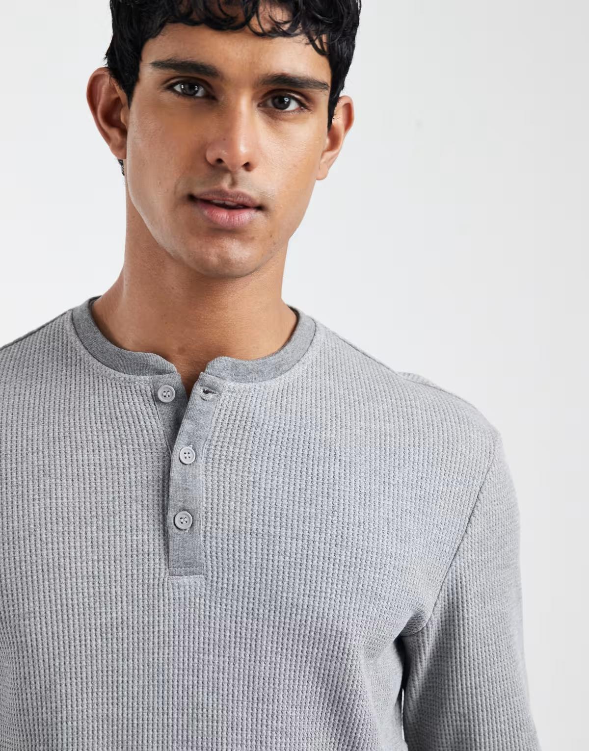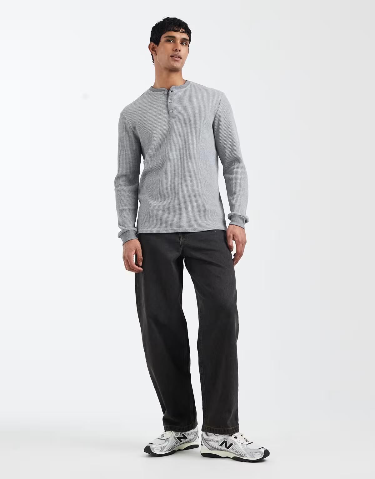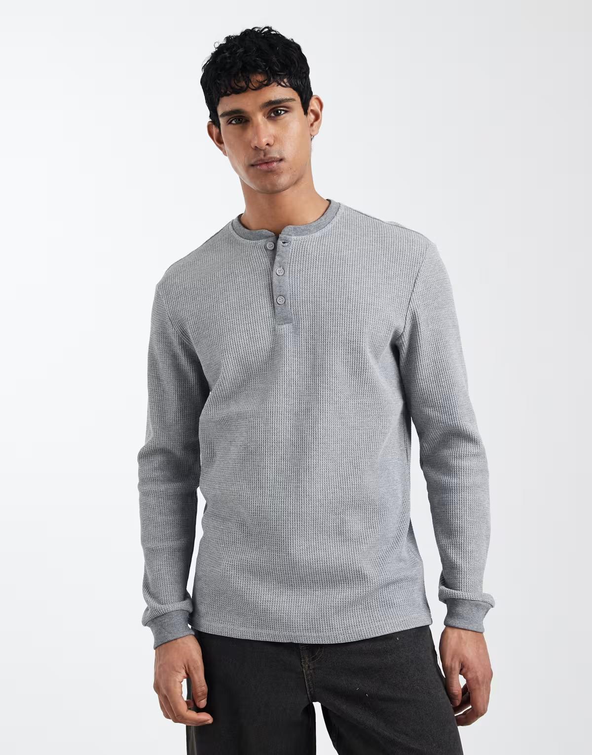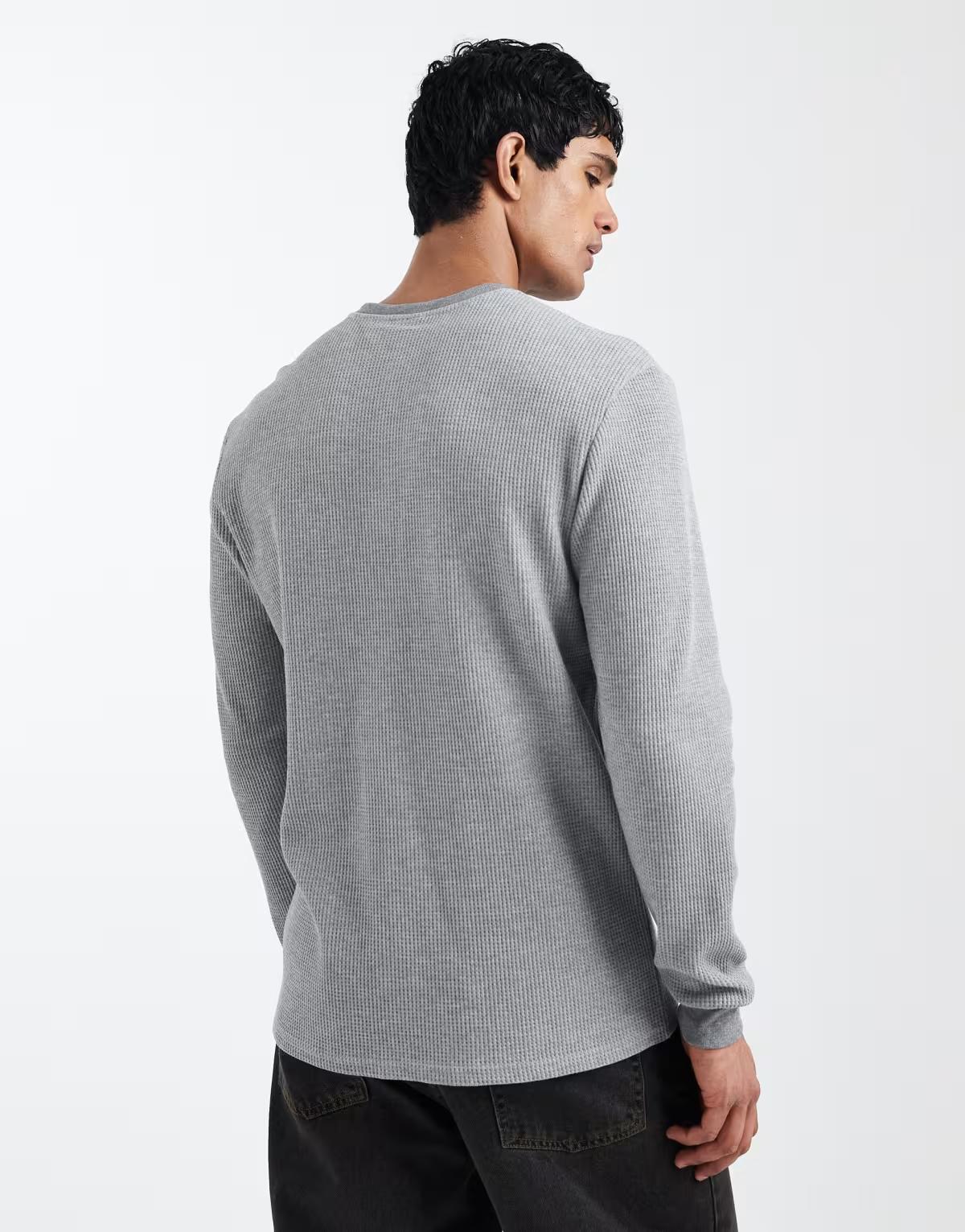 ONLY & SONS long sleeve henley t-shirt in light grey waffle
