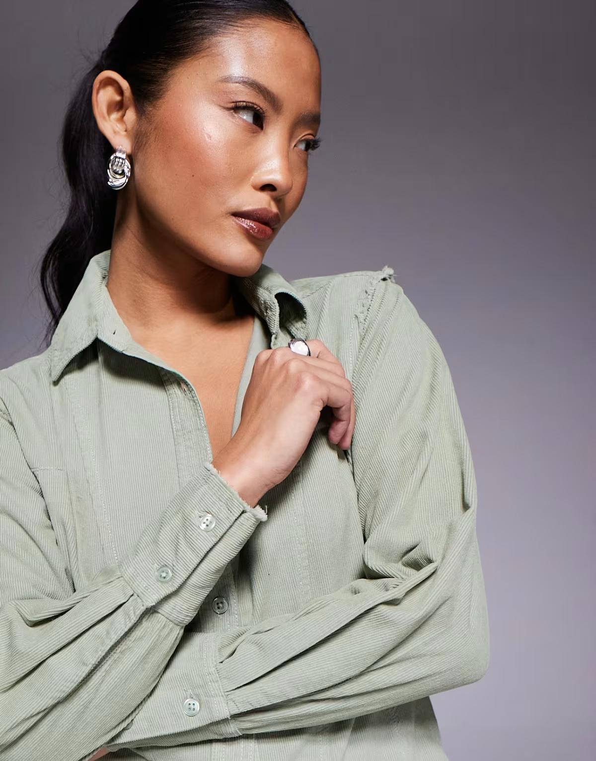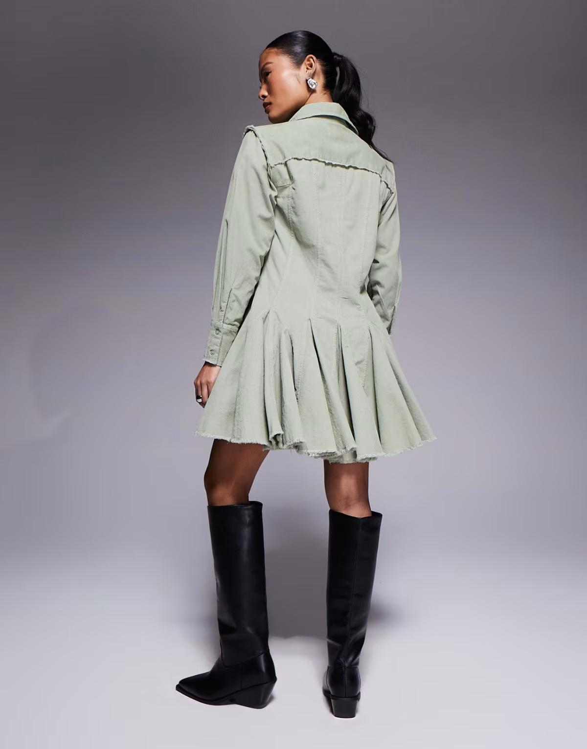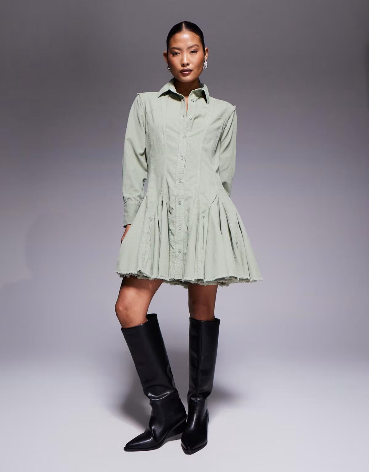 ASOS DESIGN Petie cord shirt dress with nipped in waist and godets in sage