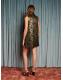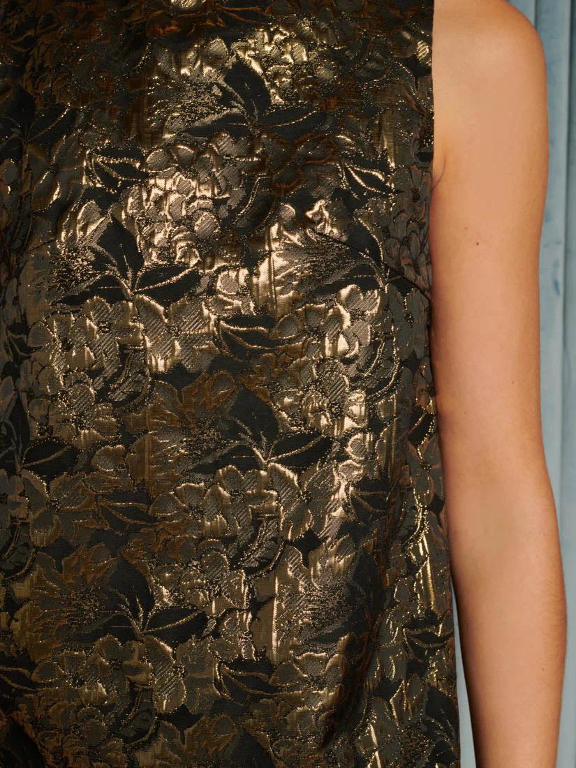 The Memoria Jacquard Mini Dress evokes bygone glamour, with a back bow that ties the story together. Metallic florals shimmer as though caught between past and present.