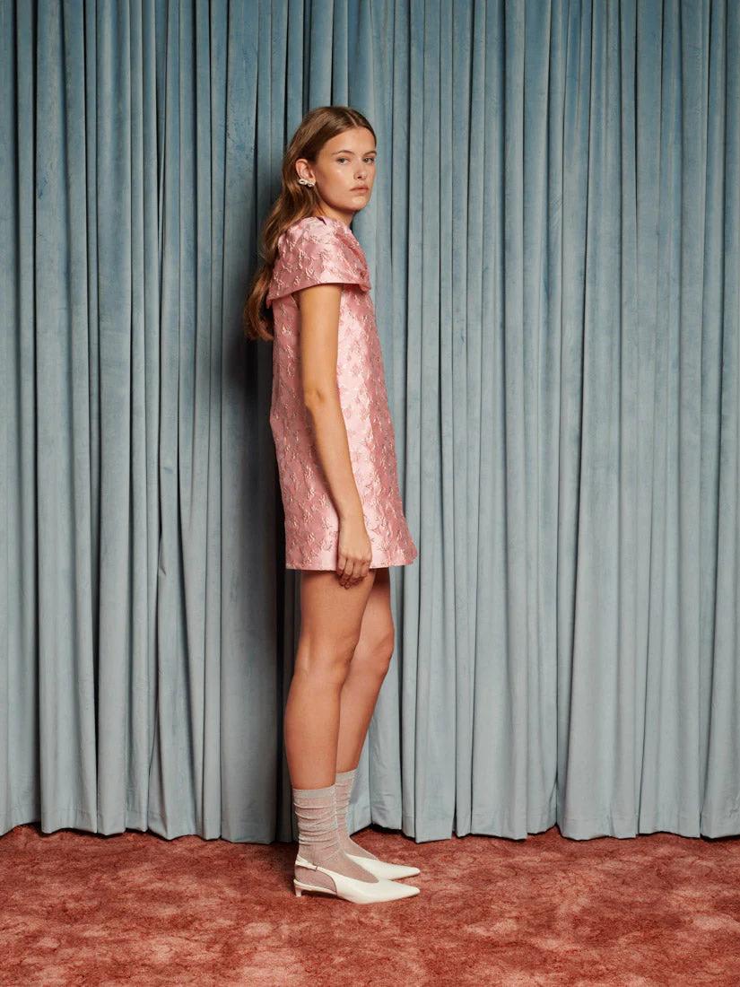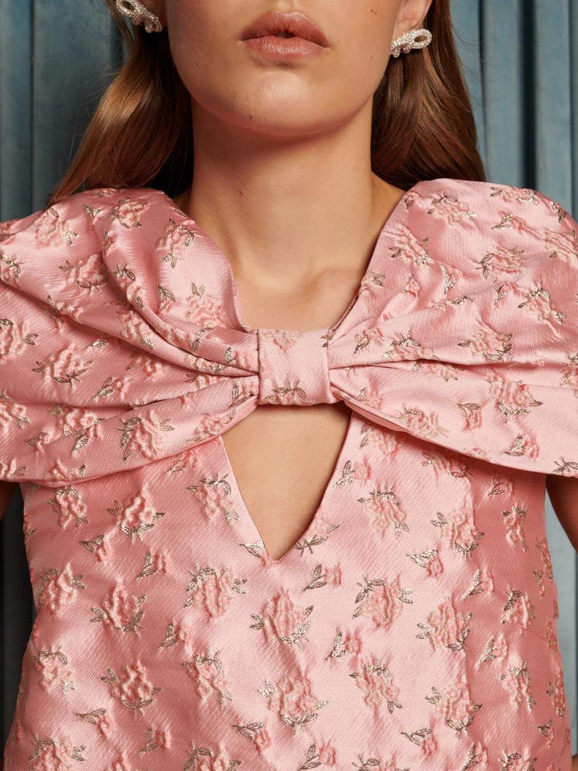 The Cameo Cape Mini Dress is a showstopper, a metallic floral jacquard with a matching bow cape that flutters like a curtain call. A dress designed for a dazzling encore.