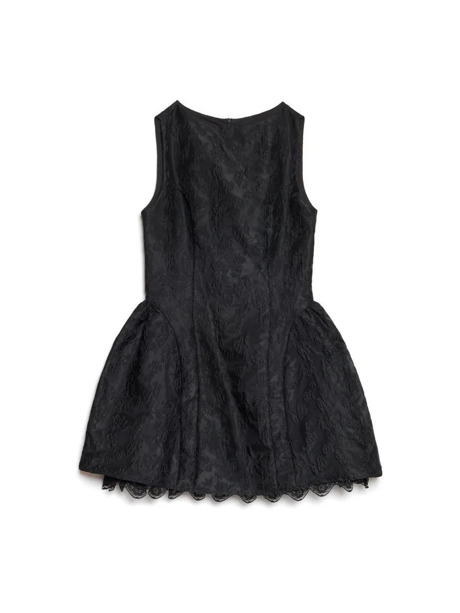 The Screenplay Jacquard Mini Dress shimmers like a moment from a classic film, its floral jacquard catching the light. Side gathers and a lace underlayer create a softly structured, cinematic silhouette.