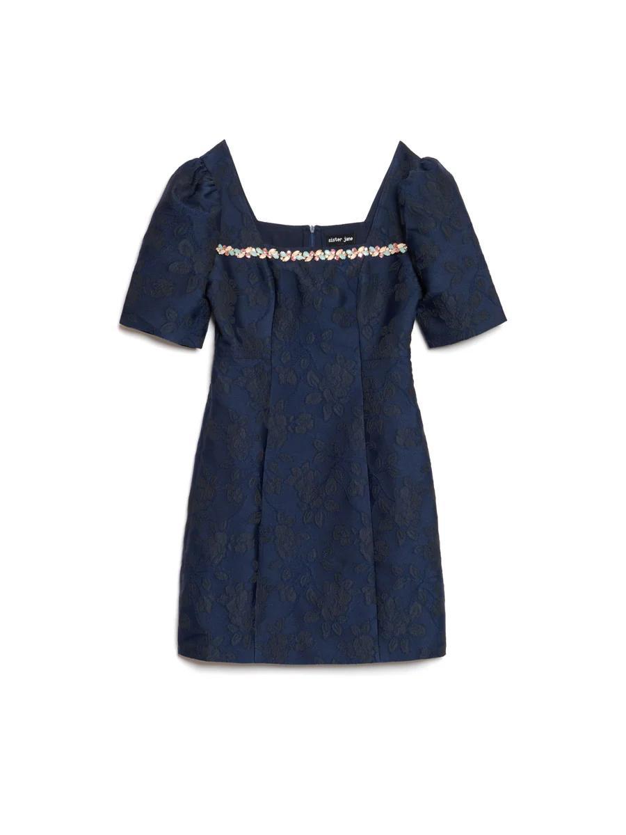 Every shimmer tells a story in the Frame Jacquard Mini Dress. Its gem trimmed square neckline frames the face like a portrait in motion-ready for its close-up. The details shine through the screen with the Wonder Bead Bag in hand.