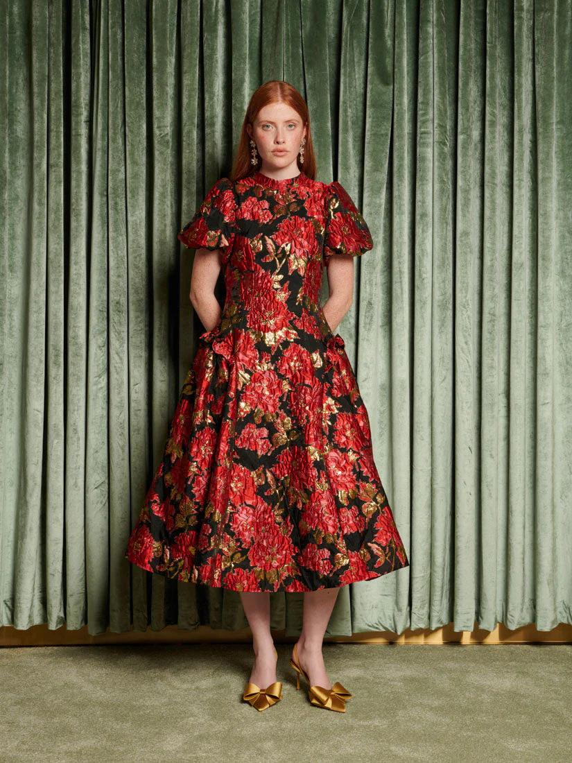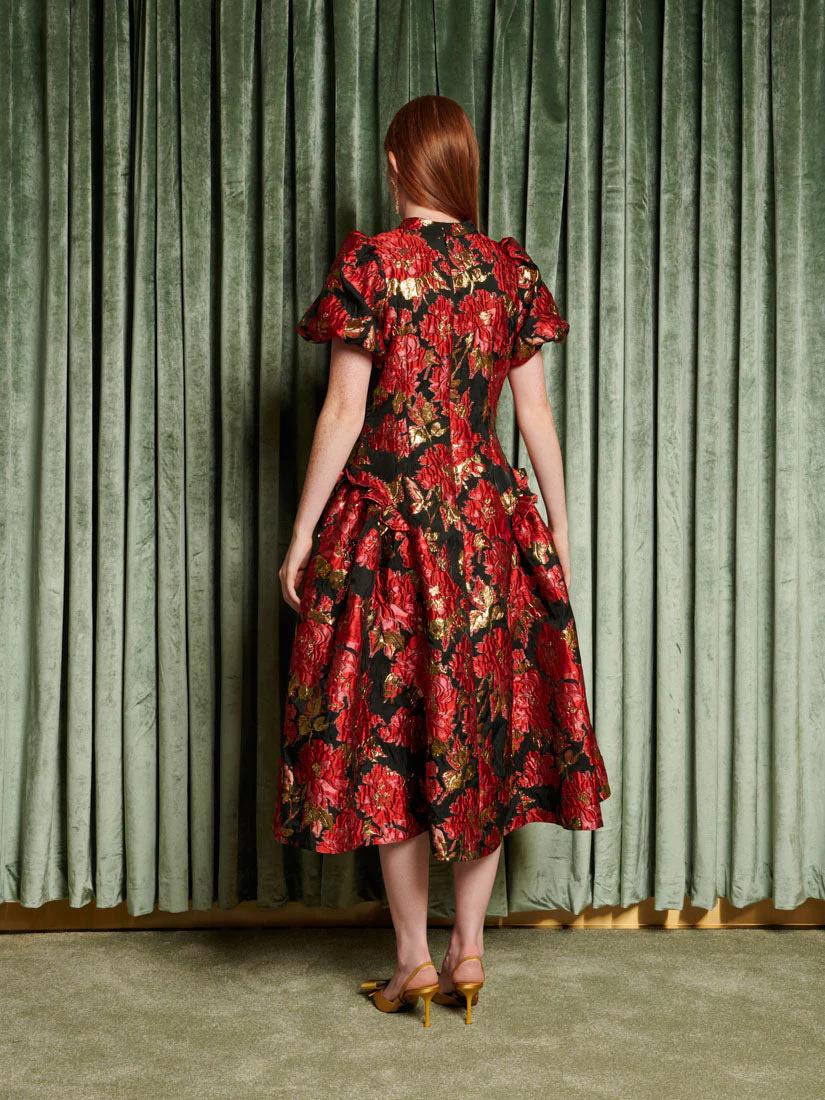This metallic jacquard midi catches the light like a breathtaking plot twist. Gathered side ruffles sculpt enchanting volume, while pockets hide the treasures of your imaginary worlds. Complete the cinematic experience with the Elsewhere Bead Bag.
