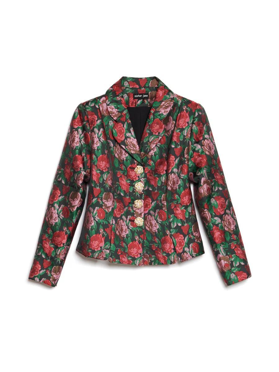 Step into the spotlight with the Fantasy Jacquard Cropped Blazer, where flowers bloom through a tapestry of illusion. Shimmering gold rose buttons close the scene, framing a fitted silhouette destined for cinematic moments. Make the fantasy come true by pairing with the Fantasy Jacquard Midi Skirt.