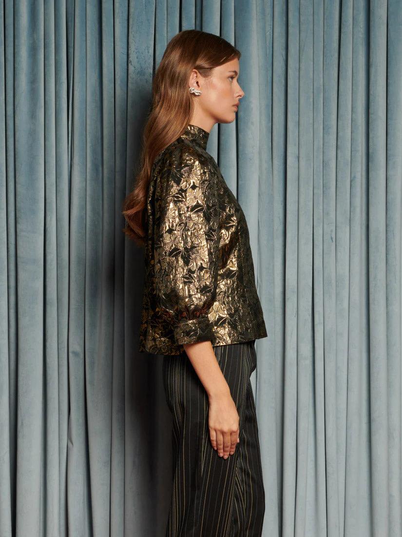 The Memoria Jacquard Top shimmers like a fragment from a forgotten film. Metallic florals flicker across puffed sleeves and a high neckline, evoking the splendour of grand illusions. A memory made visible, complete the scene with the Richie Stripe Tailored Trousers.
