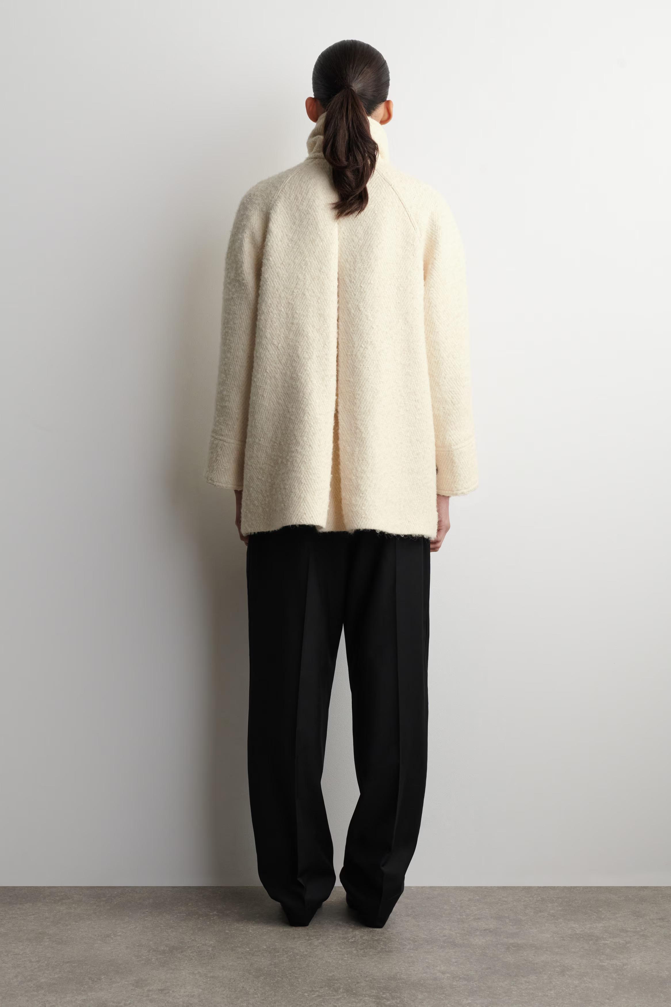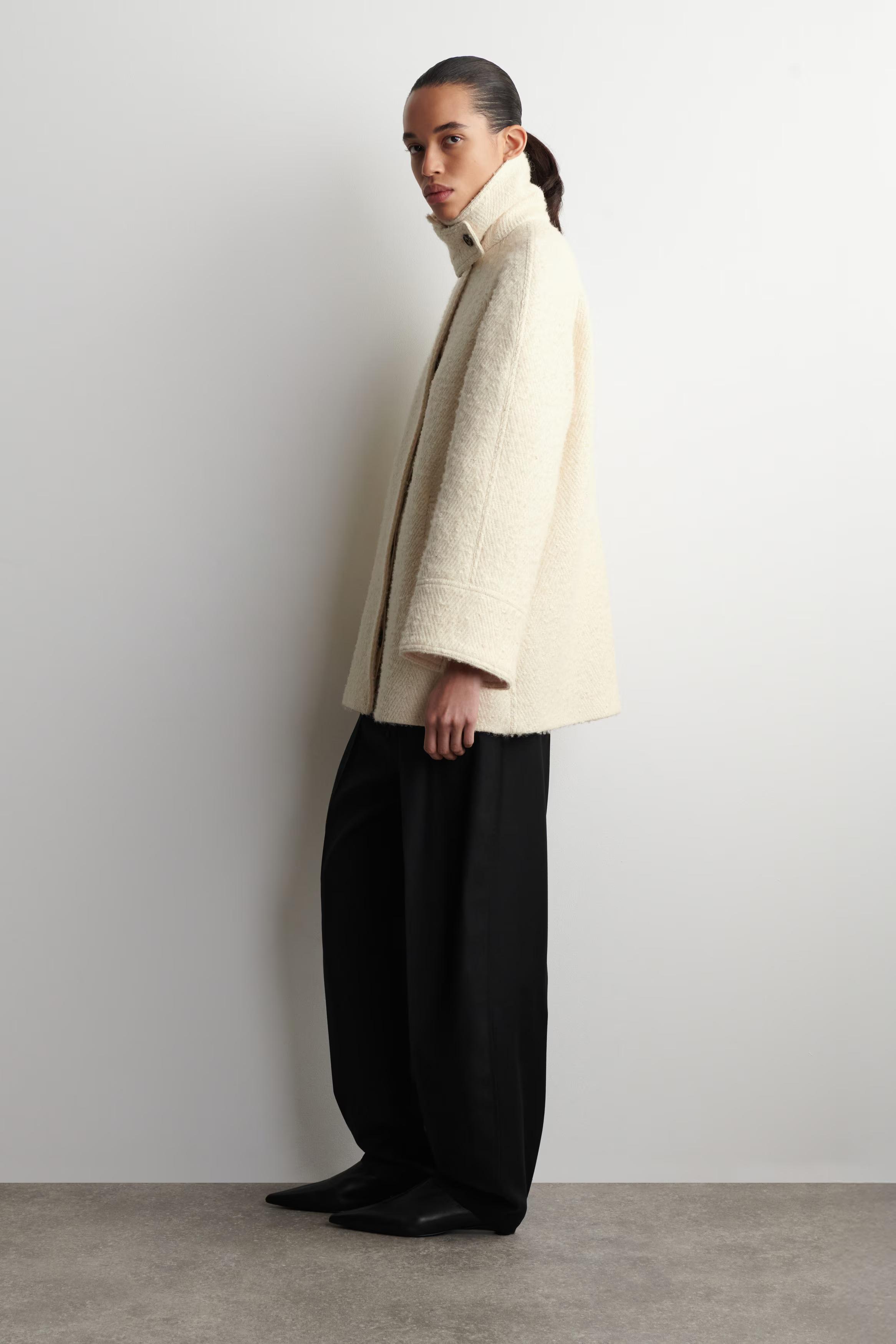 This season, the COS designers modernise heritage codes for the city wardrobe. Cut in a classic shape, this short coat is crafted from richly textured wool-blend herringbone and features a throat latch that transforms the collar into a funnel neck. It's finished with wide welt pockets and a voluminous box pleat at the back.\u0026nbsp;Regular fitButton closureRecycled wool is made from yarn-spinning waste, yarn overstock, production-cutting waste and post-consumer garments \u0026ndash; creating new pieces without wasteThis product contains Responsible Wool Standard TE-00047206 (RWS) wool fibre from farms certified to animal welfare and land-management requirements\u0026nbsp;Shell: 32% Cotton, 29% Recycled wool, 20% RWS wool, 12% Polyamide (Nylon), 7% Other fibres. Lining: 100% Viscose. Excluding trims / Dry clean\u0026nbsp;Back length of size S is 75.7cm / Model wears a size S