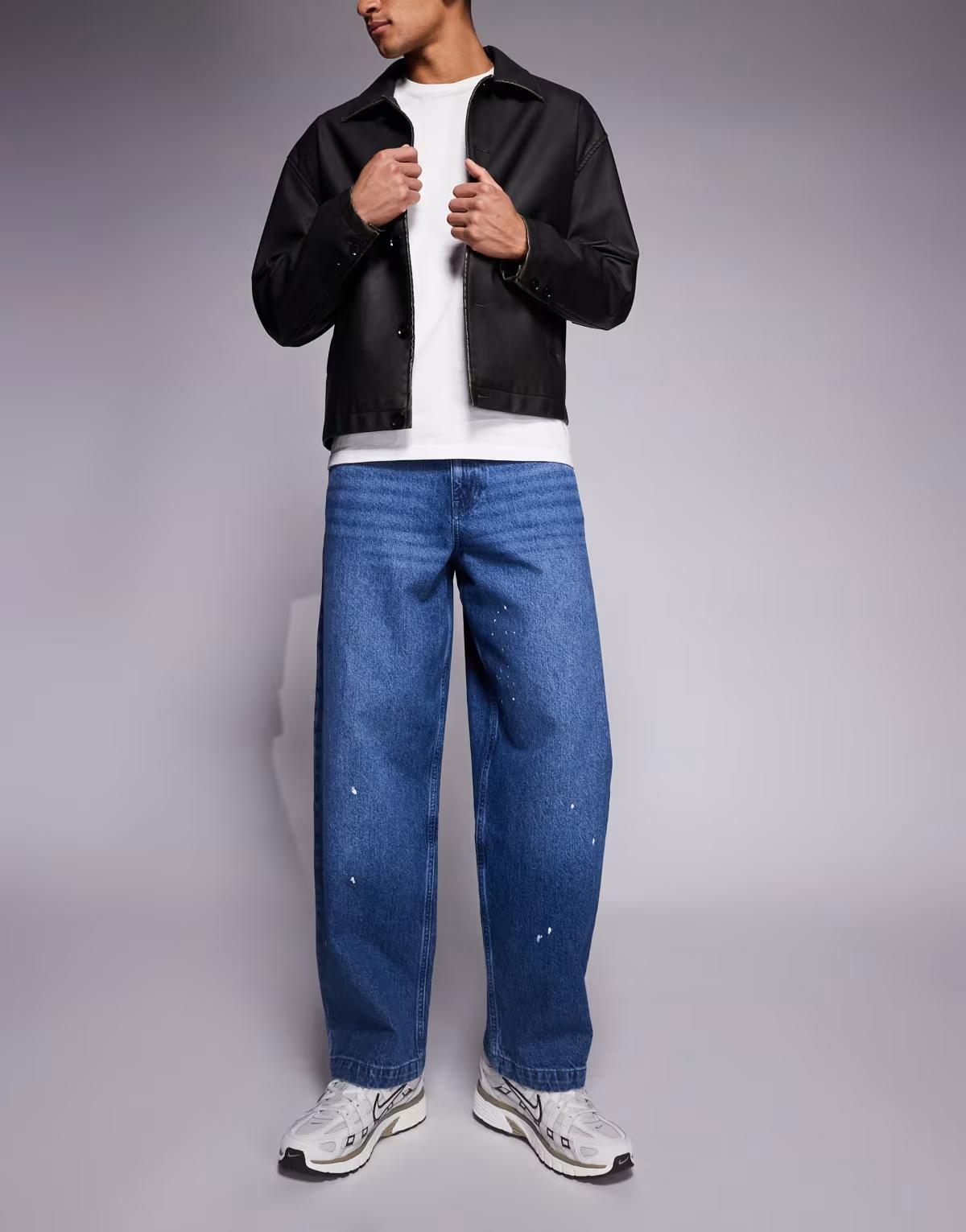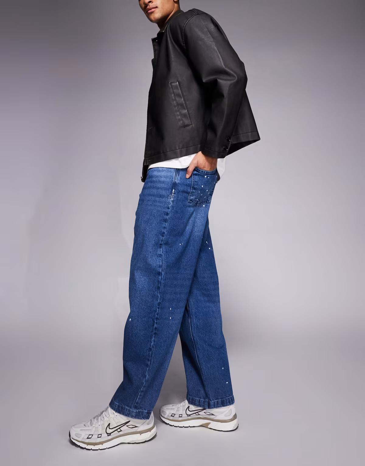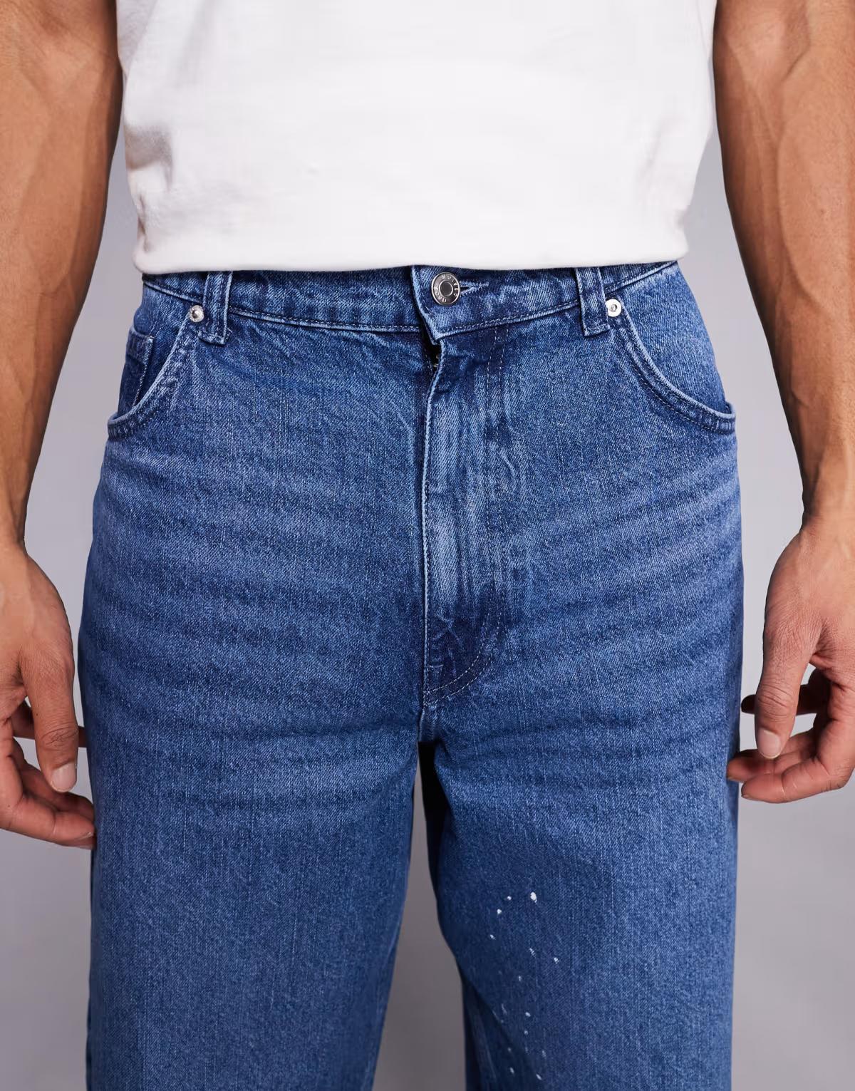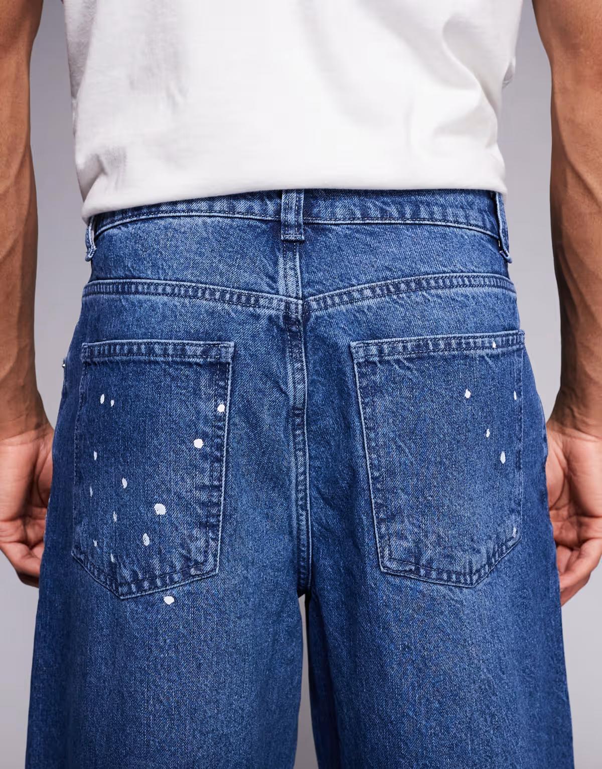 ASOS DESIGN loose straight midwash jean with paint splatter
