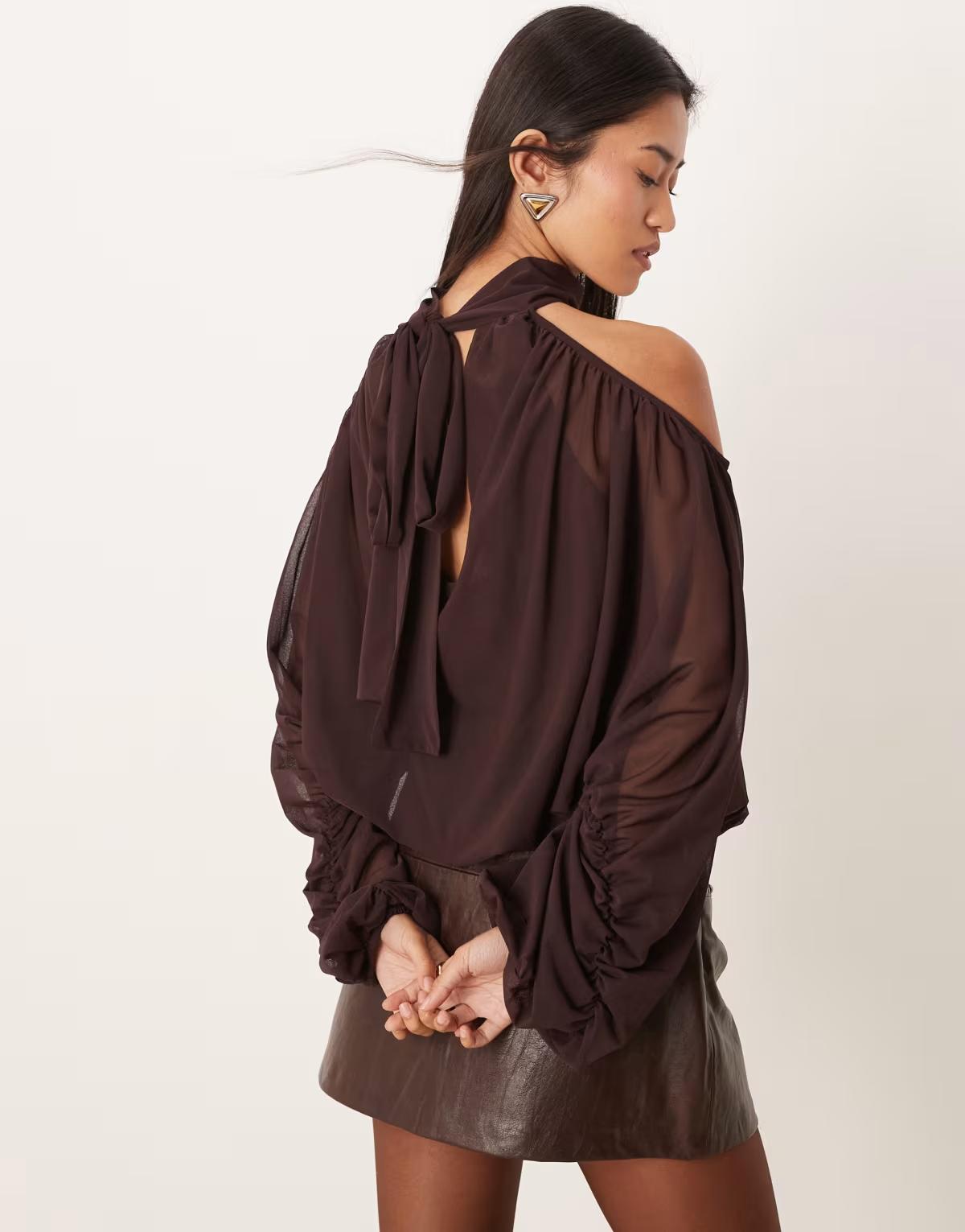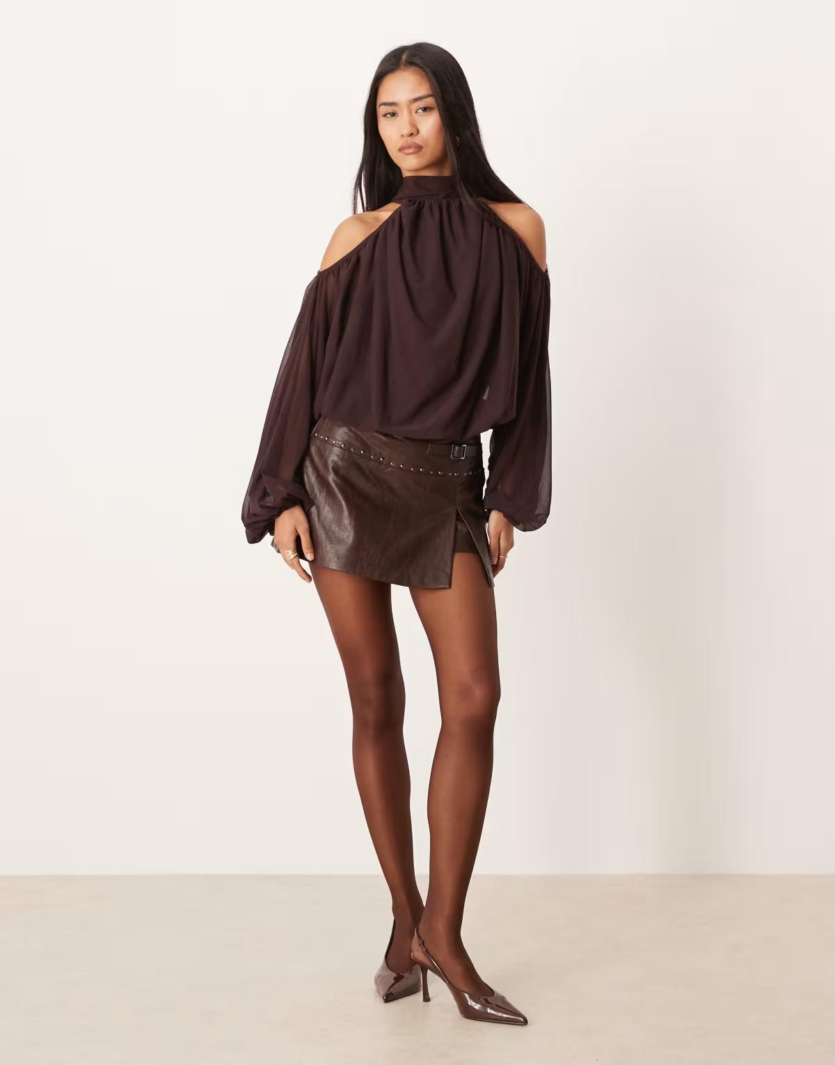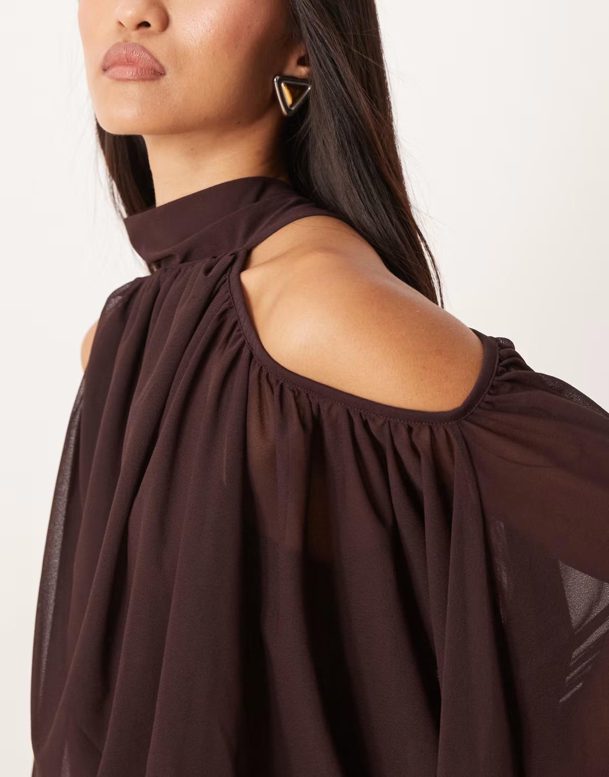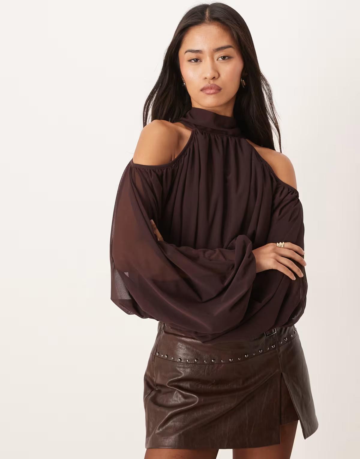 Gina Tricot high neck cold shoulder blouse in chocolate brown