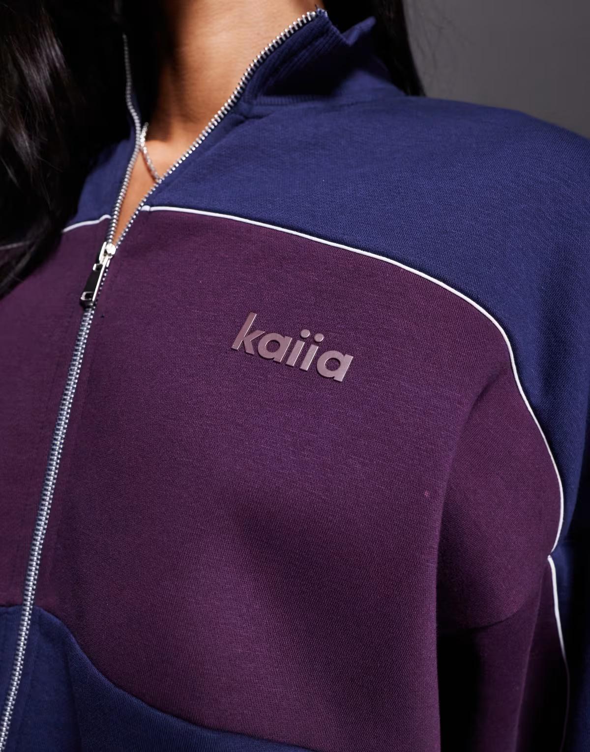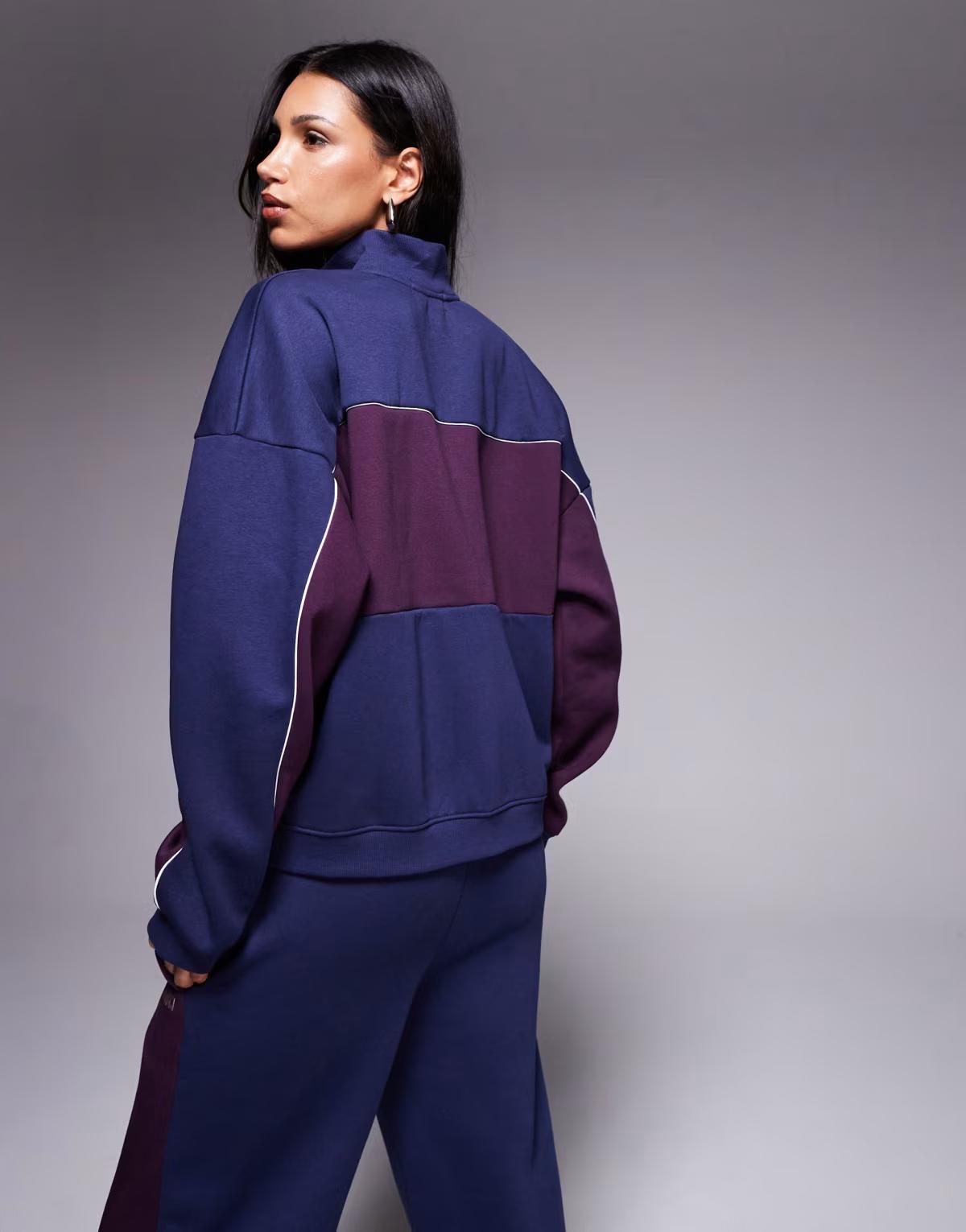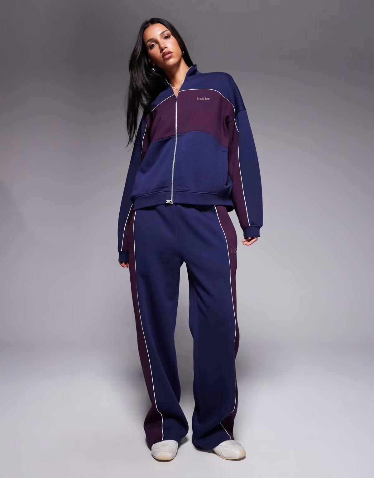 Kaiia cotton rich contrast stripe oversized zip through sweatshirt co-ord in navy and burgundy