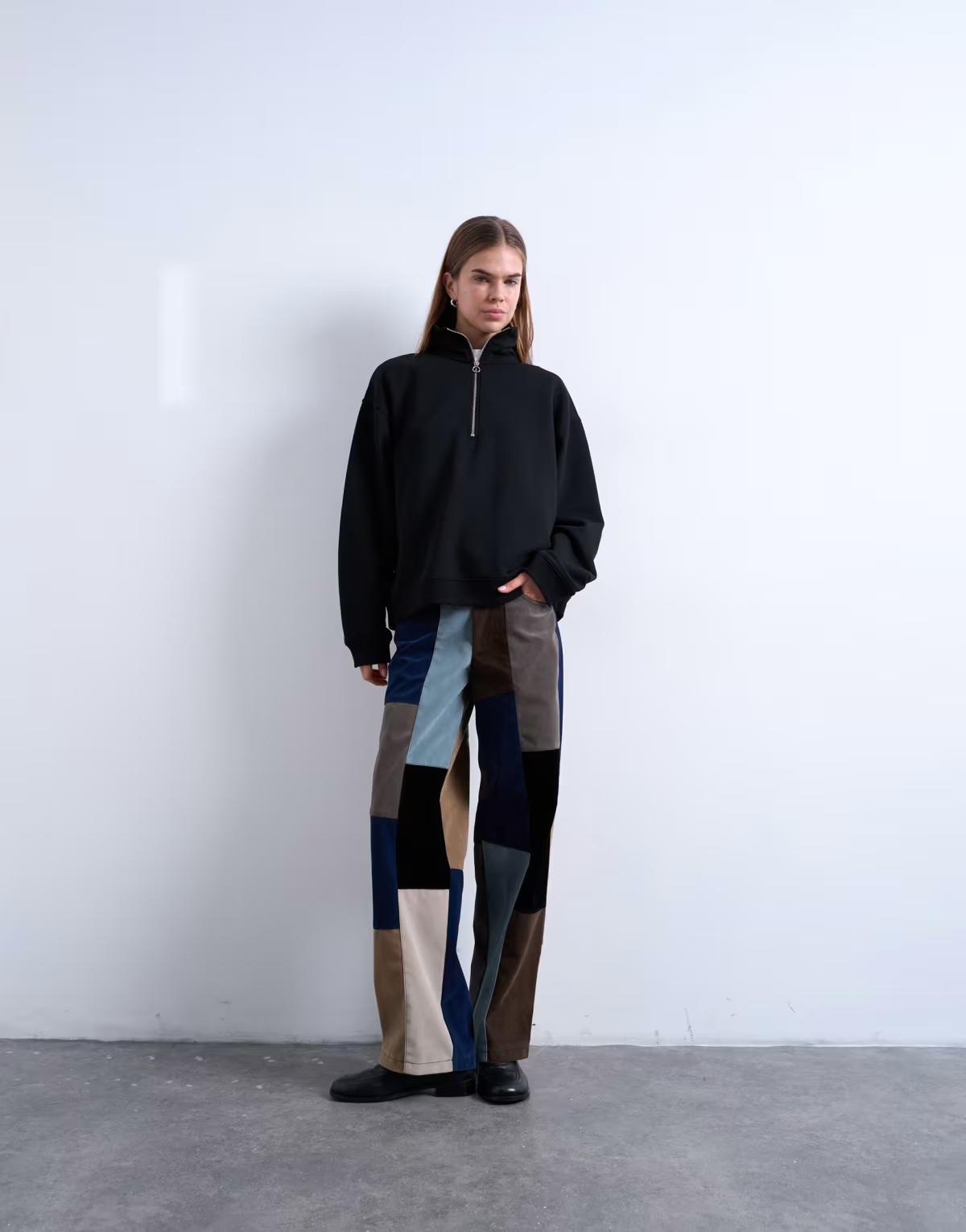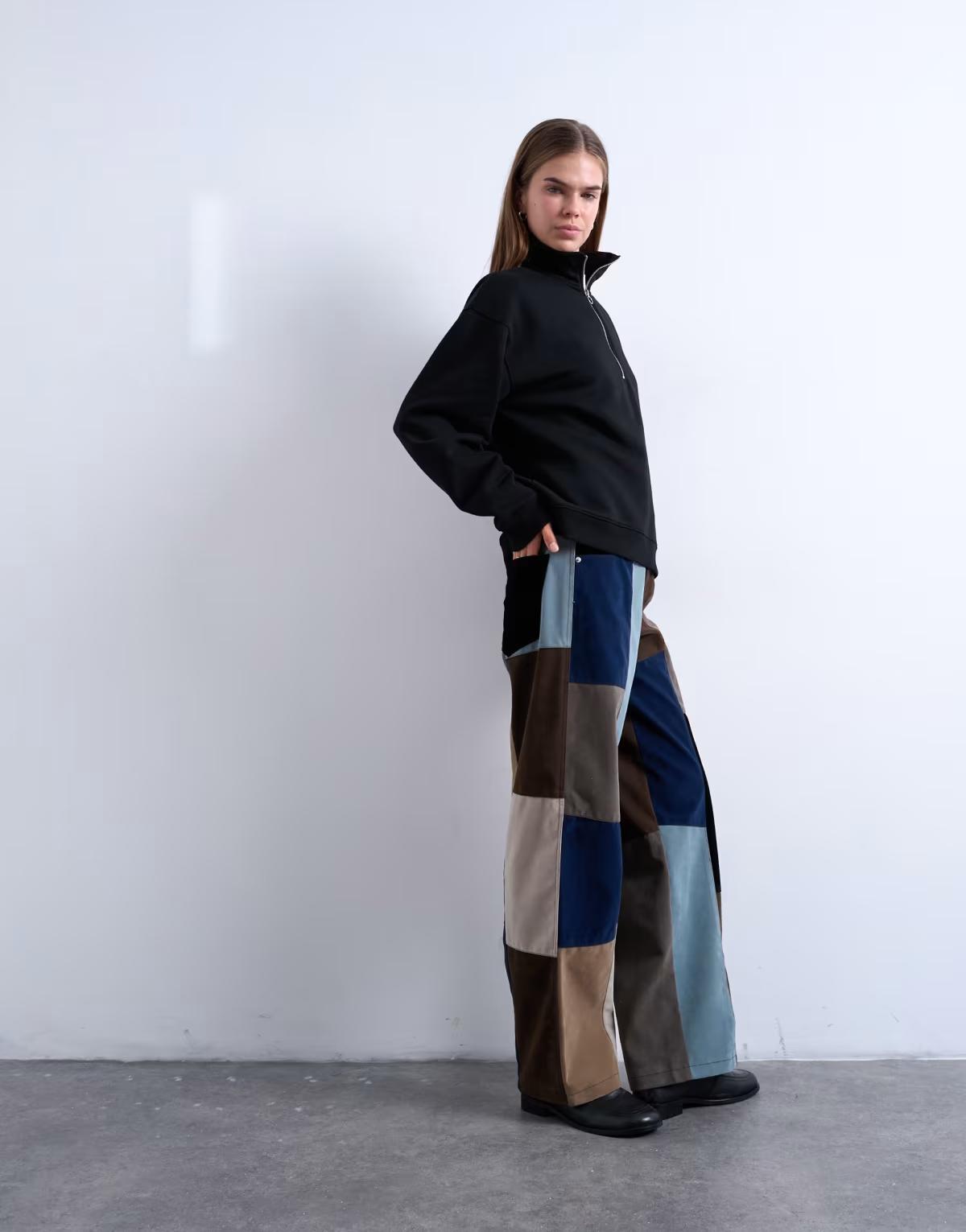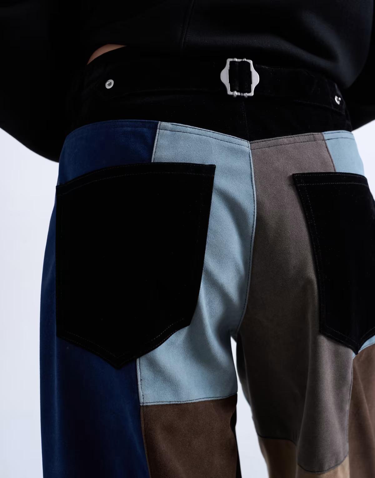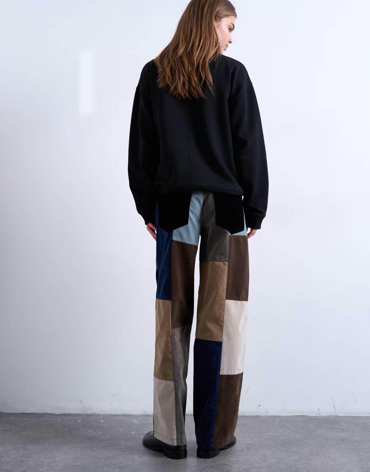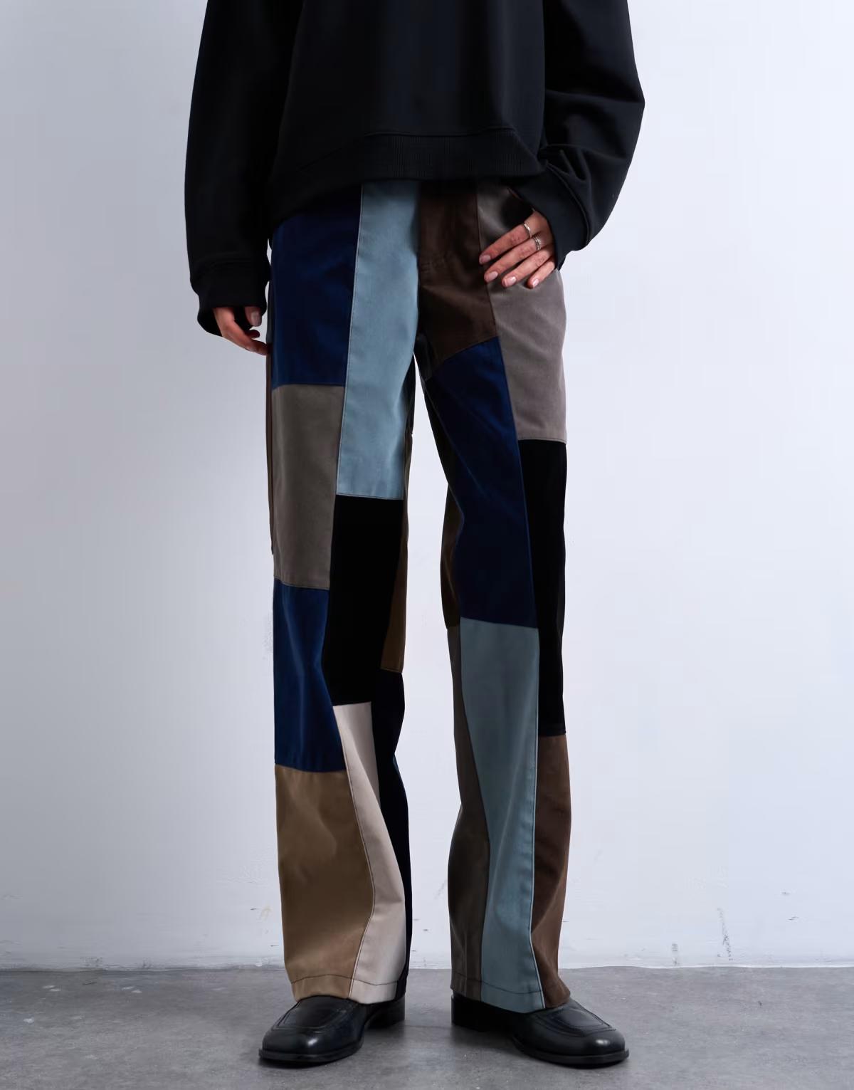 These trousers are crafted from a soft, textured fabric with a patchwork design. They feature an adjustable waist and are cut to a wide leg.