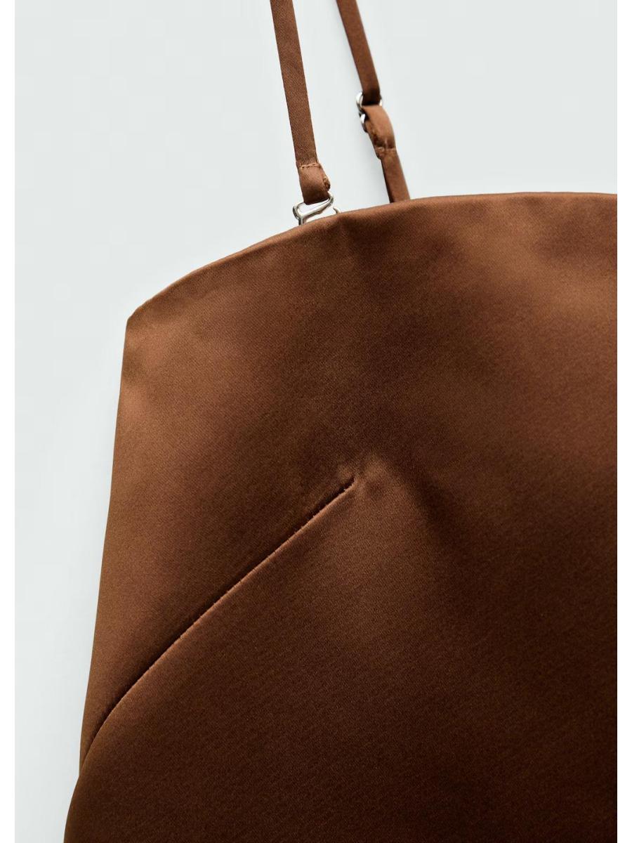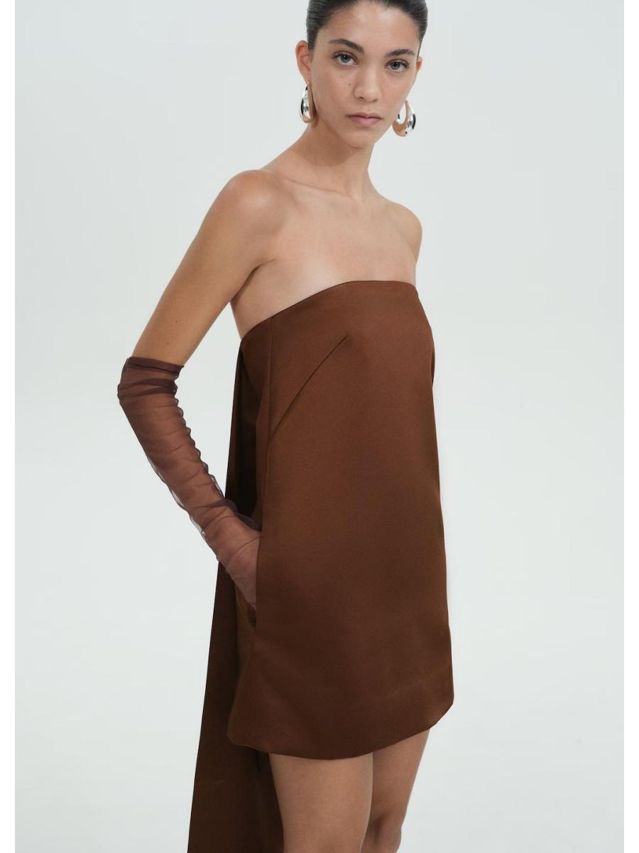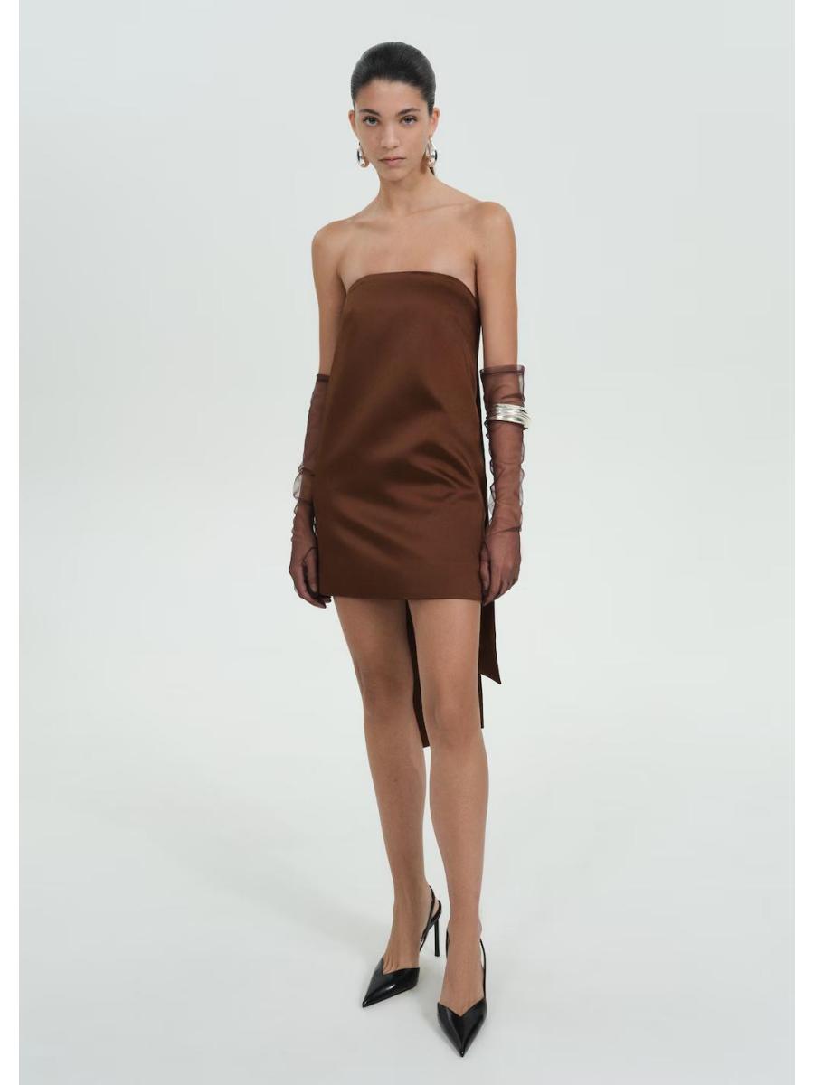 Tejido satinado. Diseño corto. Diseño recto. Palabra de honor. Tirantes ajustables desmontables. Cierre cremallera invisible en el lateral. Colección fiesta y ceremonia. Colección Selection. Tiras en la parte posterior. Una selección de prendas refinadas, confeccionadas con tejidos de calidad para construir un armario femenino y contemporáneo