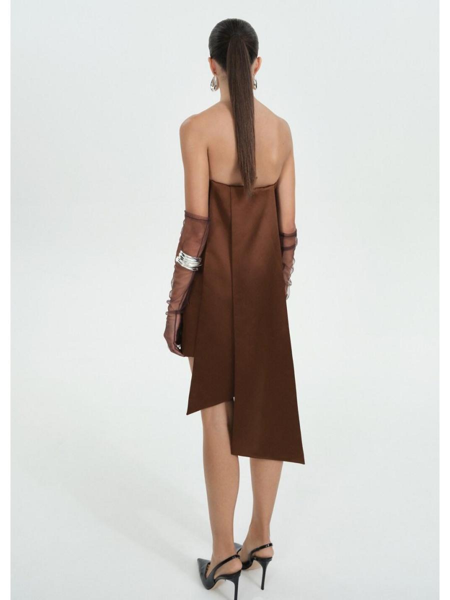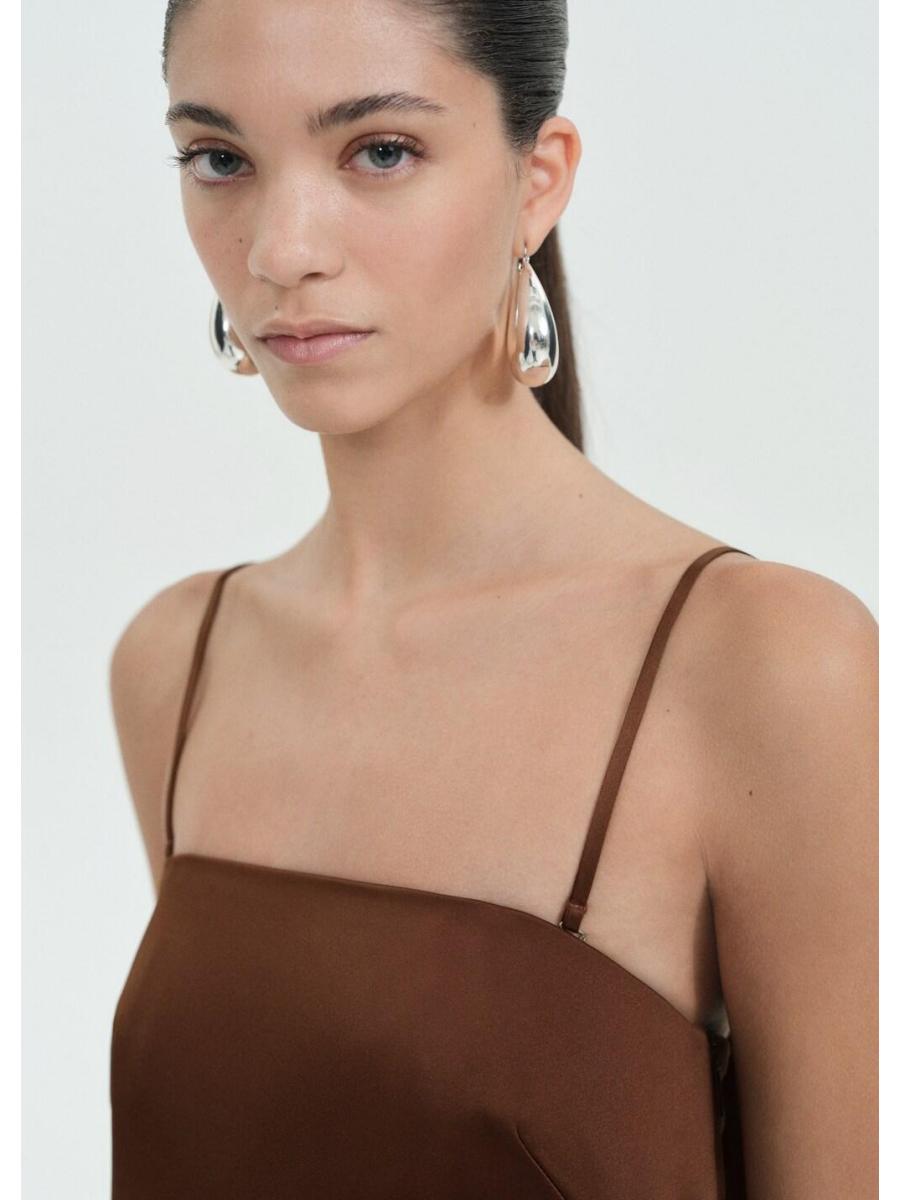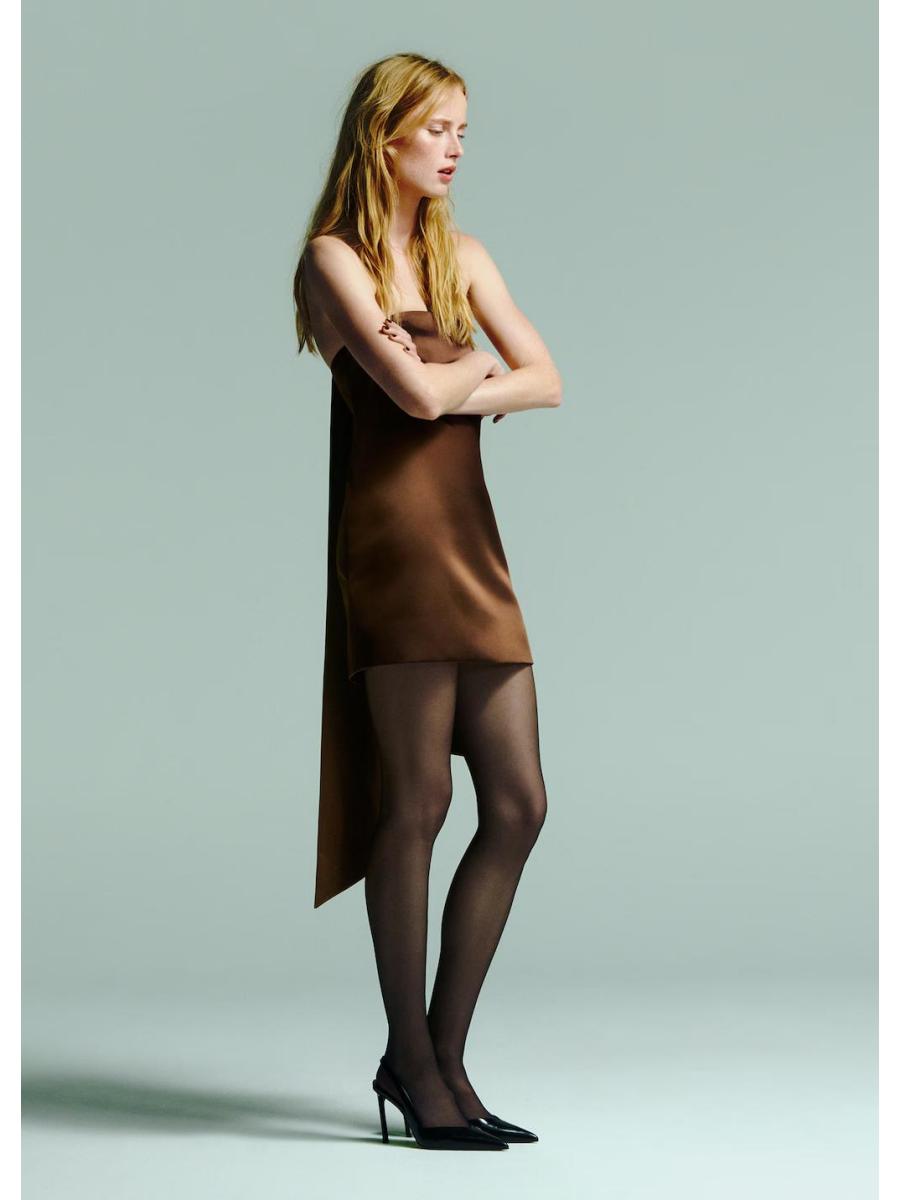 Tejido satinado. Diseño corto. Diseño recto. Palabra de honor. Tirantes ajustables desmontables. Cierre cremallera invisible en el lateral. Colección fiesta y ceremonia. Colección Selection. Tiras en la parte posterior. Una selección de prendas refinadas, confeccionadas con tejidos de calidad para construir un armario femenino y contemporáneo
