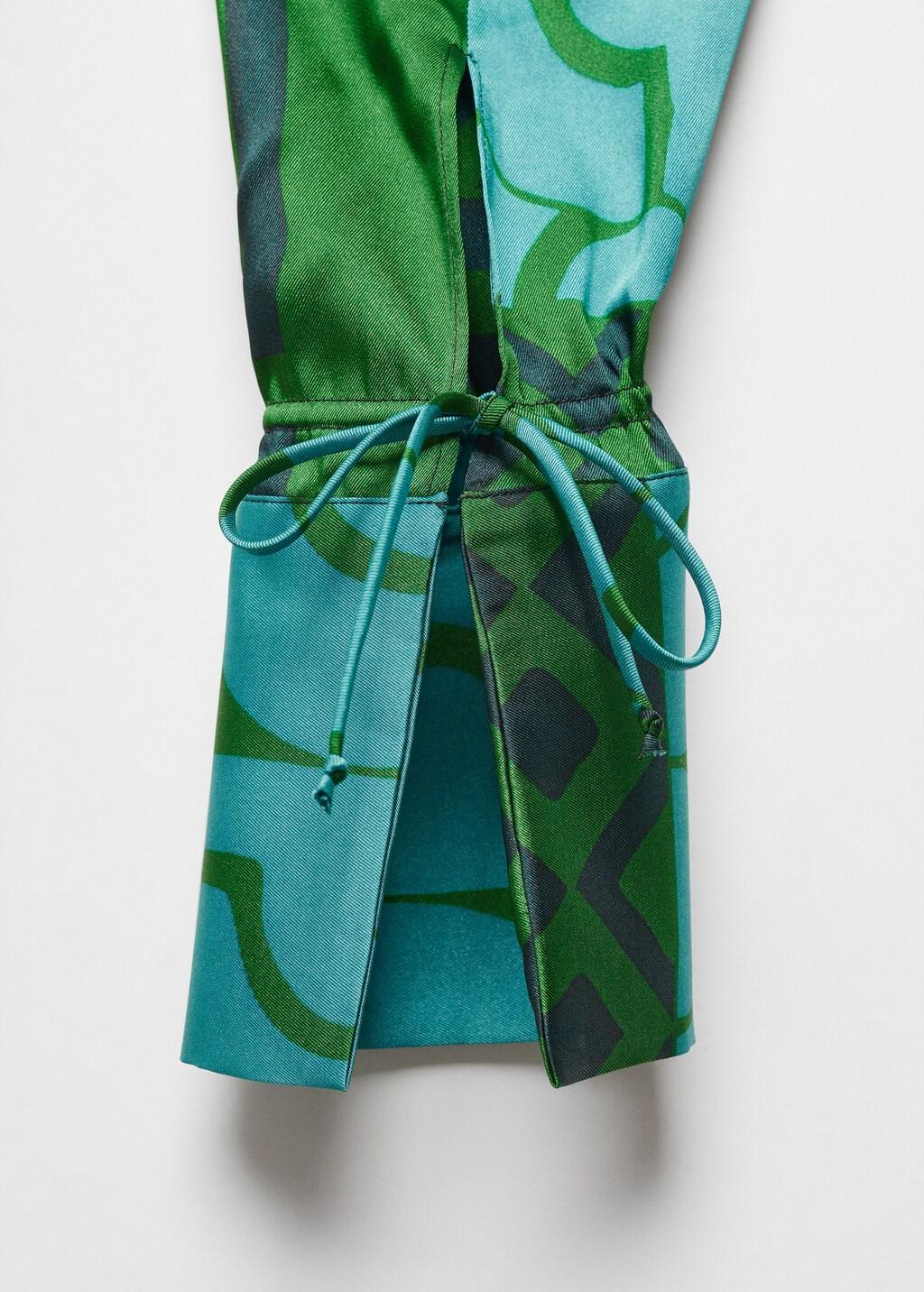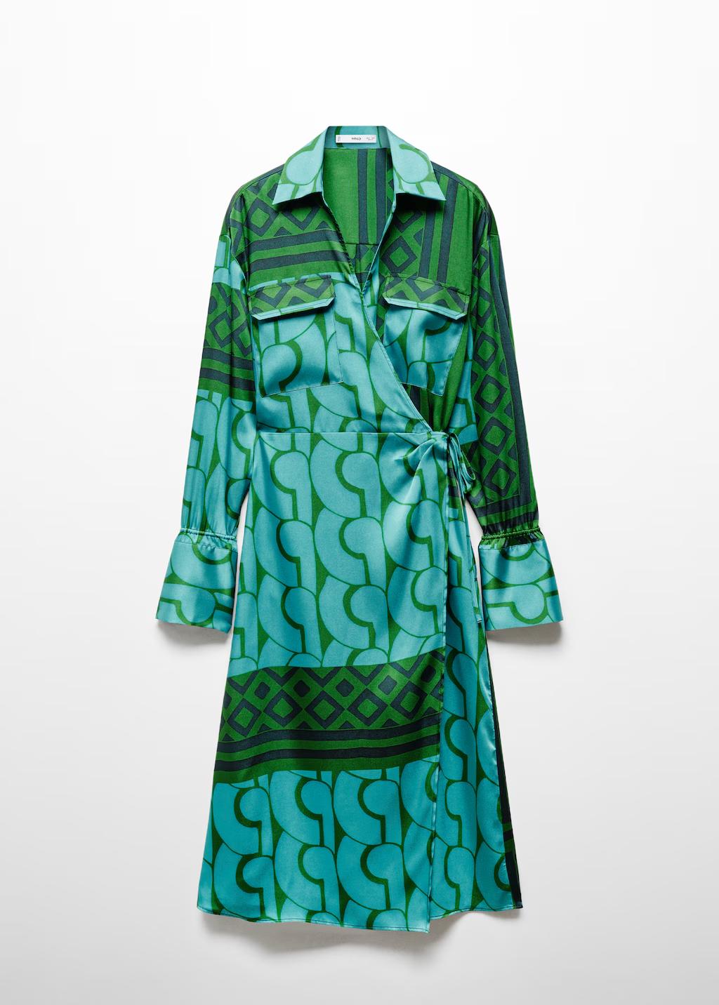 Tejido fluido. Diseño midi. Diseño evasé. Cuello camisero. Escote de pico cruzado. Manga larga. Cierre de lazo en los puños. Cierre de lazo lateral. Diseño estampado